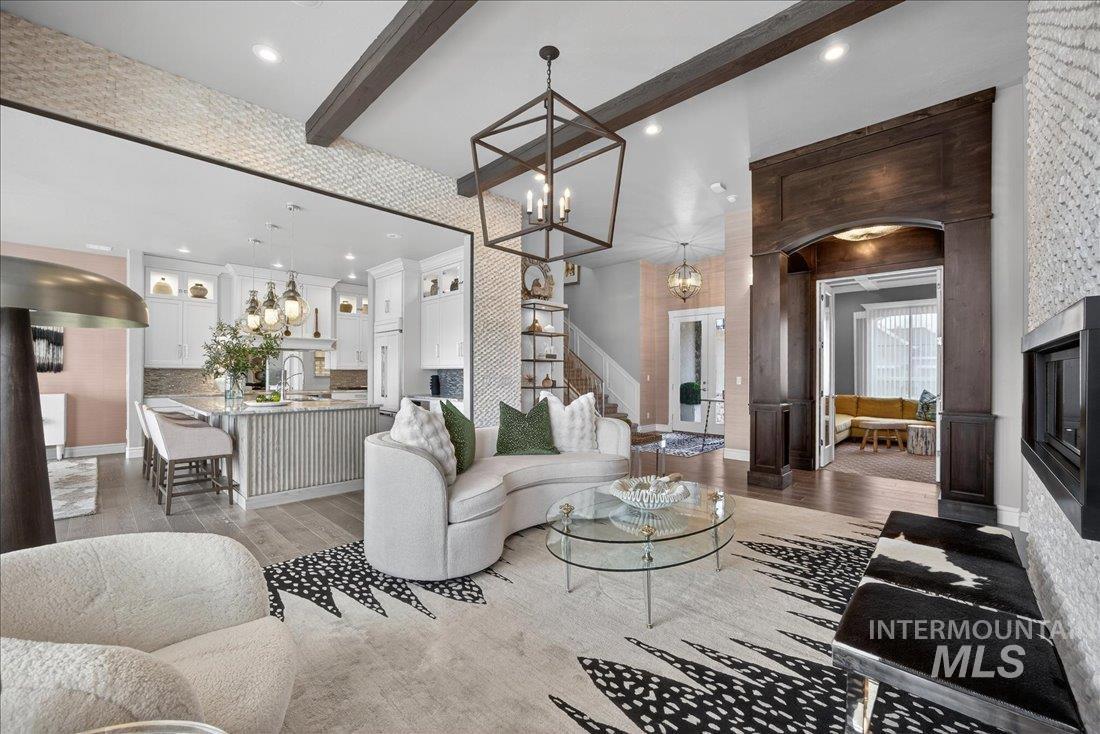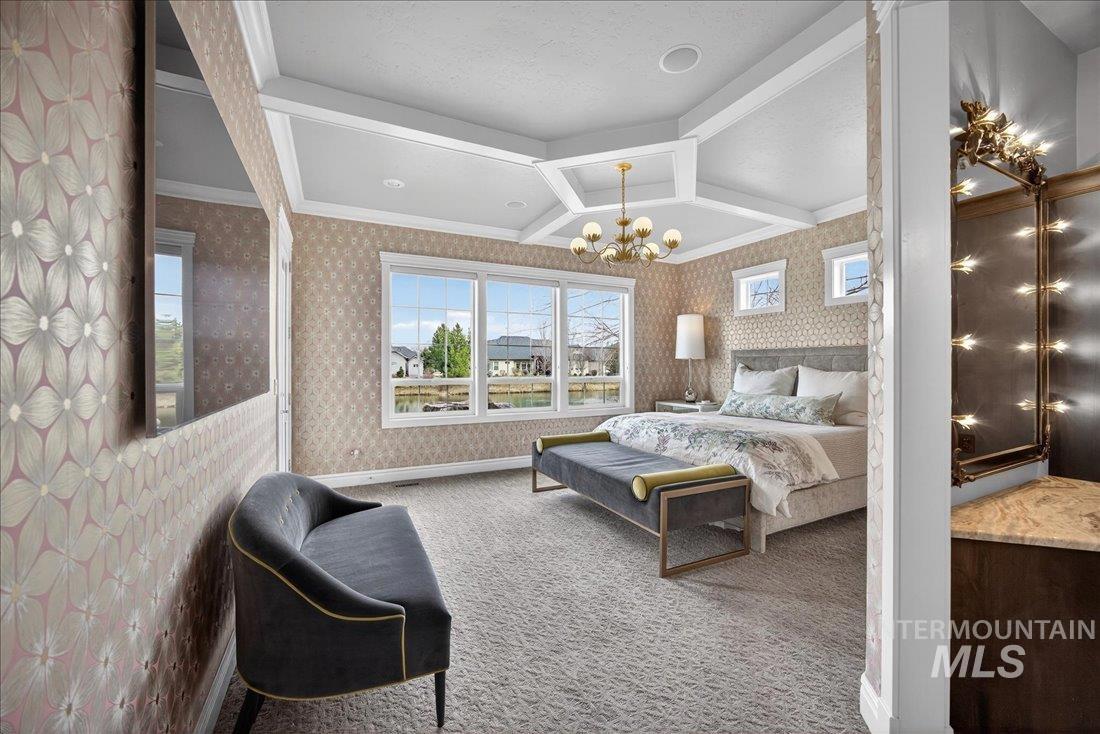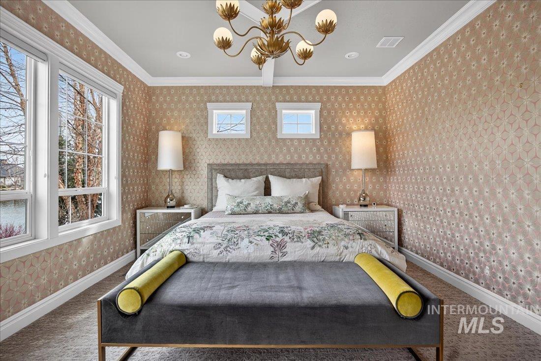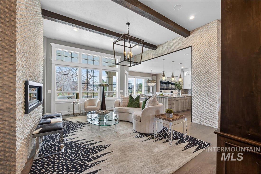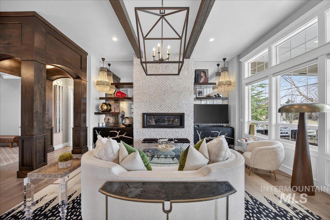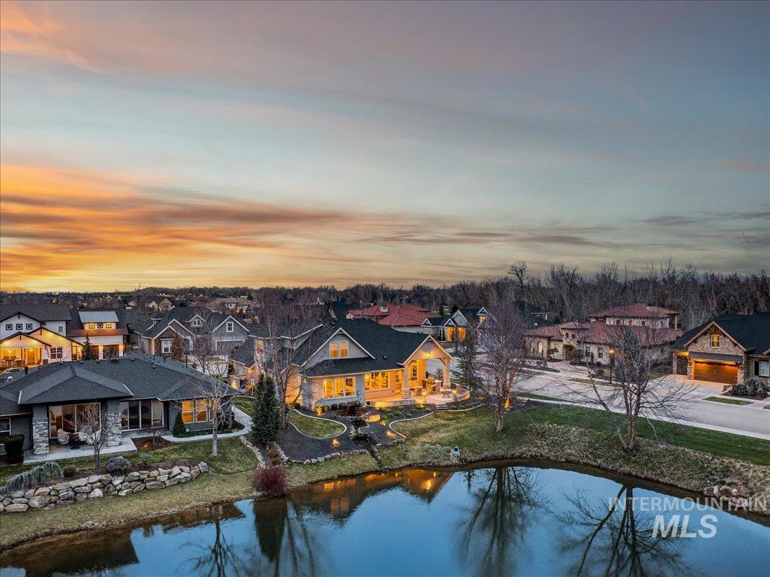 A one-of-a-kind designer waterfront estate in Mace River Ranch, perfectly poised on the pond with serene water views and Greenbelt/Boise River access. Every detail is meticulously curated, creating a home that feels straight from a fairytale. The great room, dining nook, and main-level primary suite take in peaceful waterfront views, while the flexible floorplan offers 4 bedrooms or 3 plus an office w/built ins and walk in closet. The spa-inspired primary bath features a freestanding soaking tub, tiled walk-in shower, dual vanities, sit-down vanity, and custom closet with built-in dressers. Open concept living flows seamlessly to a dream kitchen with new marble countertops, large island with storage on both sides, under-cabinet lighting, and top-of-the-line Bosch appliances including induction cooktop, double ovens, built-in KitchenAid refrigerator, & TRUE wine fridge. Main pantry includes a commercial refrigerator. The great room features custom cabinetry, floating shelves, and a dramatic floor-to-ceiling stone fireplace, w/designer lighting, grass cloth, stone accents, & elegant wall coverings throughout. Upstairs includes two bedrooms w/ Jack-and-Jill bath & spacious bonus room. Outside, the east-facing backyard boasts an outdoor kitchen, piano-shaped patio w/sandstone surround, year-round water feature, and tranquil pond setting. 3.5-car garage with built-ins and workbench.