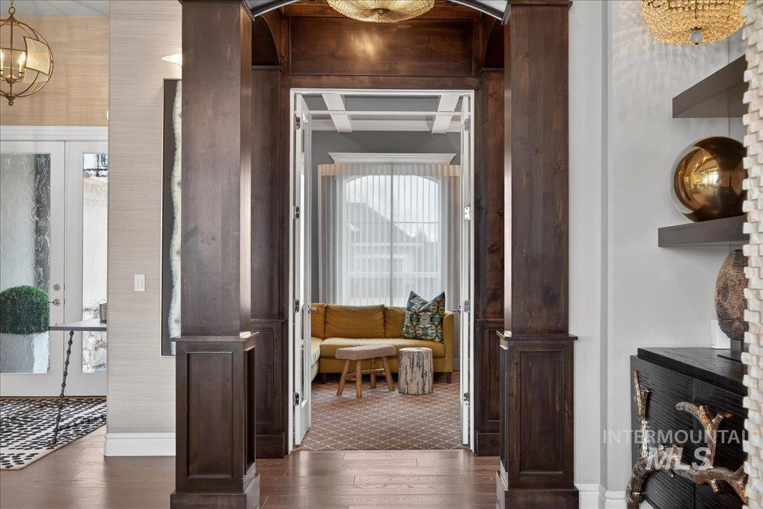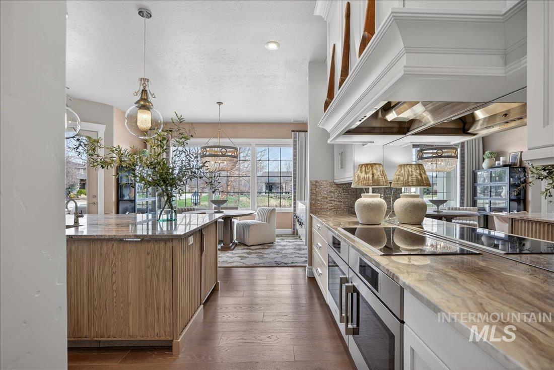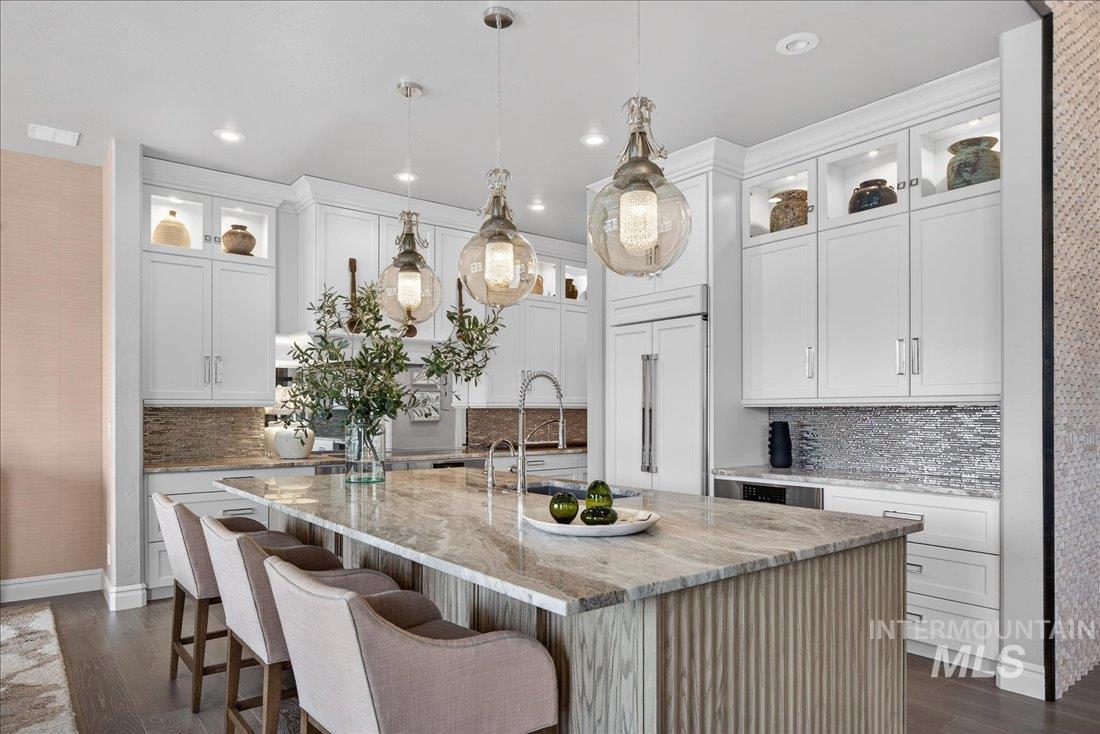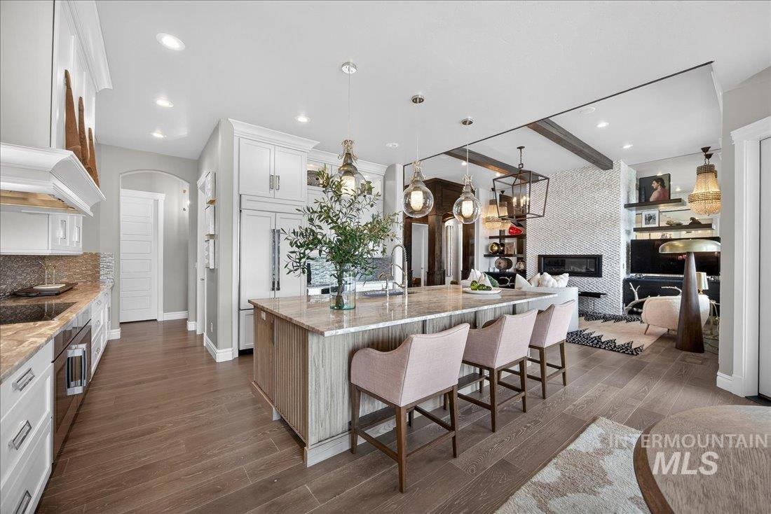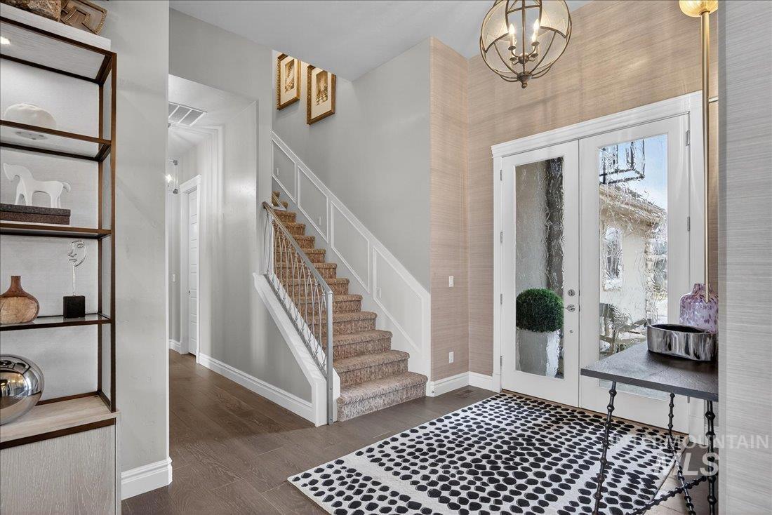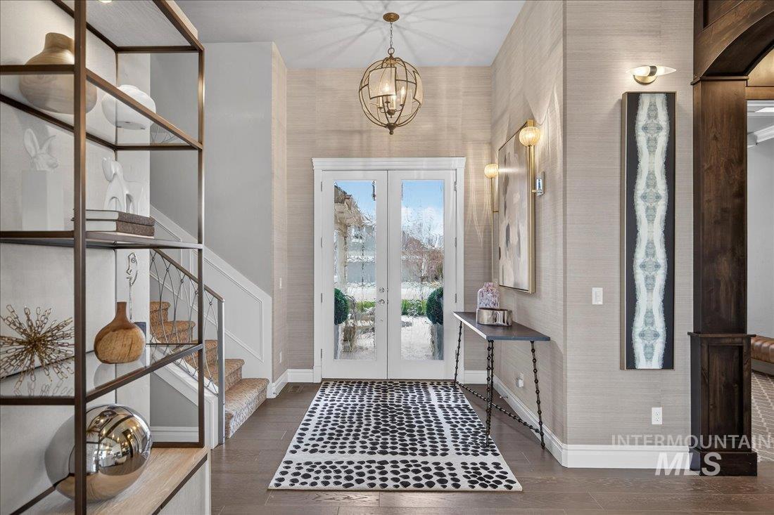 A one-of-a-kind designer waterfront estate in Mace River Ranch, perfectly poised on the pond with serene water views and Greenbelt/Boise River access. Every detail is meticulously curated, creating a home that feels straight from a fairytale. The great room, dining nook, and main-level primary suite take in peaceful waterfront views, while the flexible floorplan offers 4 bedrooms or 3 plus an office w/built ins and walk in closet. The spa-inspired primary bath features a freestanding soaking tub, tiled walk-in shower, dual vanities, sit-down vanity, and custom closet with built-in dressers. Open concept living flows seamlessly to a dream kitchen with new marble countertops, large island with storage on both sides, under-cabinet lighting, and top-of-the-line Bosch appliances including induction cooktop, double ovens, built-in KitchenAid refrigerator, & TRUE wine fridge. Main pantry includes a commercial refrigerator. The great room features custom cabinetry, floating shelves, and a dramatic floor-to-ceiling stone fireplace, w/designer lighting, grass cloth, stone accents, & elegant wall coverings throughout. Upstairs includes two bedrooms w/ Jack-and-Jill bath & spacious bonus room. Outside, the east-facing backyard boasts an outdoor kitchen, piano-shaped patio w/sandstone surround, year-round water feature, and tranquil pond setting. 3.5-car garage with built-ins and workbench.