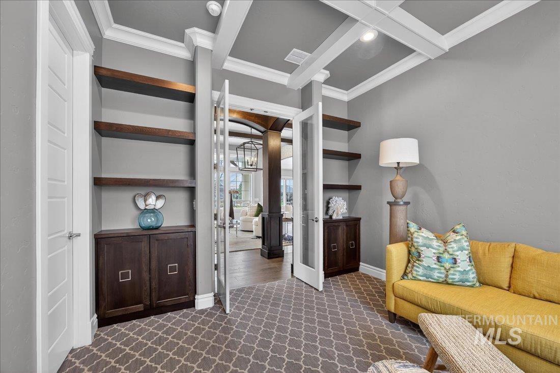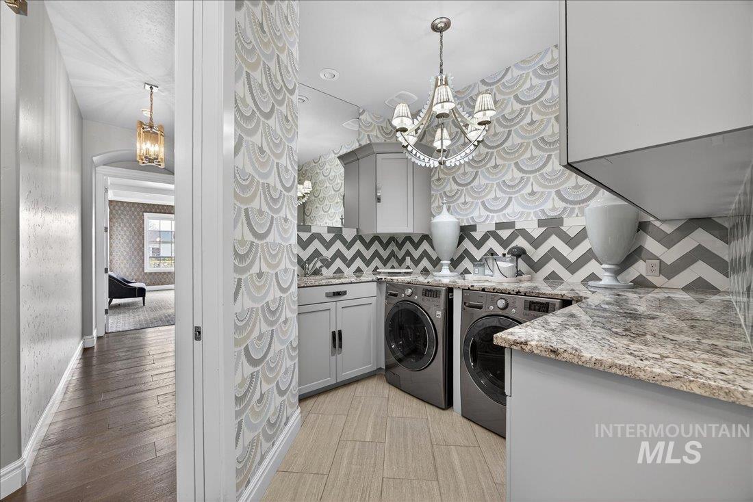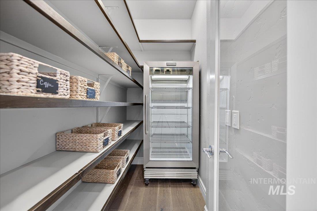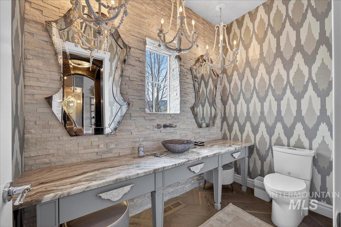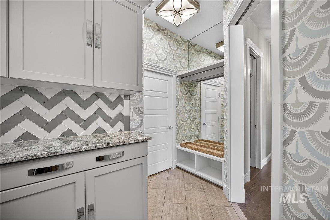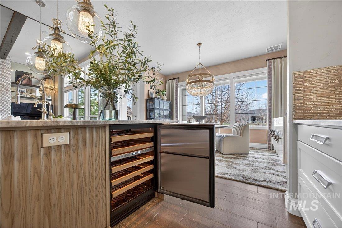 A one-of-a-kind designer waterfront estate in Mace River Ranch, perfectly poised on the pond with serene water views and Greenbelt/Boise River access. Every detail is meticulously curated, creating a home that feels straight from a fairytale. The great room, dining nook, and main-level primary suite take in peaceful waterfront views, while the flexible floorplan offers 4 bedrooms or 3 plus an office w/built ins and walk in closet. The spa-inspired primary bath features a freestanding soaking tub, tiled walk-in shower, dual vanities, sit-down vanity, and custom closet with built-in dressers. Open concept living flows seamlessly to a dream kitchen with new marble countertops, large island with storage on both sides, under-cabinet lighting, and top-of-the-line Bosch appliances including induction cooktop, double ovens, built-in KitchenAid refrigerator, & TRUE wine fridge. Main pantry includes a commercial refrigerator. The great room features custom cabinetry, floating shelves, and a dramatic floor-to-ceiling stone fireplace, w/designer lighting, grass cloth, stone accents, & elegant wall coverings throughout. Upstairs includes two bedrooms w/ Jack-and-Jill bath & spacious bonus room. Outside, the east-facing backyard boasts an outdoor kitchen, piano-shaped patio w/sandstone surround, year-round water feature, and tranquil pond setting. 3.5-car garage with built-ins and workbench.