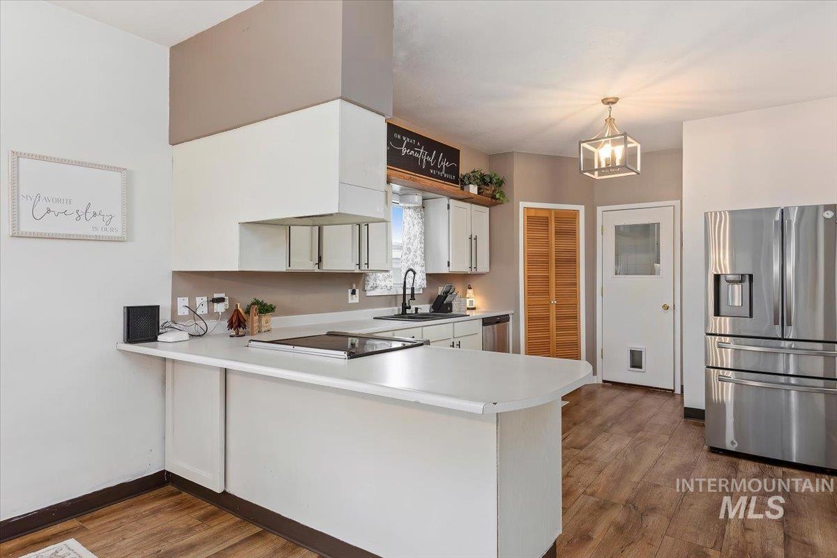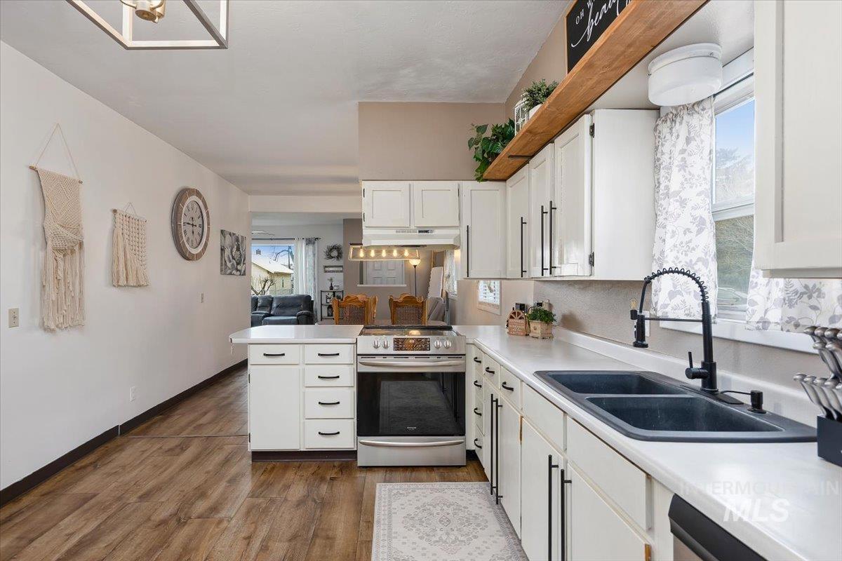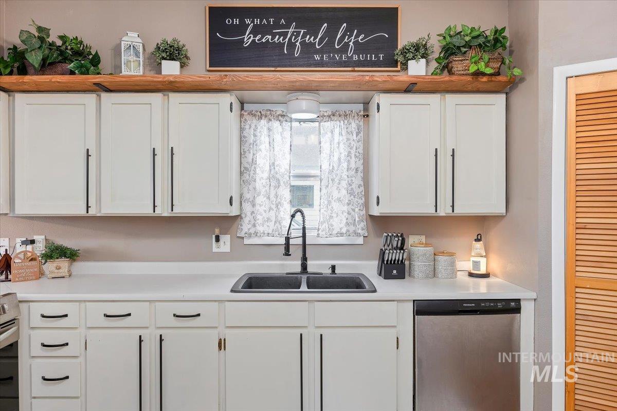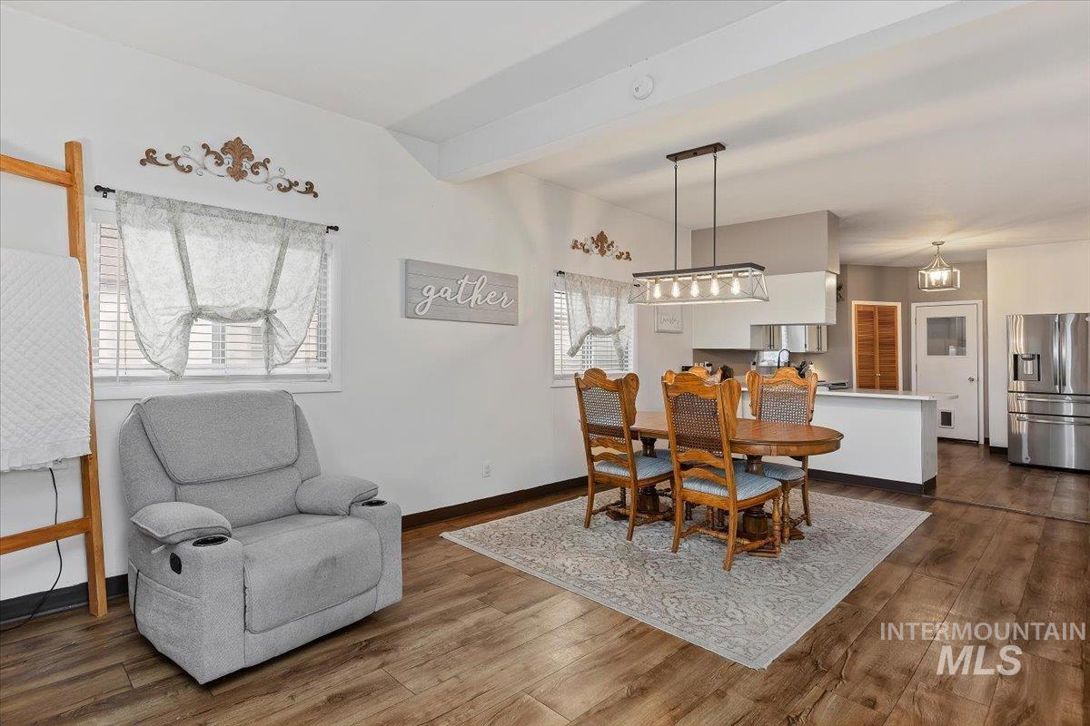 Exceptionally well-maintained 2-bedroom, 1-bath home offers 1,014 sq. ft. of comfortable living space with thoughtful updates throughout. Freshly painted and featuring new large front windows in an open concept living and dining room, the home feels large, bright, welcoming, and move-in ready. The functional kitchen includes a pantry with appliance plug ins for added convince a large breakfast bar, new stove, dishwasher, and disposal. A separate laundry area adds convenience and helps keep the living spaces organized. This home also features an additional 75-gallon hot water tank, providing extra capacity for everyday needs. Outside, the .14-acre lot offers excellent usability with RV parking, alley access, and a large fully fenced backyard. A storage shed and additional Large bully barn outbuilding providing additional space for tools, hobbies, or extra storage. The yard allows room for gardening, outdoor gatherings, or simply enjoying the open space.