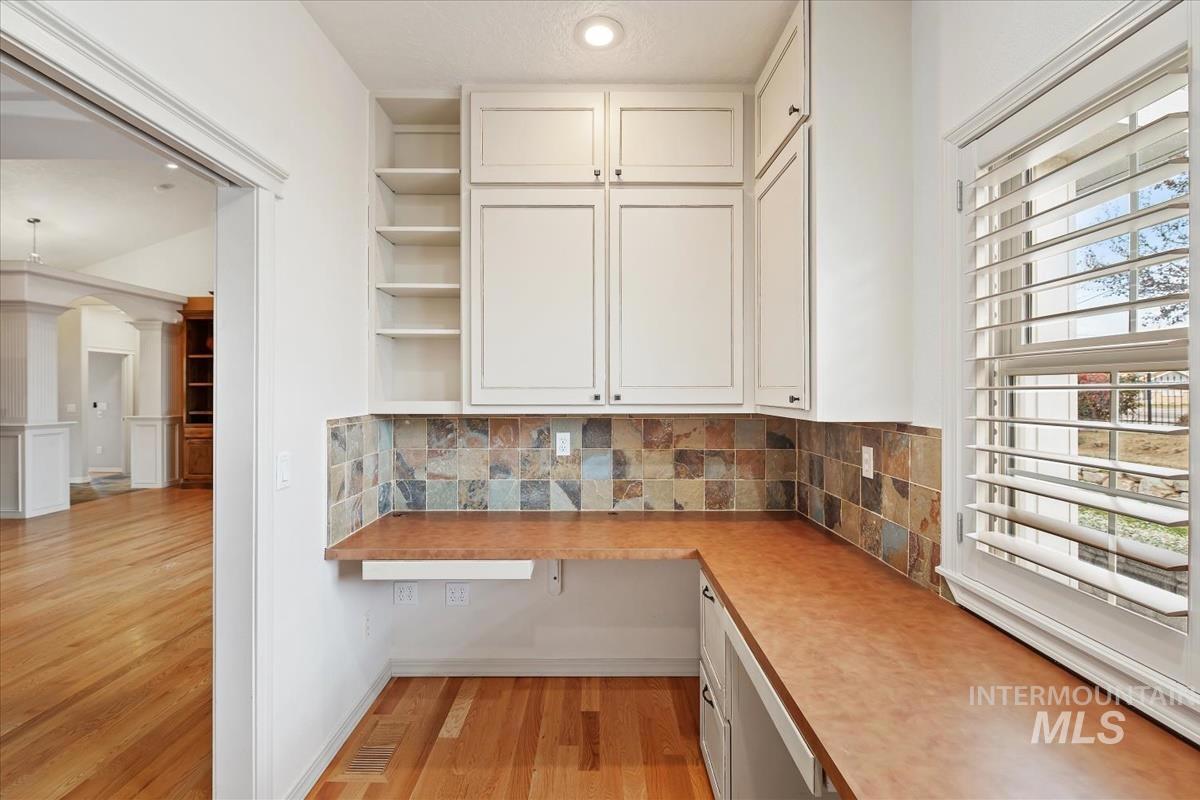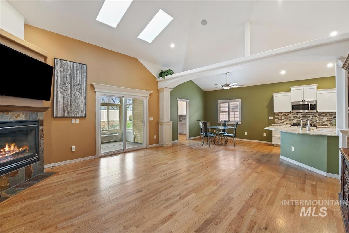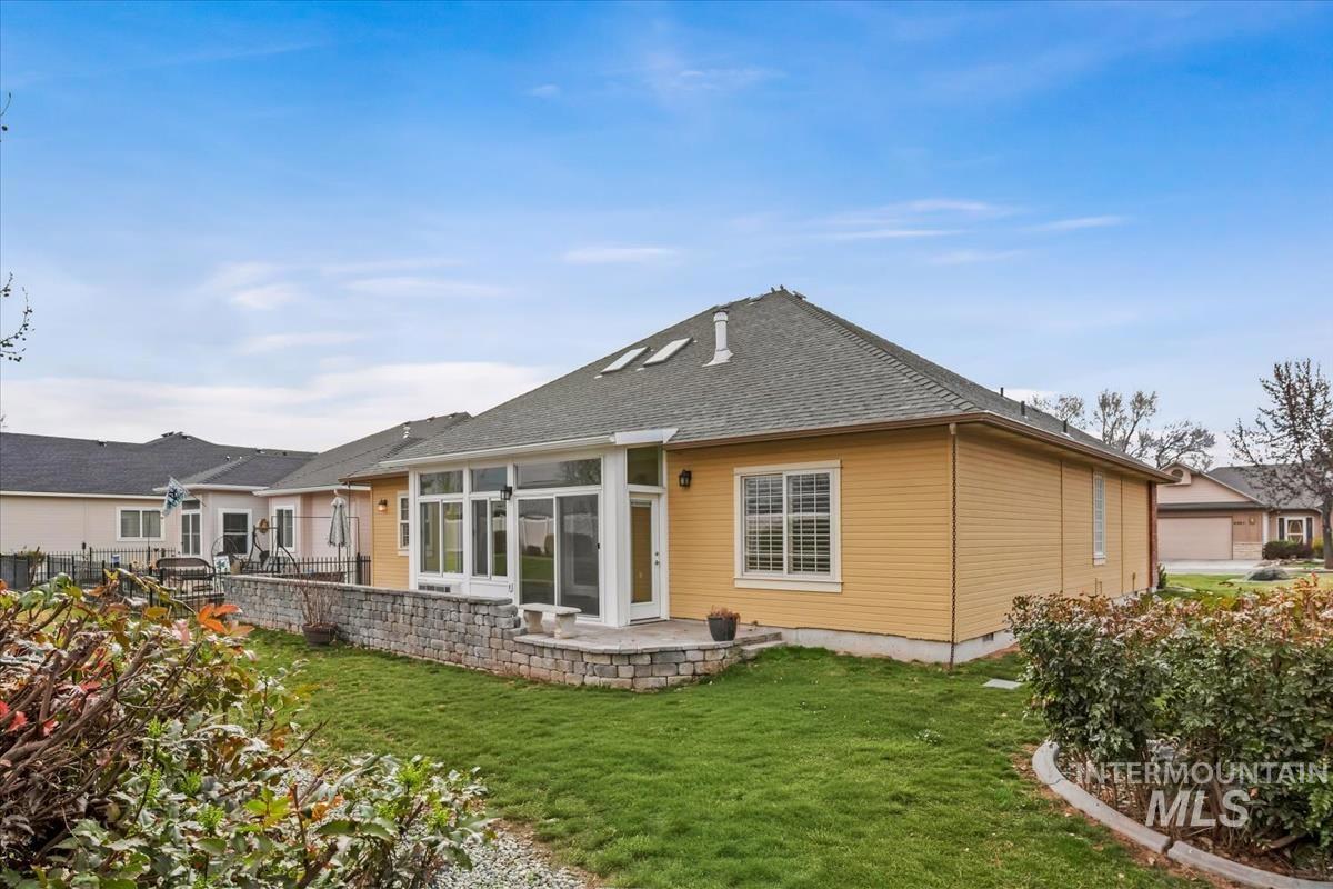 Tucked inside the gated Greens at Ridgecrest community, just moments from the fairways of Centennial Golf Course, this inviting home offers character and privacy. Inside, the spacious great room is filled with natural light thanks to skylights and soaring vaulted ceilings, while hardwood floors and classic plantation shutters add warmth and timeless style. The well-appointed kitchen features granite countertops, a convenient breakfast bar, and stainless steel appliances. Just off the kitchen is a functional office nook complete with extensive built-in cabinetry and a large desk, providing an ideal space for working from home or staying organized. The primary suite is a relaxing retreat with a vaulted ceiling, walk-in closet, and private access to the sunroom. The ensuite bathroom includes dual vanities and a jetted soaker tub. The secondary bedroom also features vaulted ceilings, a walk-in closet, and direct access to the second bathroom. A spacious sunroom with its own AC unit provides year-round enjoyment and overlooks the backyard creating the perfect spot to relax or entertain.