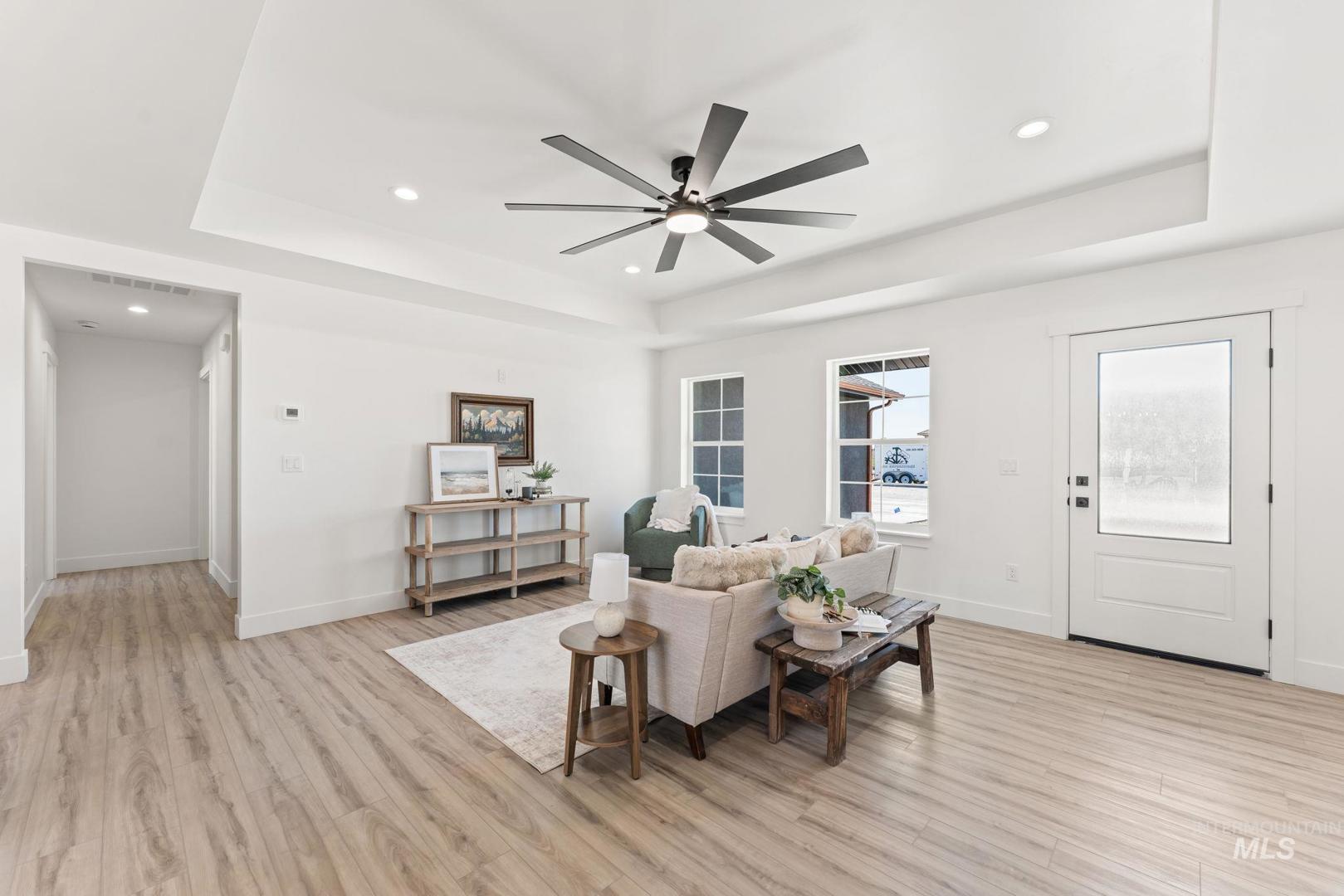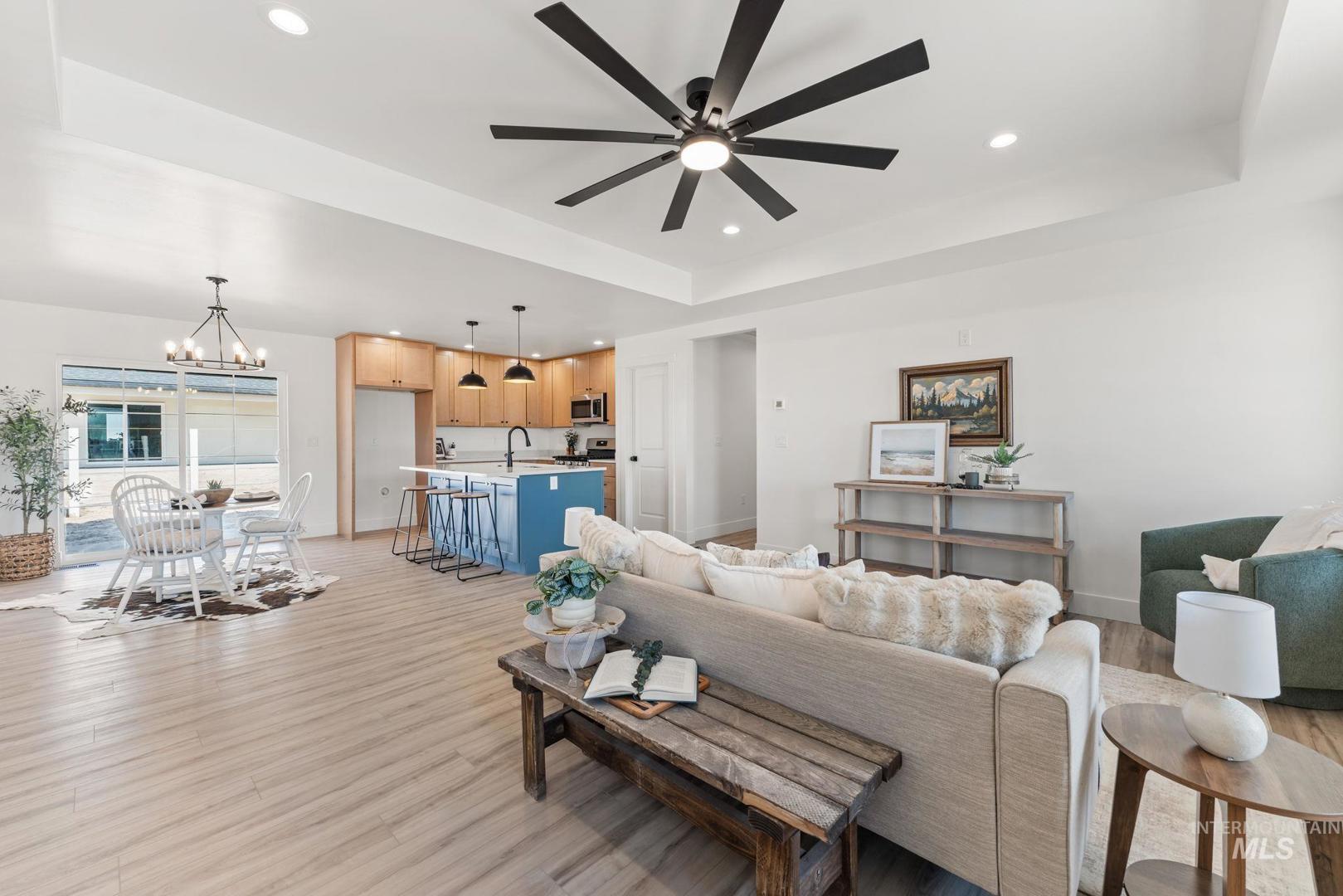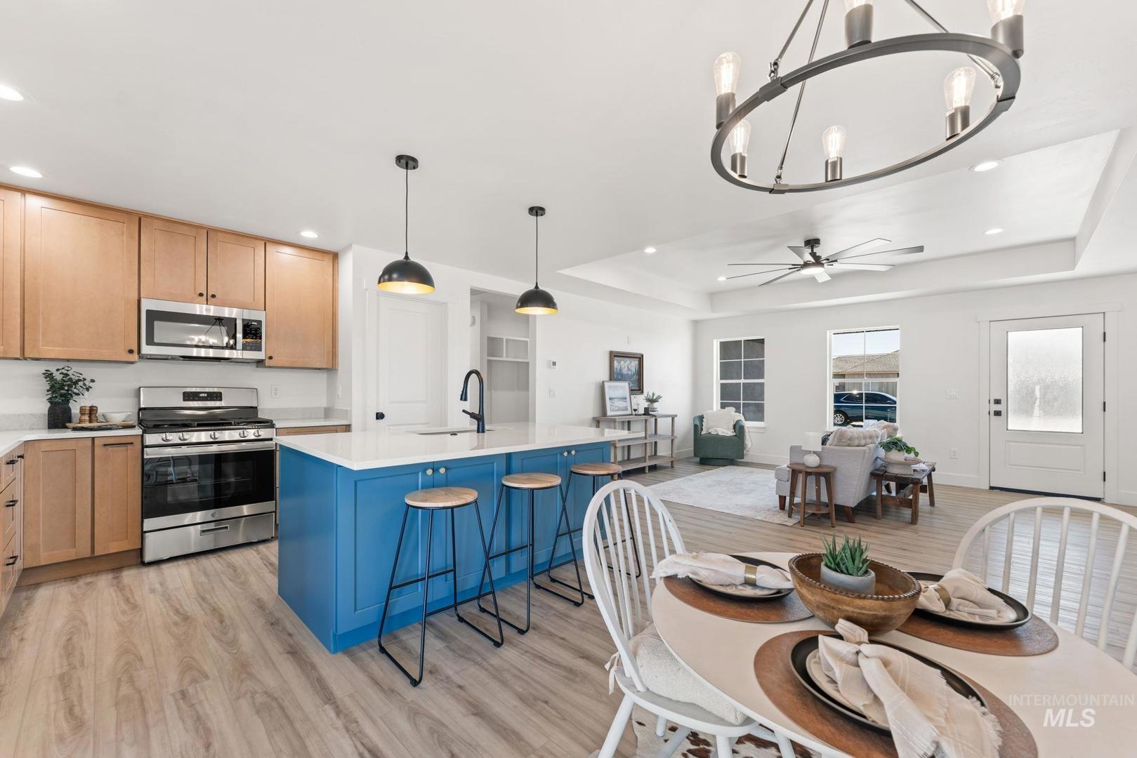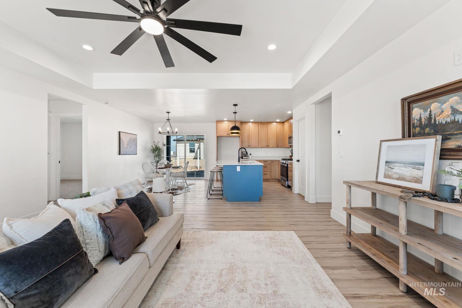 Welcome home to this stunning brand-new construction in Jerome! This thoughtfully designed single-level home offers the ease of main floor living with a bright, open-concept layout that seamlessly connects the living room, dining area, and kitchen, perfect for everyday living and entertaining. The chef-inspired kitchen features warm cabinetry, a bold blue island with bar seating, stainless steel appliances, and sleek pendant lighting. The spacious living area boasts a dramatic tray ceiling, oversized statement fan, and luxury vinyl plank flooring throughout. With 3 bedrooms, 2 bathrooms, and quality finishes from top to bottom, this home checks every box. Step outside to a fully landscaped and fully fenced yard, ready for you to enjoy from day one. Don`t miss your chance to own a move-in ready gem in the heart of Jerome!