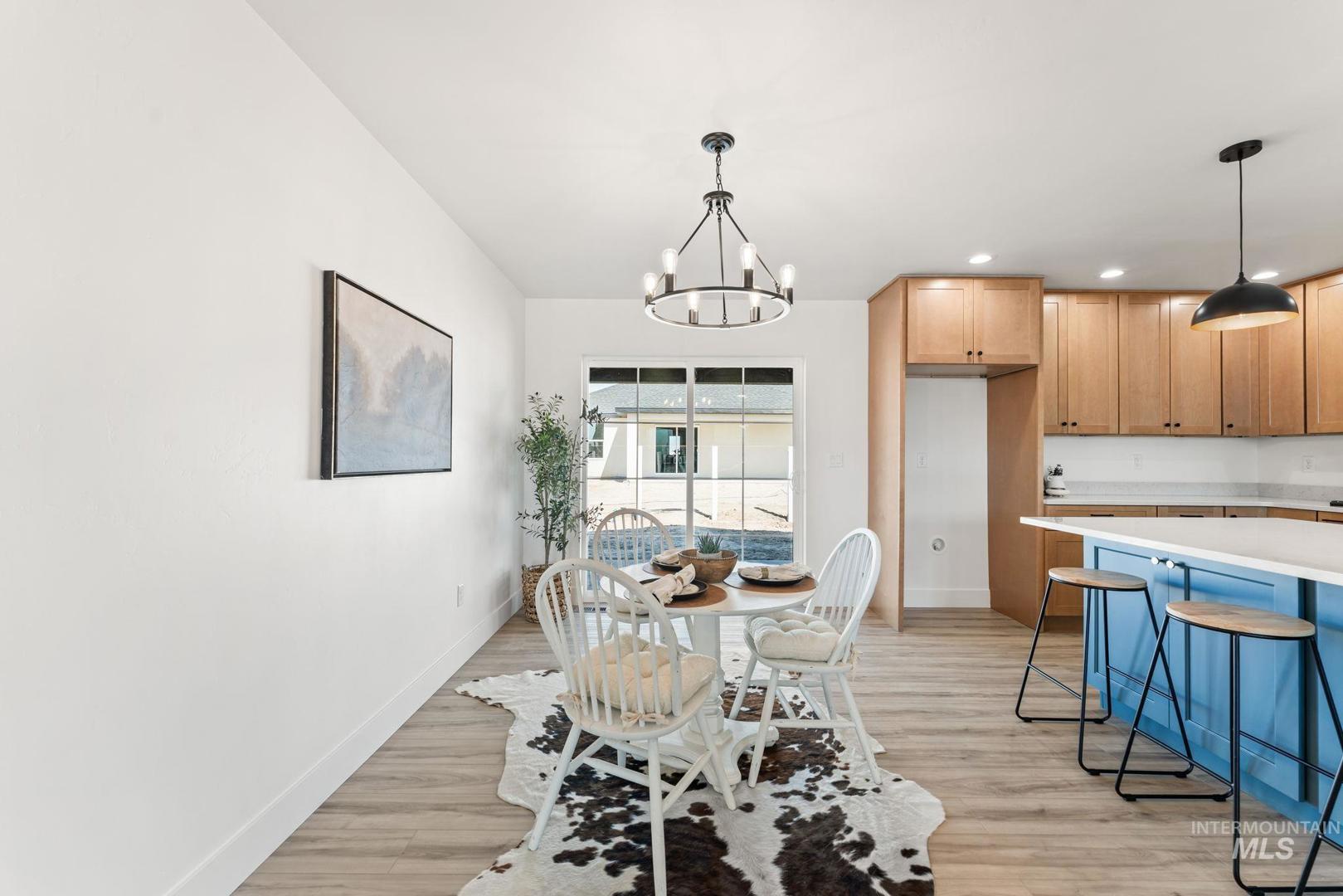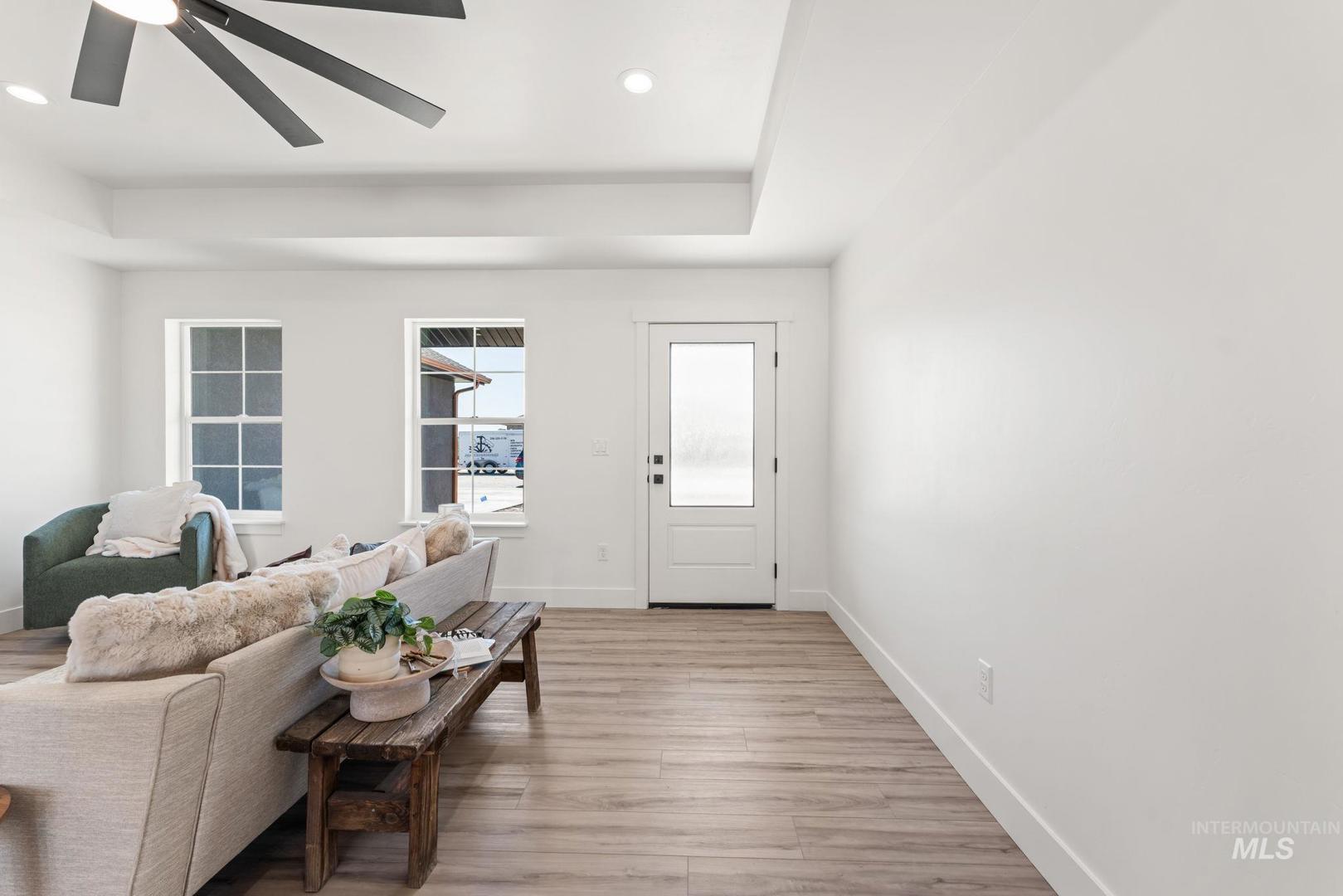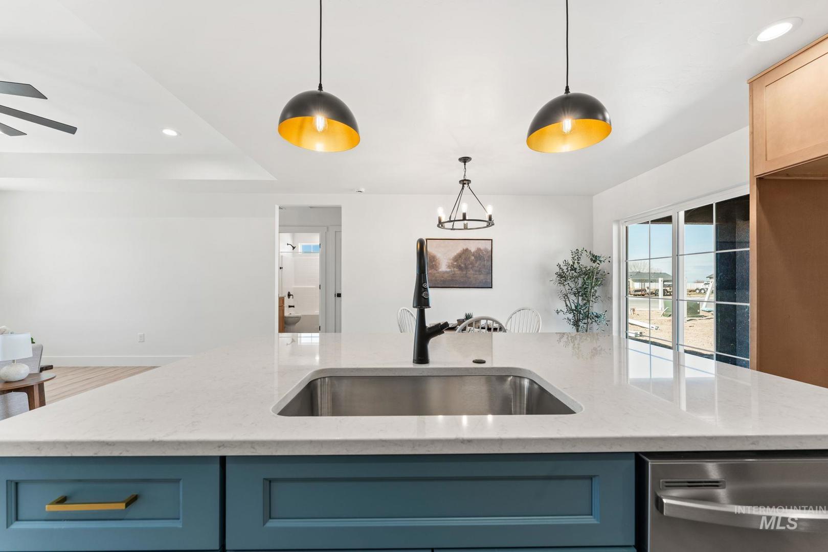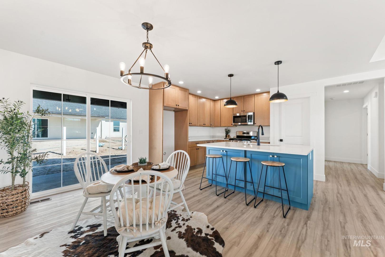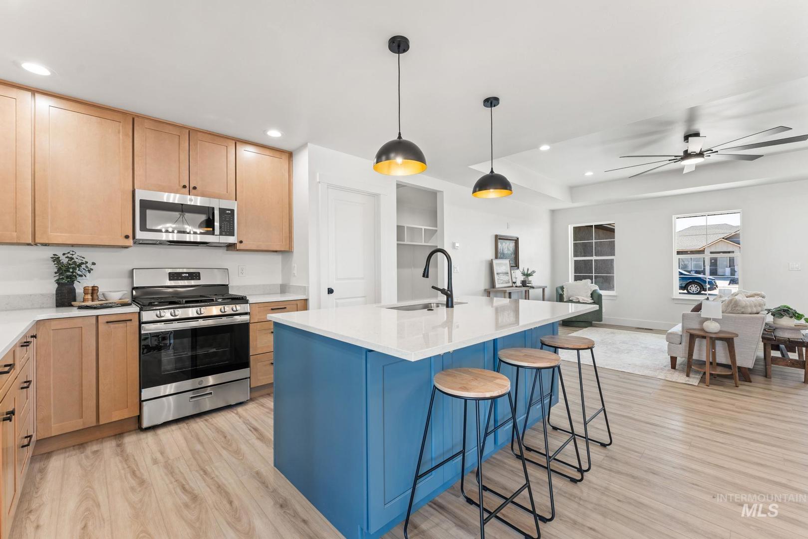 Welcome home to this stunning brand-new construction in Jerome! This thoughtfully designed single-level home offers the ease of main floor living with a bright, open-concept layout that seamlessly connects the living room, dining area, and kitchen, perfect for everyday living and entertaining. The chef-inspired kitchen features warm cabinetry, a bold blue island with bar seating, stainless steel appliances, and sleek pendant lighting. The spacious living area boasts a dramatic tray ceiling, oversized statement fan, and luxury vinyl plank flooring throughout. With 3 bedrooms, 2 bathrooms, and quality finishes from top to bottom, this home checks every box. Step outside to a fully landscaped and fully fenced yard, ready for you to enjoy from day one. Don`t miss your chance to own a move-in ready gem in the heart of Jerome!