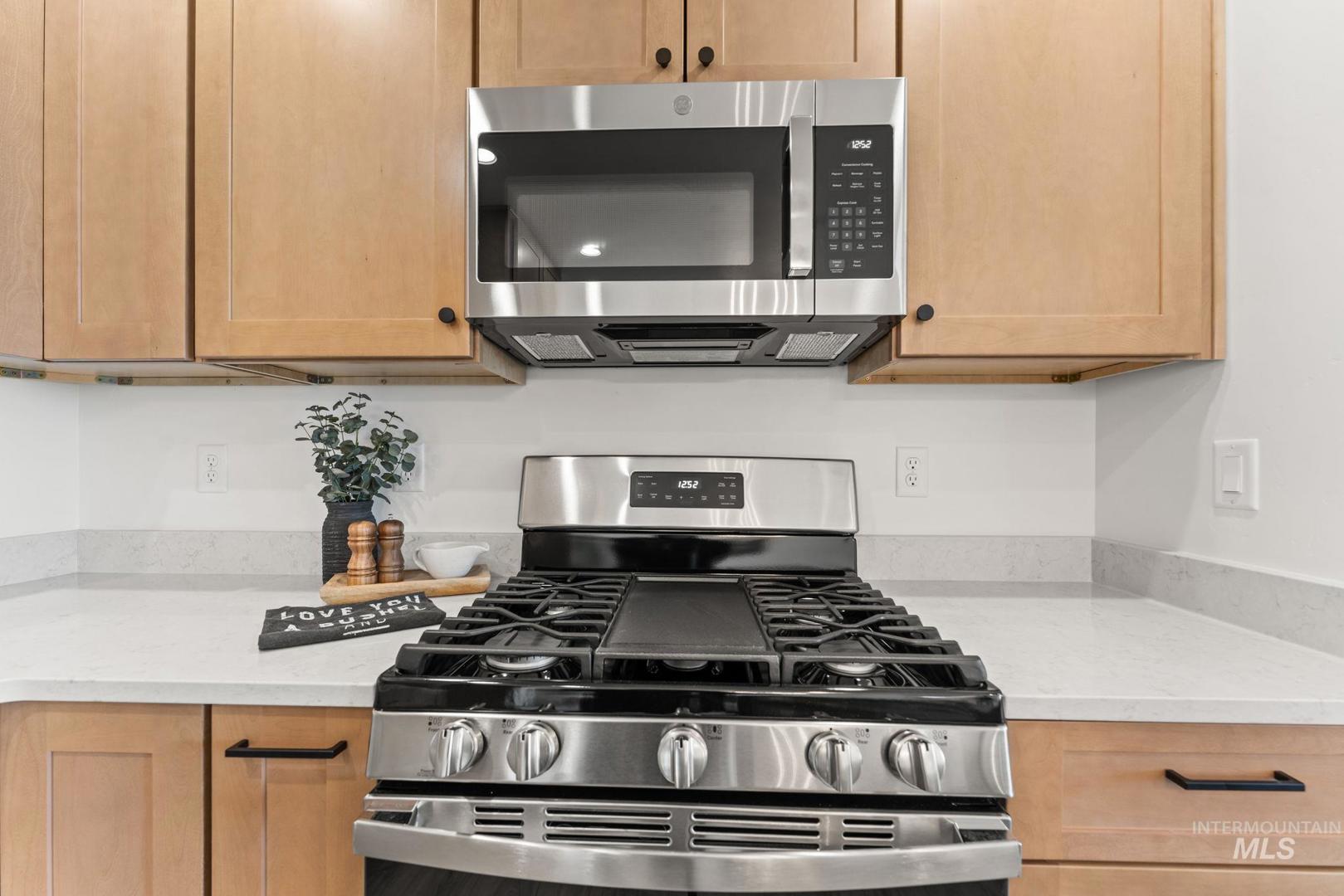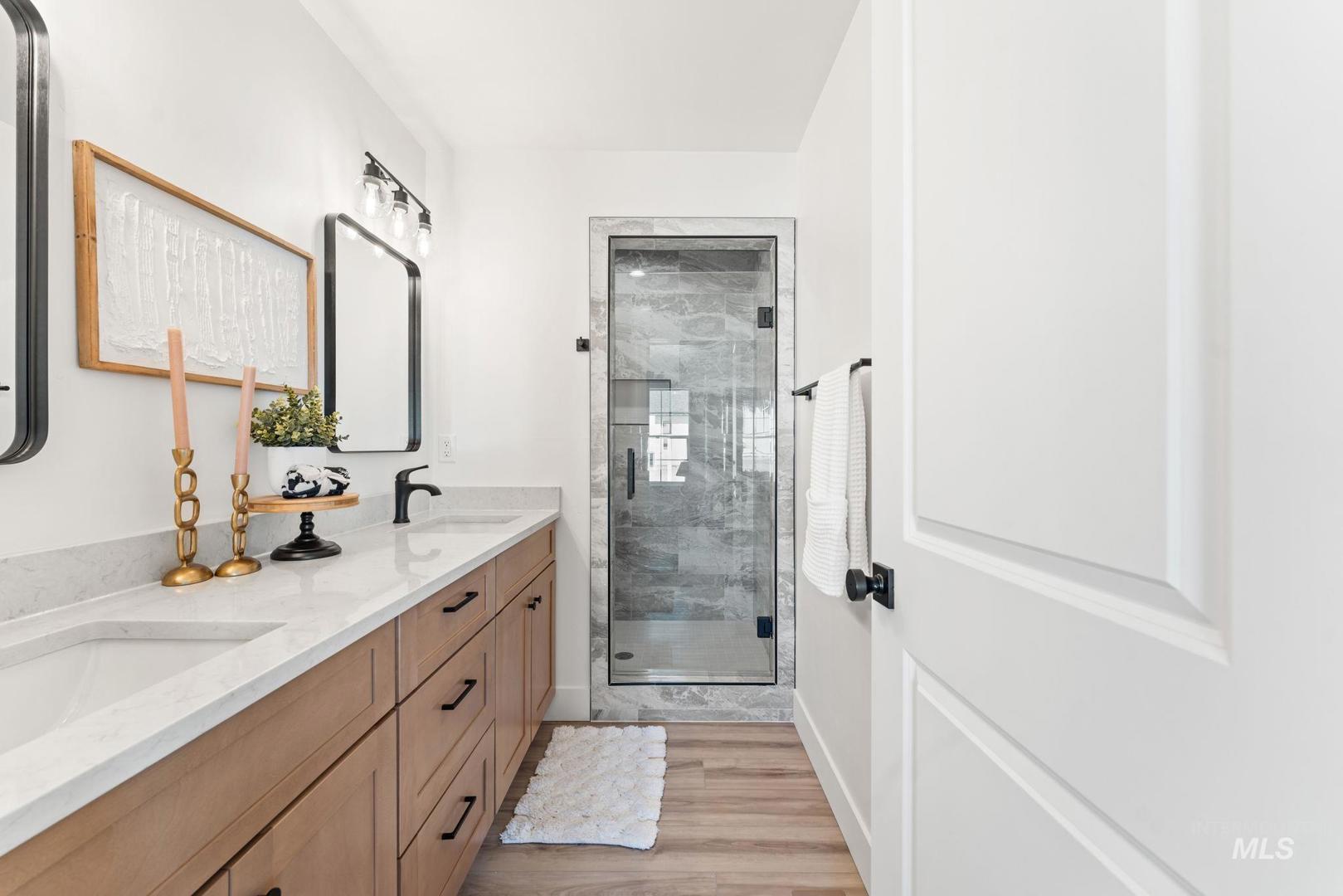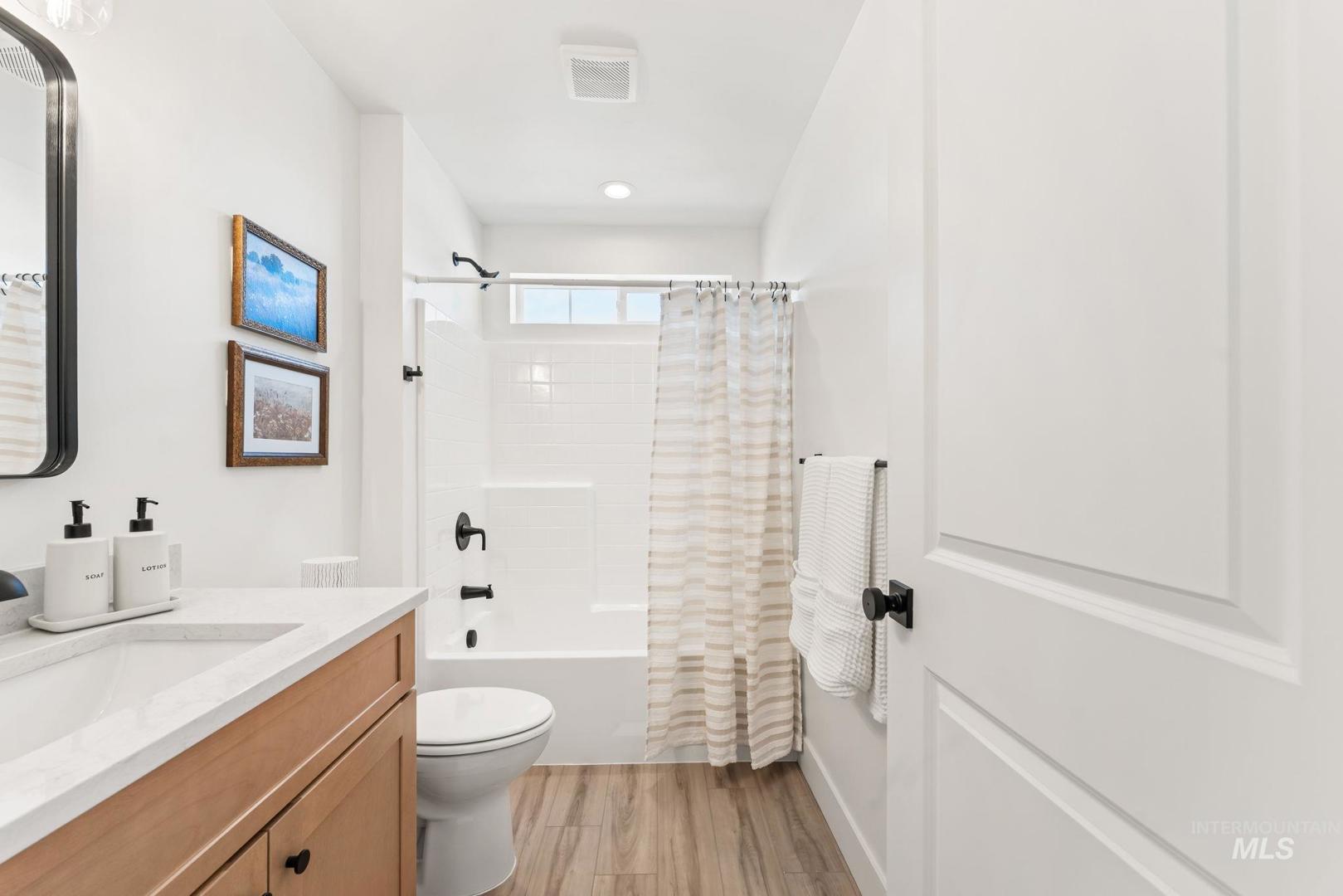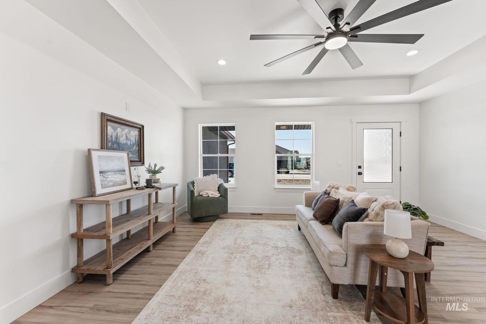 Welcome home to this stunning brand-new construction in Jerome! This thoughtfully designed single-level home offers the ease of main floor living with a bright, open-concept layout that seamlessly connects the living room, dining area, and kitchen, perfect for everyday living and entertaining. The chef-inspired kitchen features warm cabinetry, a bold blue island with bar seating, stainless steel appliances, and sleek pendant lighting. The spacious living area boasts a dramatic tray ceiling, oversized statement fan, and luxury vinyl plank flooring throughout. With 3 bedrooms, 2 bathrooms, and quality finishes from top to bottom, this home checks every box. Step outside to a fully landscaped and fully fenced yard, ready for you to enjoy from day one. Don`t miss your chance to own a move-in ready gem in the heart of Jerome!