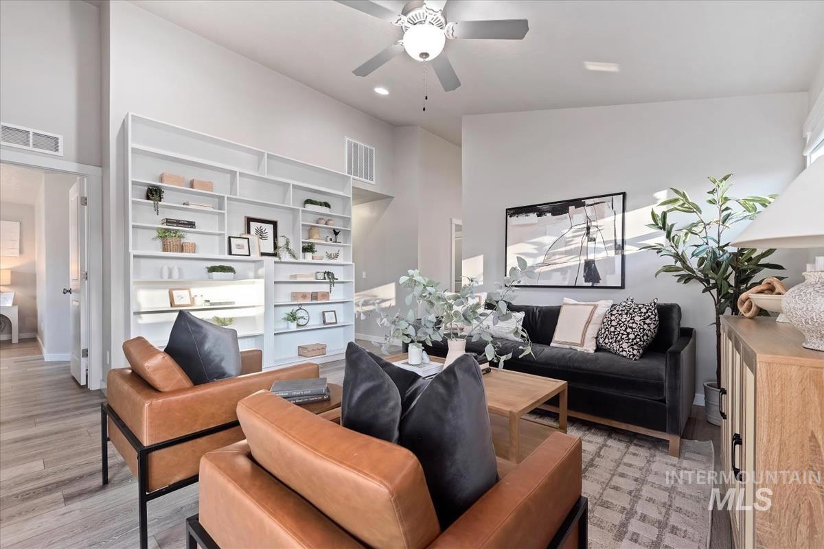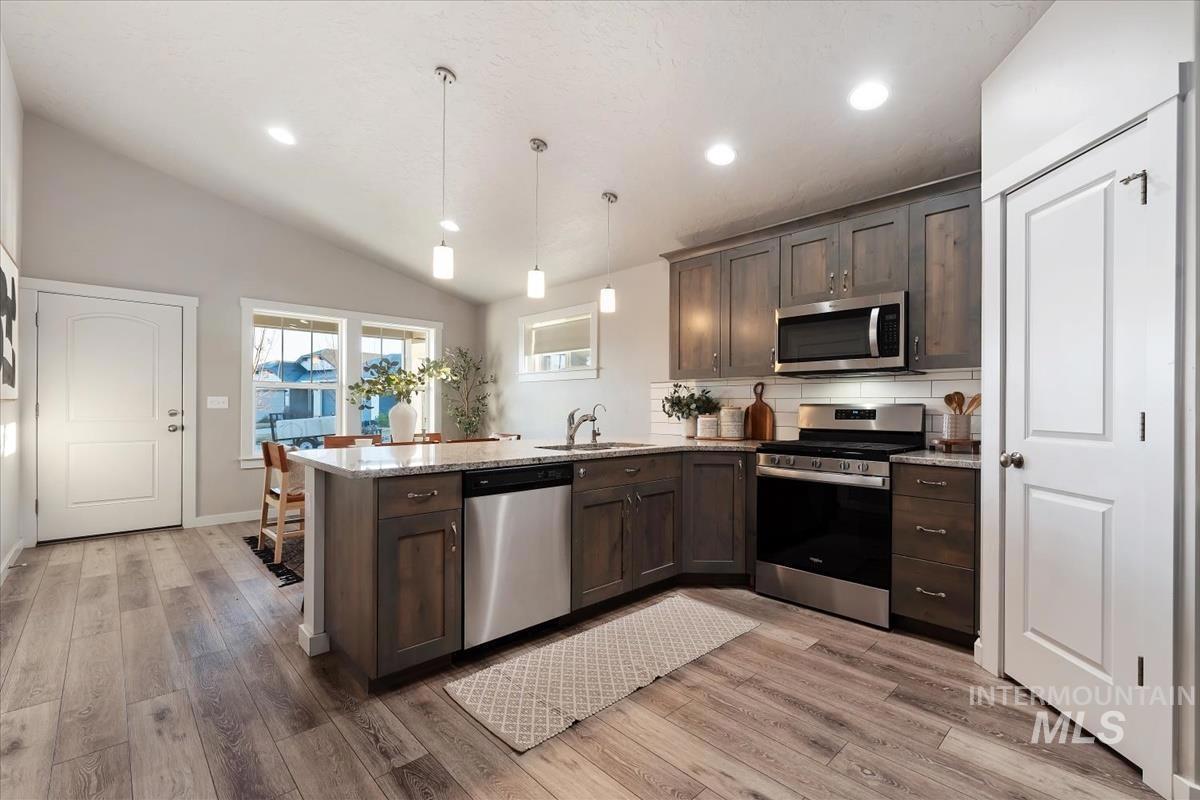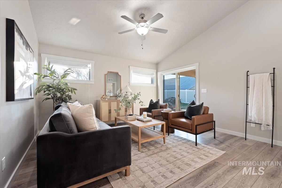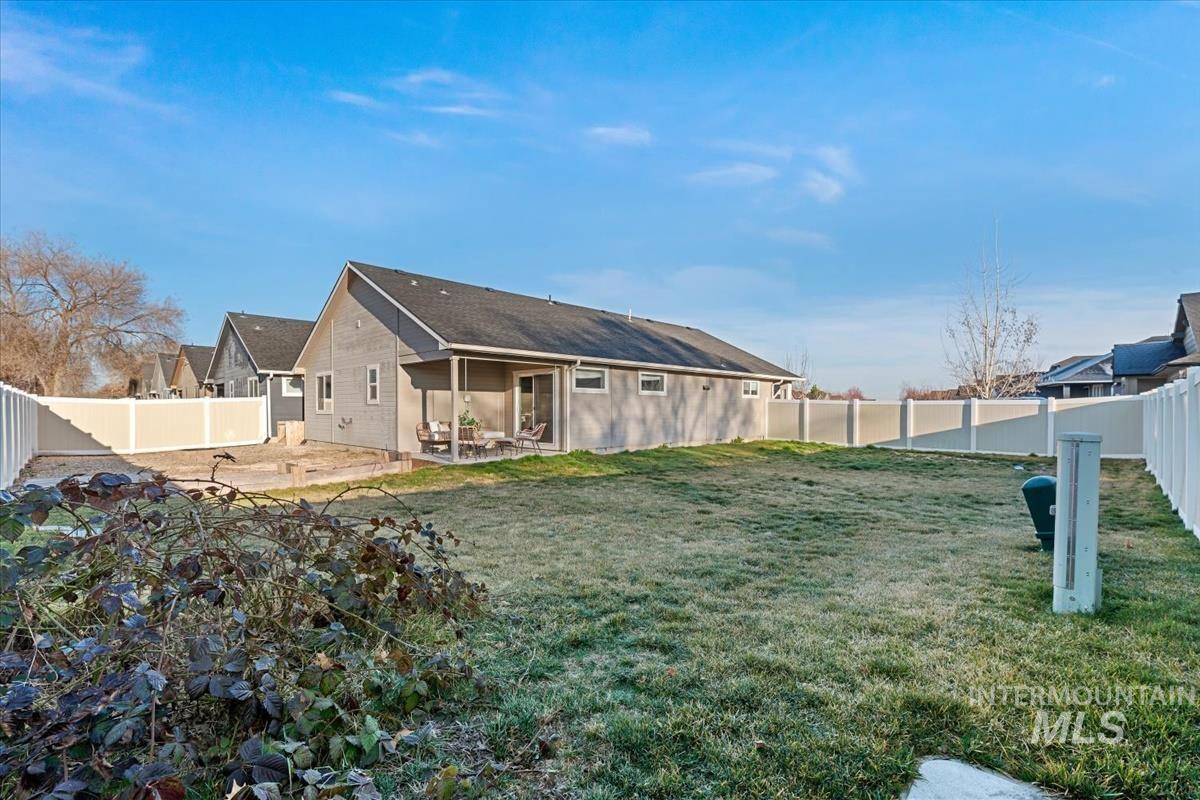 Fabulous single level home on 2 lots with LVP flooring throughout! Step inside to be welcomed by a vaulted ceiling & beautiful open kitchen. The breakfast bar, gas range, pantry, stainless steel appliances, granite countertops & full tile backsplash make spending time in the kitchen a treat! The living room offers a ceiling fan plus extensive built in shelving & entertainment area. You`ll appreciate the master bedroom & bathroom-complete with a raised height dual vanity, walk in shower & walk in closet! Head outside to BBQ under your covered patio, relax around your fire pit, pick blackberries, garden in the raised garden beds, or play yard games in your east facing spacious backyard! This home is filled with upgraded features including ceiling fans in all bedrooms, no carpet or vinyl flooring, a tankless water heater & a reverse osmosis system under the kitchen sink. Irrigation is included in your HOA dues. Professionally cleaned & able to accommodate a quick closing!