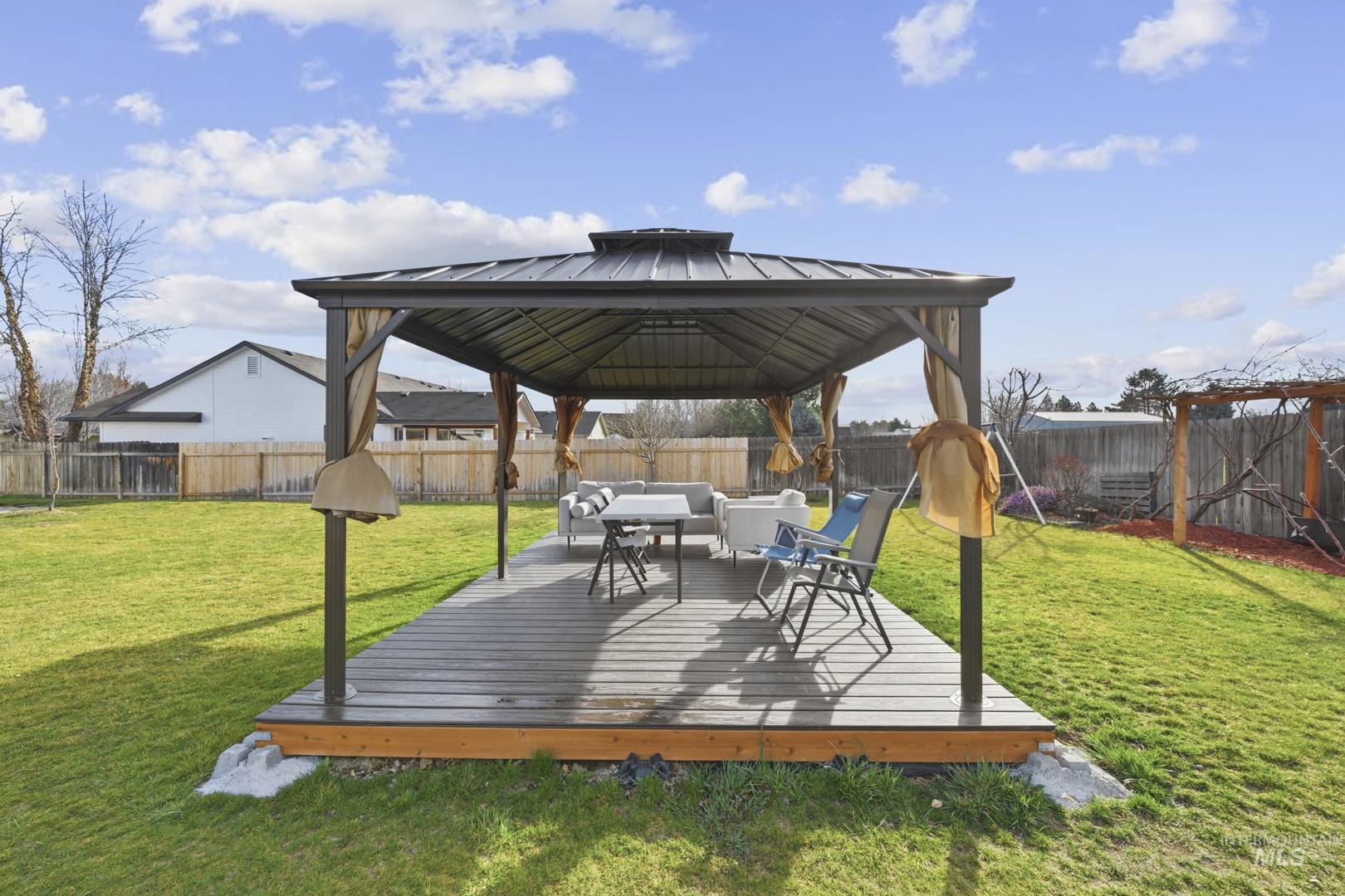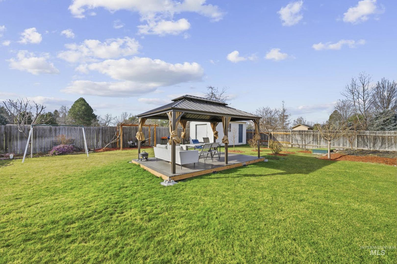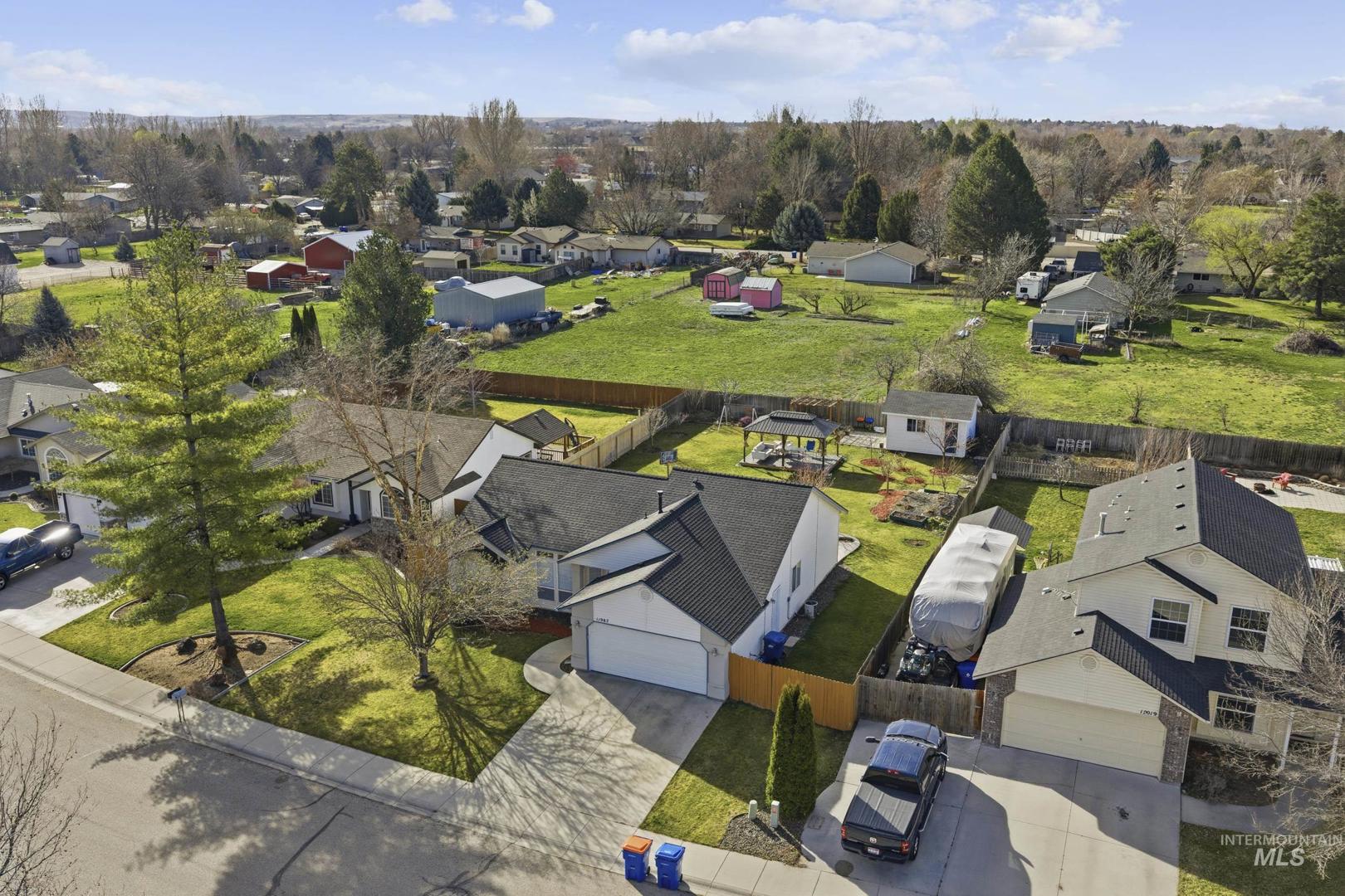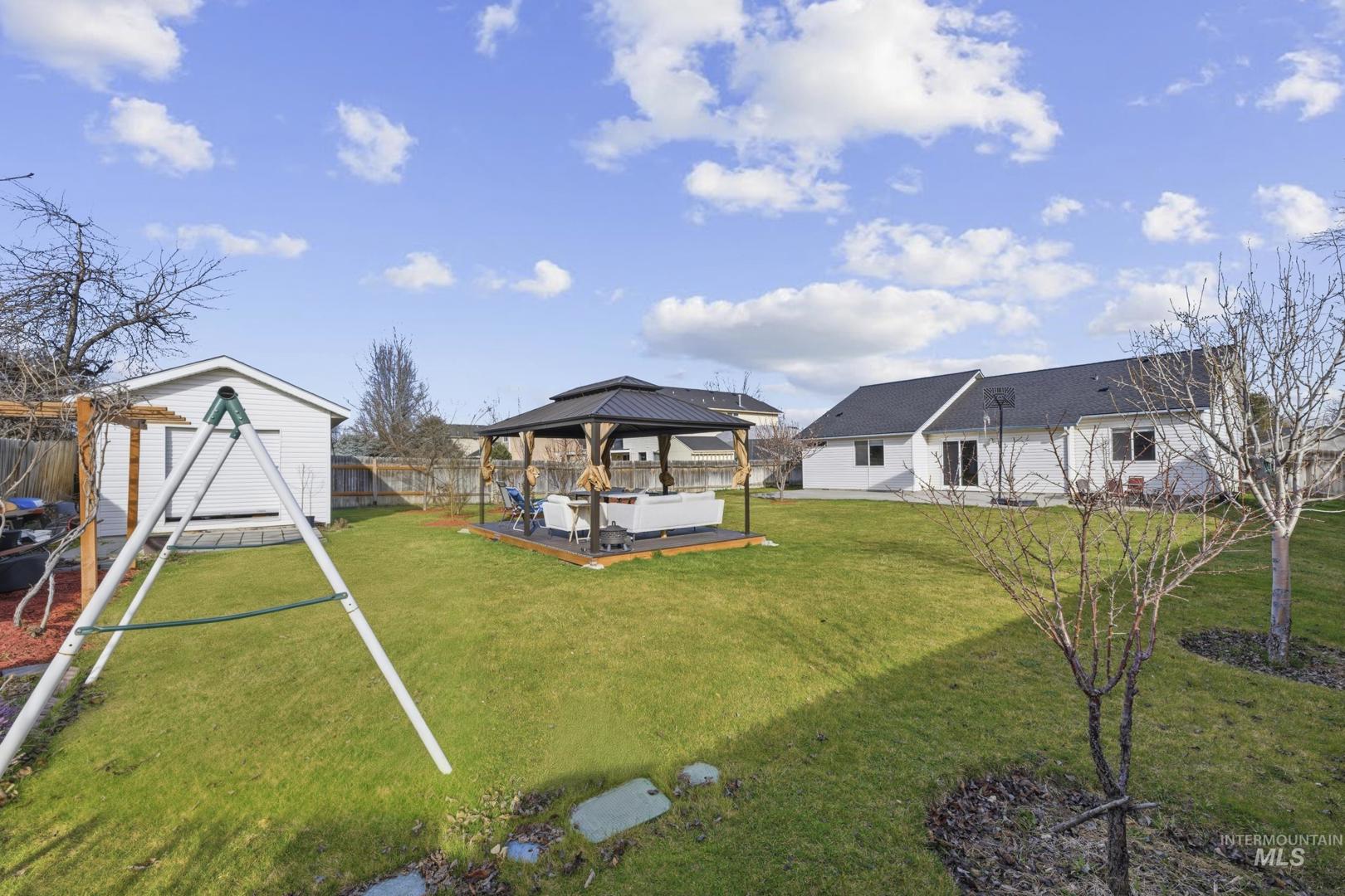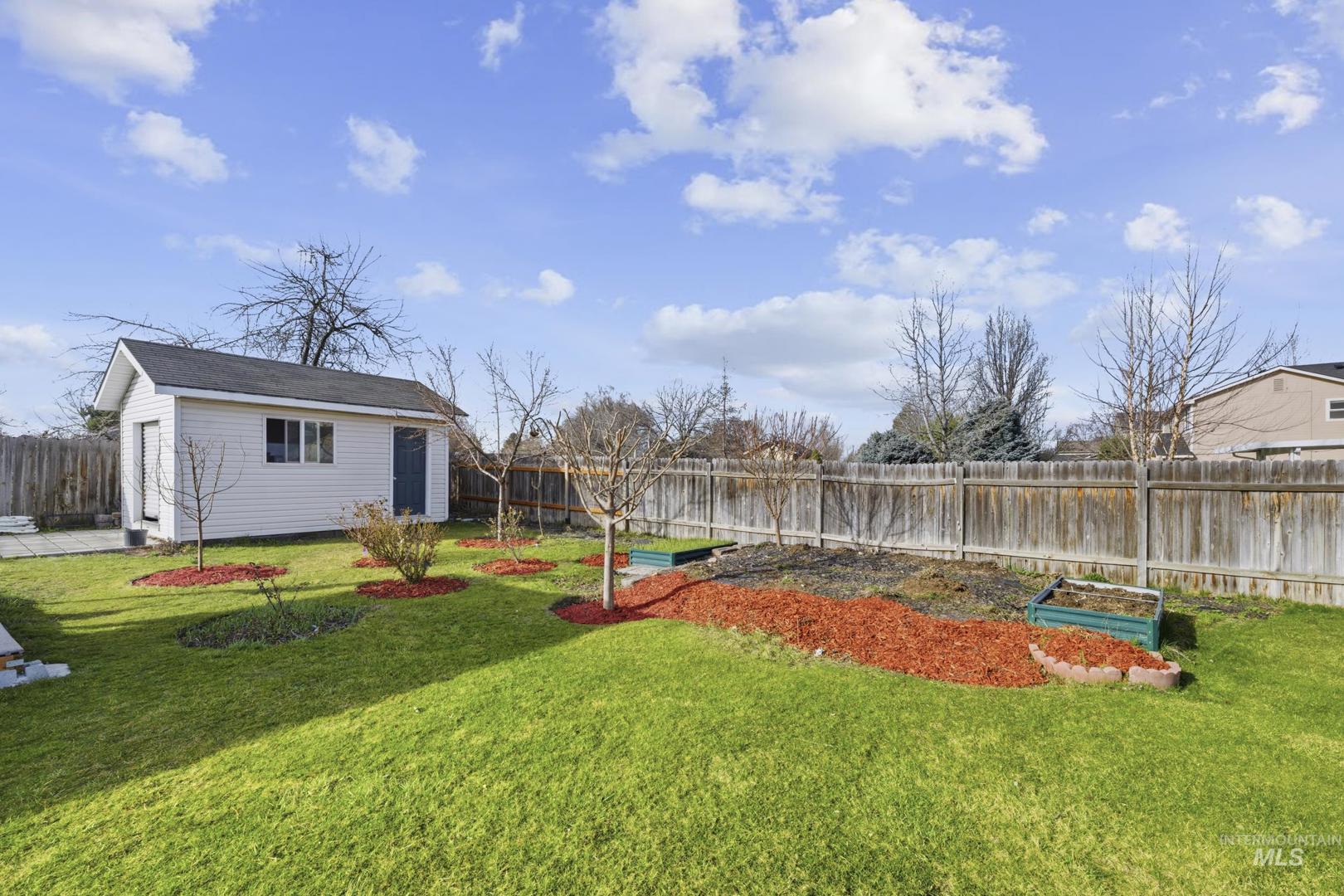 This spacious and well-maintained home sits on a large 0.25-acre lot and offers a perfect blend of comfort, functionality, and outdoor living. Featuring 4 bedrooms and 2 bathrooms, one of the rooms does not include a closet, making it ideal for use as a bonus room, family room, or home office. The home is filled with natural light thanks to its large windows, creating a bright and inviting atmosphere throughout. A newer 50-year roof (only 1 year old) adds long-term value and peace of mind. Step outside to enjoy a beautifully designed backyard with no immediate rear neighbors, offering added privacy. The property includes a large covered gazebo with durable Tex flooring—perfect for entertaining or relaxing year-round. There’s also a storage shed built on a foundation with a shop door, ideal for projects, storage, or hobbies. Additional highlights include a spacious two-car garage, mature fruit trees, and potential RV or boat parking on the side of the home. This property offers space, versatility, and unique features both inside and out—don’t miss it! BTVAI