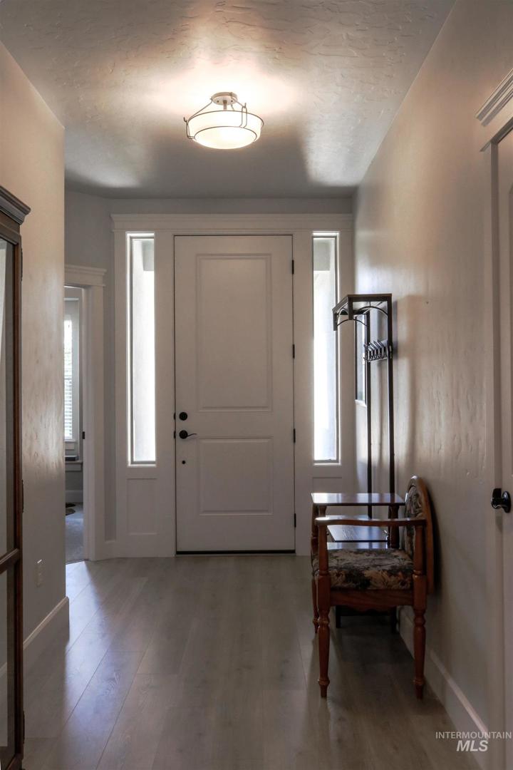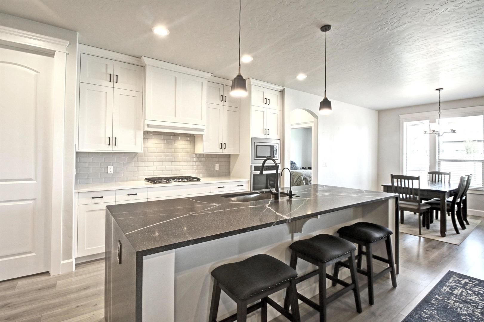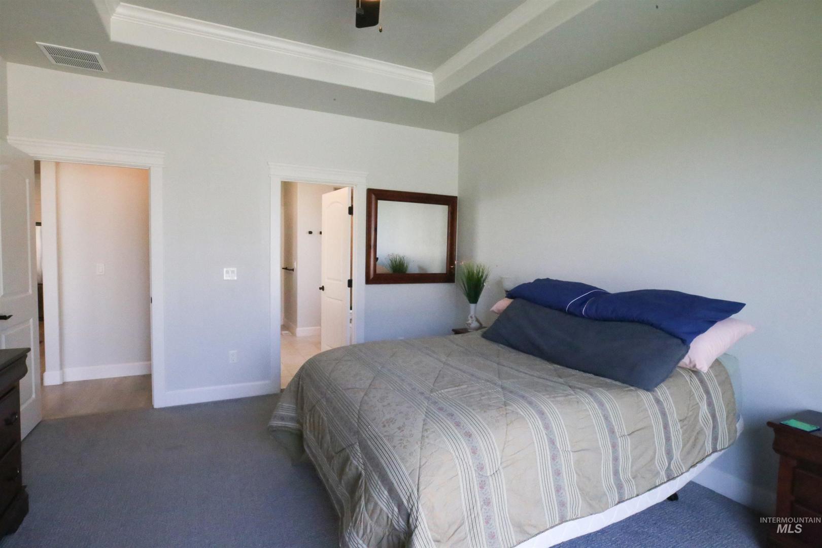 This lovely single level, easy care stucco home with 3 bedrooms, plus an office truly lives large. Stunning custom paint accents, trayed ceiling, and a cozy gas fireplace. Kitchen has quartz countertops and an upgraded stone waterfall over the island that matches the mantle, a farmhouse sink, refrigerator, gas stovetop, and walk in pantry. Additional amenities include a reverse osmosis water filtration system (just upgraded in Jan-26), stand-alone icemaker, 2" blinds, ceiling fans throughout, smart home wiring w/ high speed, and a mud bench area. The primary has a trayed ceiling & door to 2nd patio. Relax in the soaker tub & enjoy tiled floors, dual vanity, walk-in shower & large walk-in closet. North facing backyard with gas stub, gates on both sides, a covered patio and a full sprinkler system with pressured irrigation. Hot Tub also included! Finished garage with epoxy floors, water softener, on demand tankless gas hot water heater. Neighbors on ONE side only (next to community space) with privacy and easy parking. Washer, dryer, fridge, plus Nordic hot tub included. Bridgetower West offers brick paver streets, a community pool, clubhouse, and sport court.