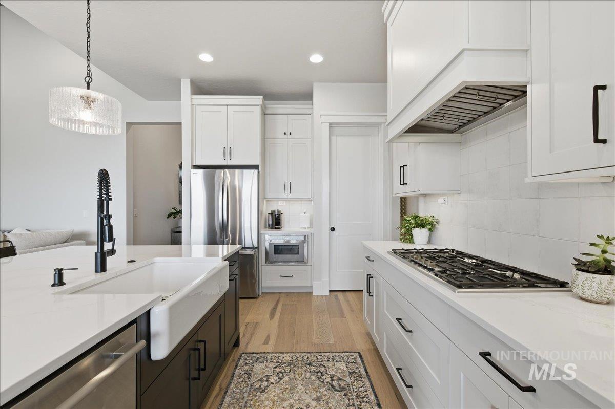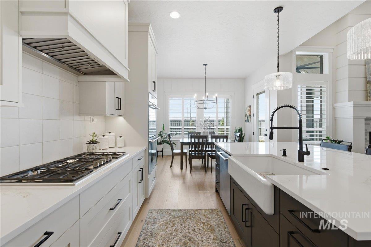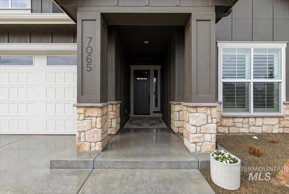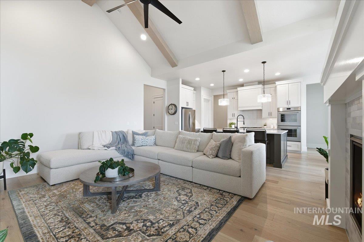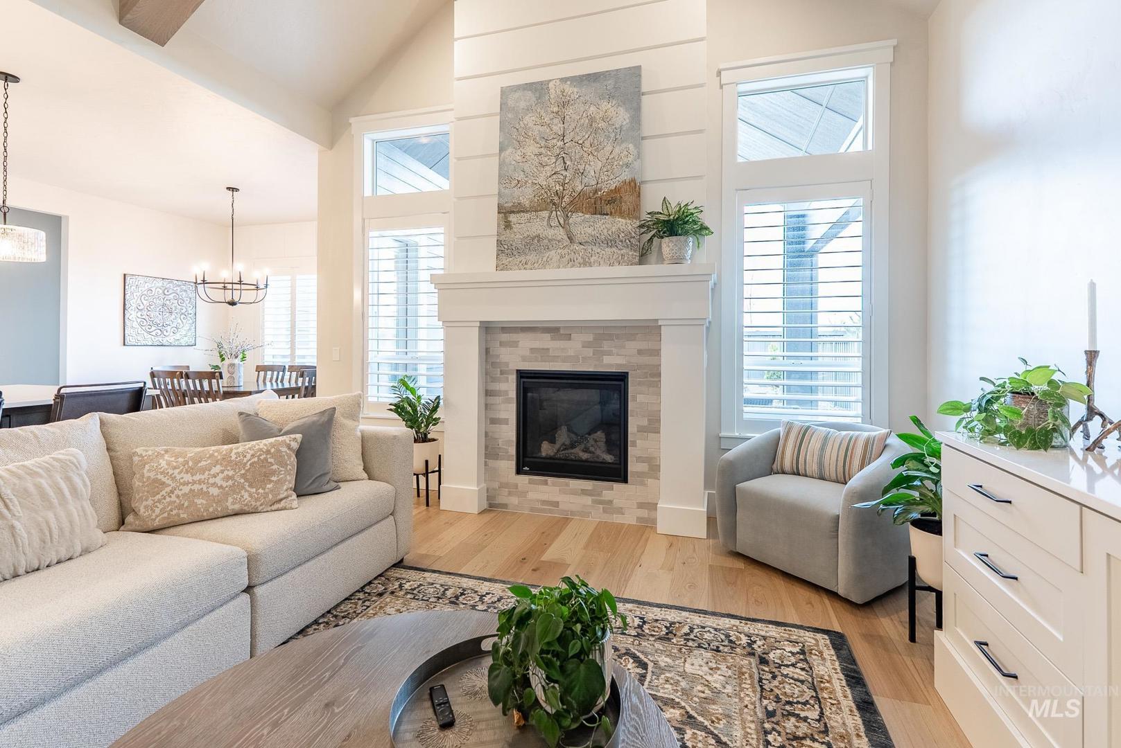 This stunning single-level, move-in ready home in Pinnacle blends elevated design with everyday comfort. The open-concept layout features soaring vaulted ceilings, a dramatic floor-to-ceiling fireplace wall, and a desirable split-bedroom design with Jack-and-Jill bath. Upscale finishes include engineered hardwood flooring throughout all main areas, custom built-ins, window shutters, and enhanced trim work throughout. The gourmet kitchen is a standout with Thermador appliances, double wall ovens, walk-in pantry, and a large quartz island ideal for hosting. Relax in the private owner’s suite with a luxurious soaker tub and walk-in shower with dual showerheads. Enjoy outdoor living on the covered patio with vaulted ceiling and fan, overlooking a fully redesigned, professionally landscaped yard with no rear neighbors—ideal for Idaho sunsets. Prime South Meridian location near Discovery Park, the Meridian Library, schools, and the growing SO|ME area with shopping, dining, and easy freeway access. See listing documents for full list of included features and nearby amenities.