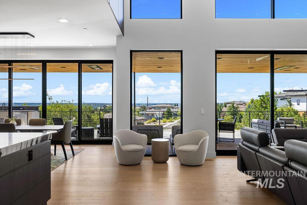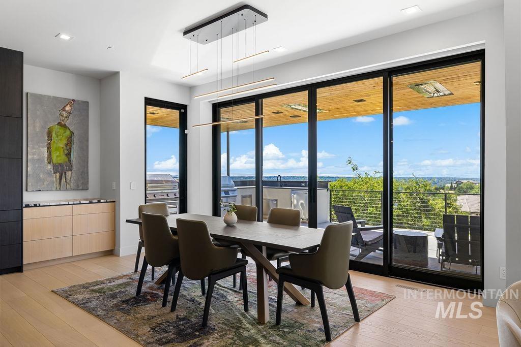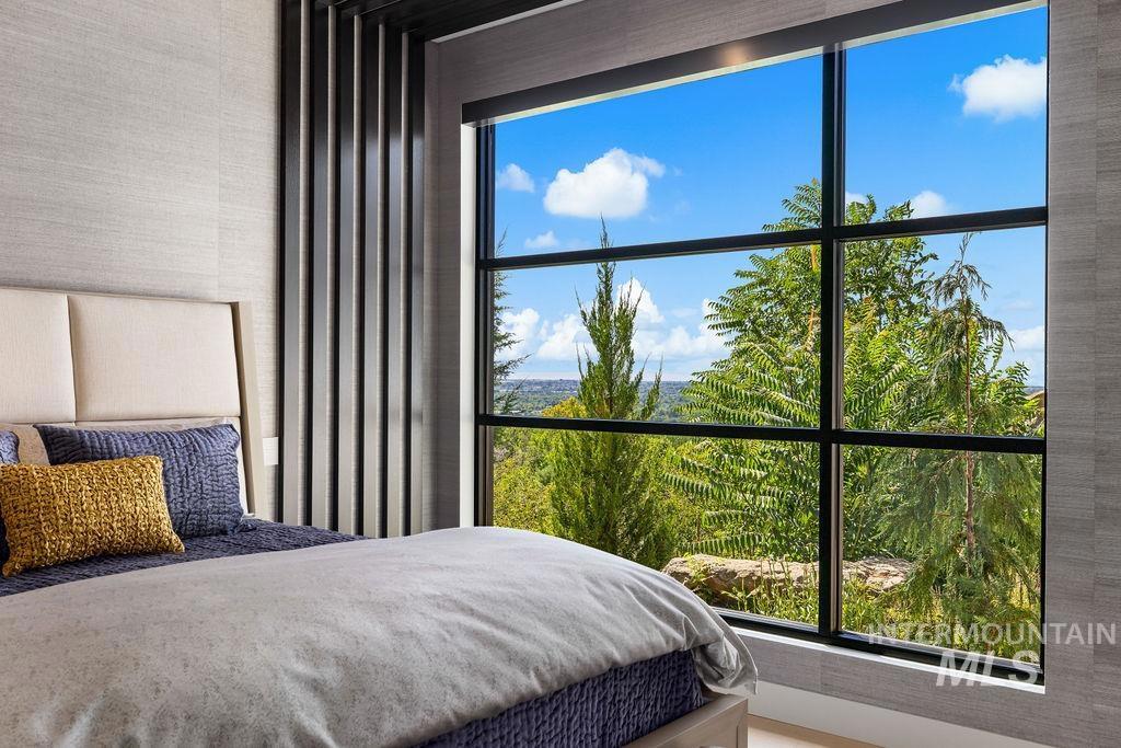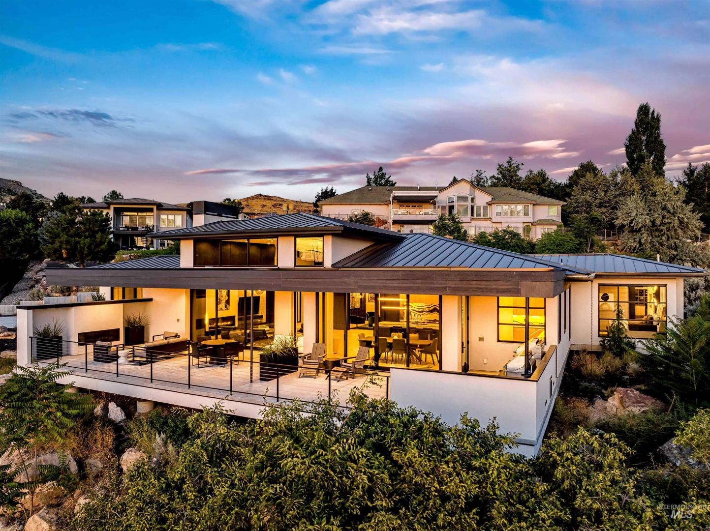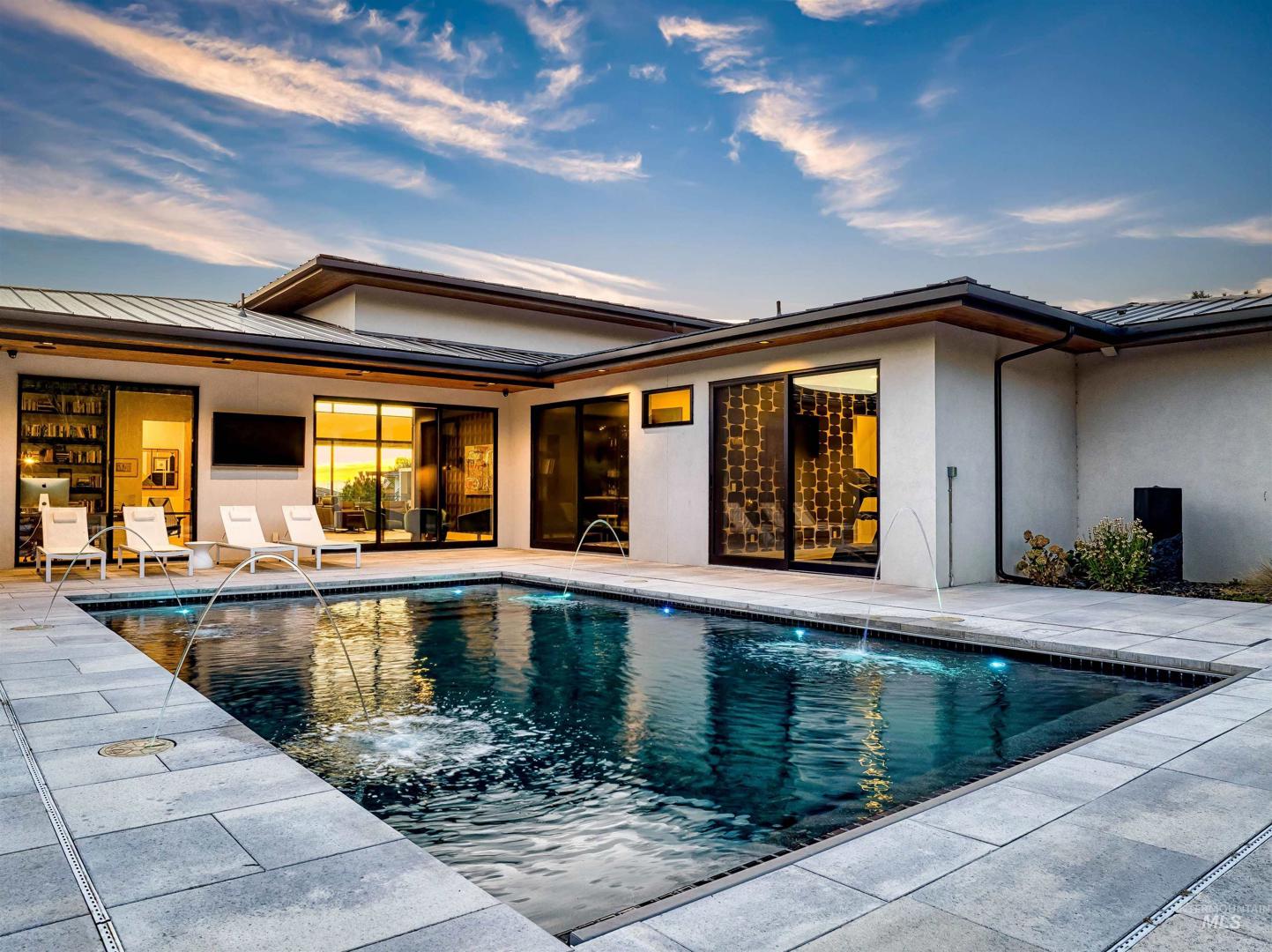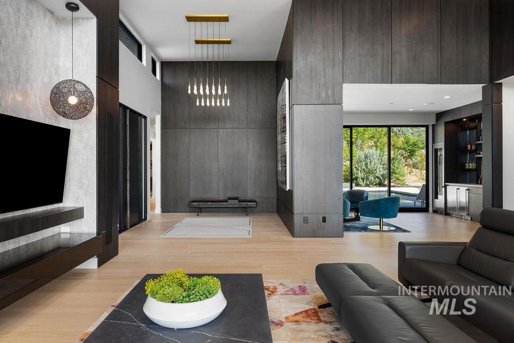 Refined Luxury. Sprawling single-level custom estate on ~1.25 acres in the East Boise Foothills, designed by renowned architect Trey Hoff, with stunning panoramic city and sunset views. A perfect blend of comfort and sophistication, this contemporary home boasts soaring ceilings, rift-sawn oak floors, marble/porcelain surfaces, custom paneling, curated lighting, power shades, sound system, and thoughtful built-ins. The chef’s kitchen is both beautiful and functional, equipped with top-tier Gaggenau and Thermador appliances including an induction cooktop, teppanyaki grill, wall and steam ovens, espresso machine, plus a generous marble island and butler’s pantry. The serene primary suite offers a spa-like bath, dressing closet and direct patio access. Relax in the lounge with bar, wine fridge and ice maker or step outside to enjoy the gorgeous pool and hot tub. A west-facing terrace offers year-round enjoyment w/ fireplace, built-in heaters, and an outdoor kitchen–ideal for elegant entertaining or quiet evenings at home. 4-car garage; No HOA. Low maintenance yard with natural rock hardscaping and native plants.