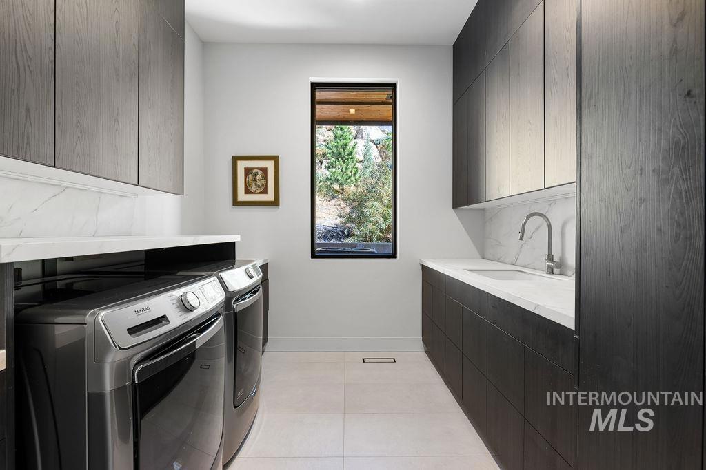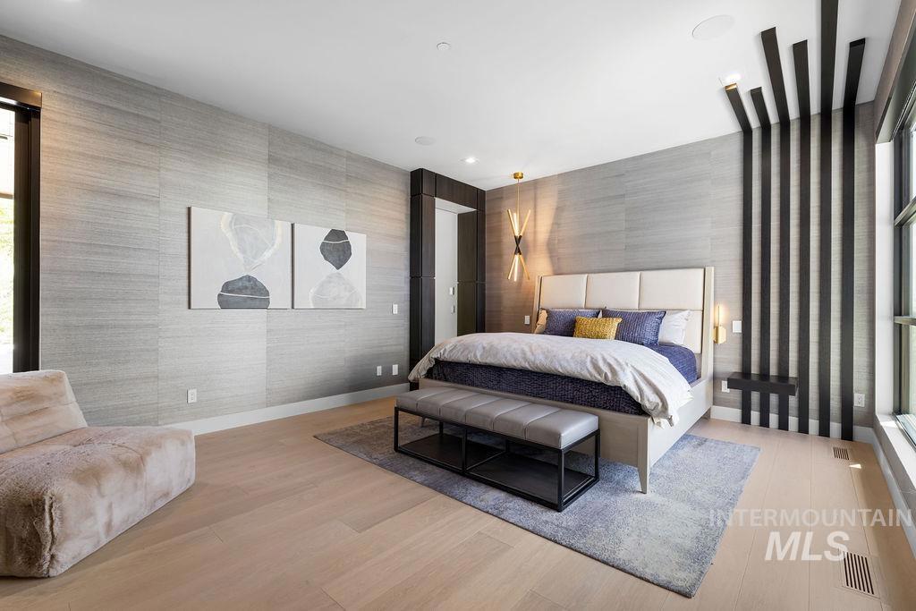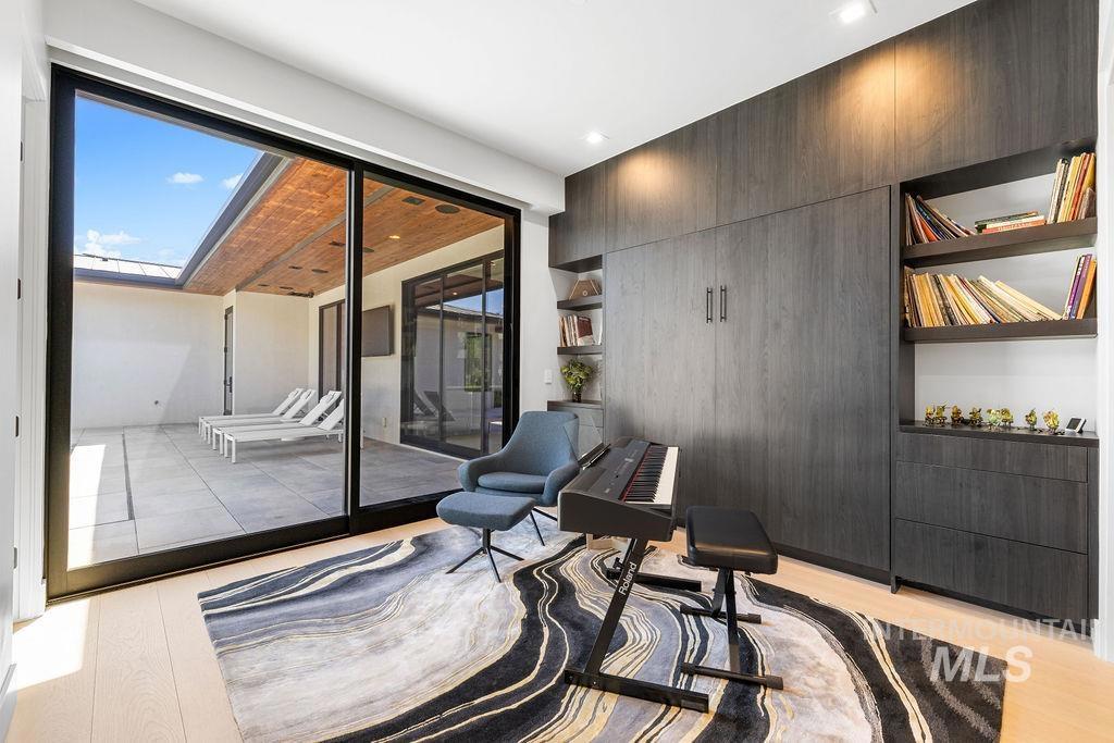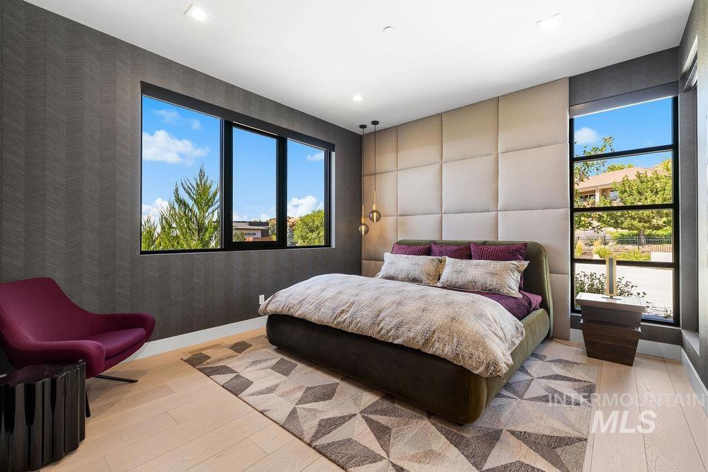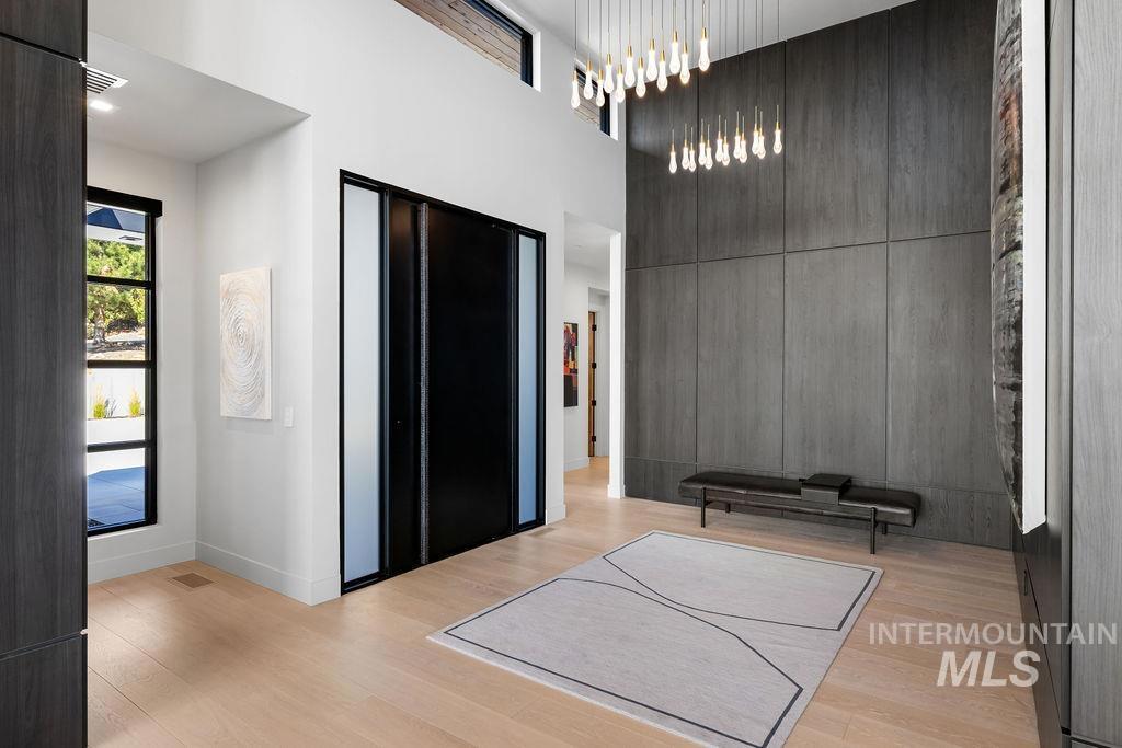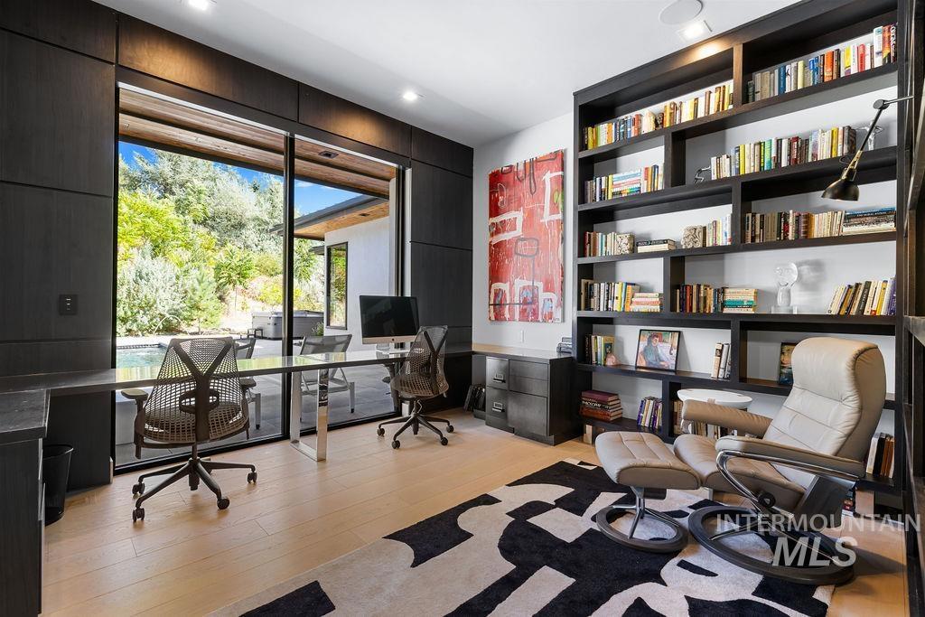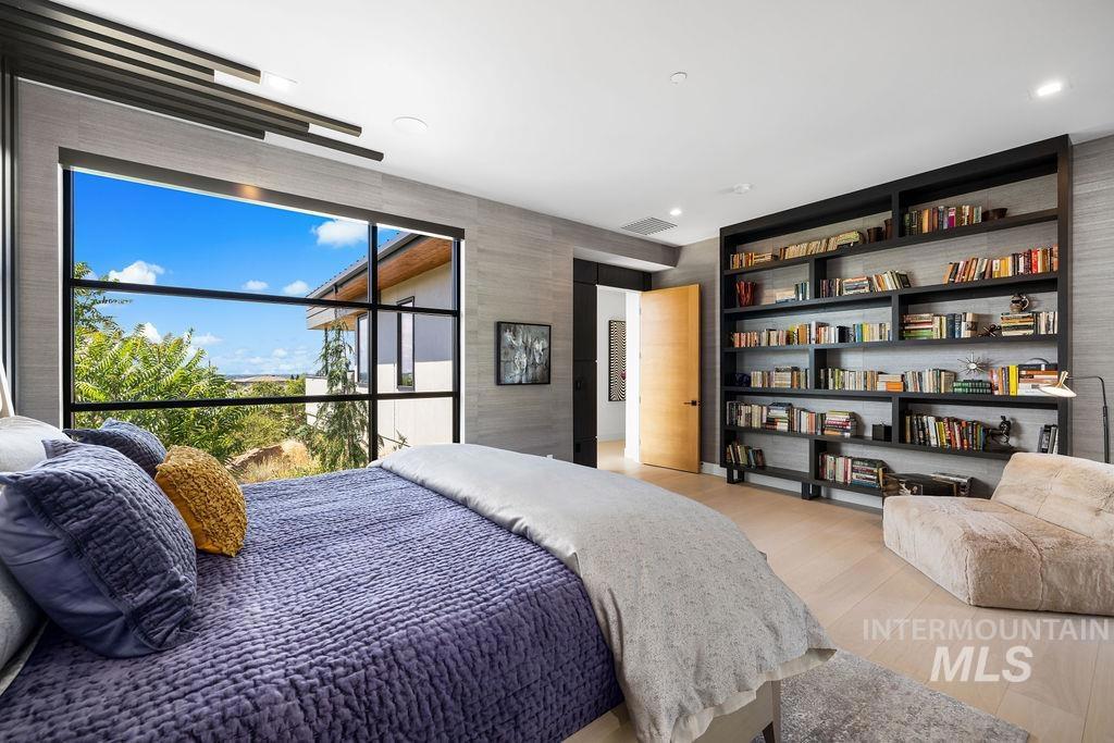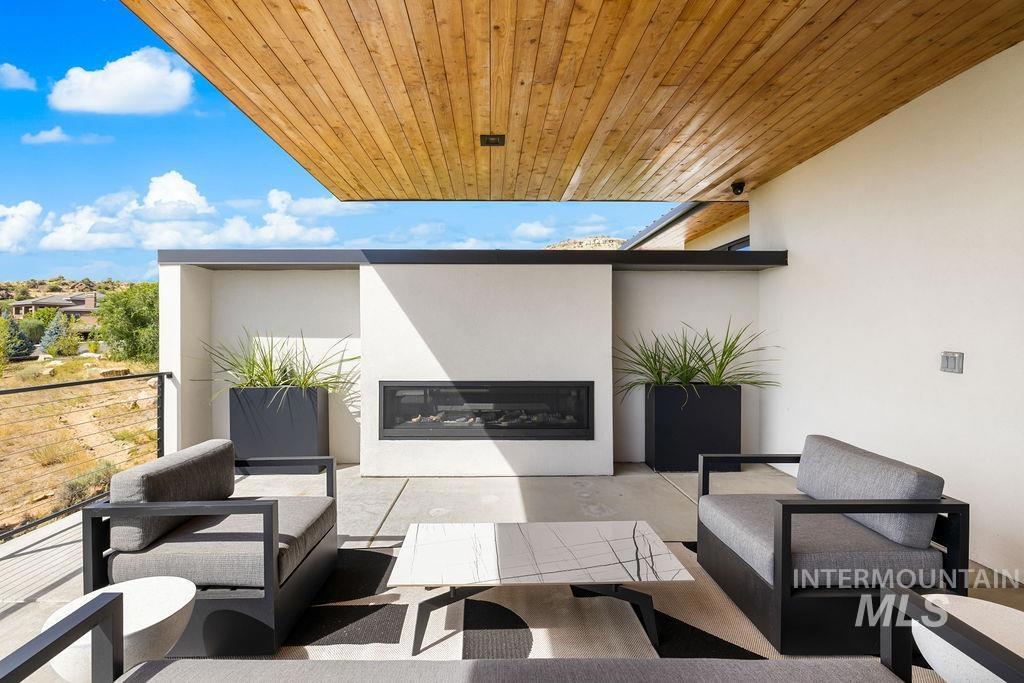 Refined Luxury. Sprawling single-level custom estate on ~1.25 acres in the East Boise Foothills, designed by renowned architect Trey Hoff, with stunning panoramic city and sunset views. A perfect blend of comfort and sophistication, this contemporary home boasts soaring ceilings, rift-sawn oak floors, marble/porcelain surfaces, custom paneling, curated lighting, power shades, sound system, and thoughtful built-ins. The chef’s kitchen is both beautiful and functional, equipped with top-tier Gaggenau and Thermador appliances including an induction cooktop, teppanyaki grill, wall and steam ovens, espresso machine, plus a generous marble island and butler’s pantry. The serene primary suite offers a spa-like bath, dressing closet and direct patio access. Relax in the lounge with bar, wine fridge and ice maker or step outside to enjoy the gorgeous pool and hot tub. A west-facing terrace offers year-round enjoyment w/ fireplace, built-in heaters, and an outdoor kitchen–ideal for elegant entertaining or quiet evenings at home. 4-car garage; No HOA. Low maintenance yard with natural rock hardscaping and native plants.