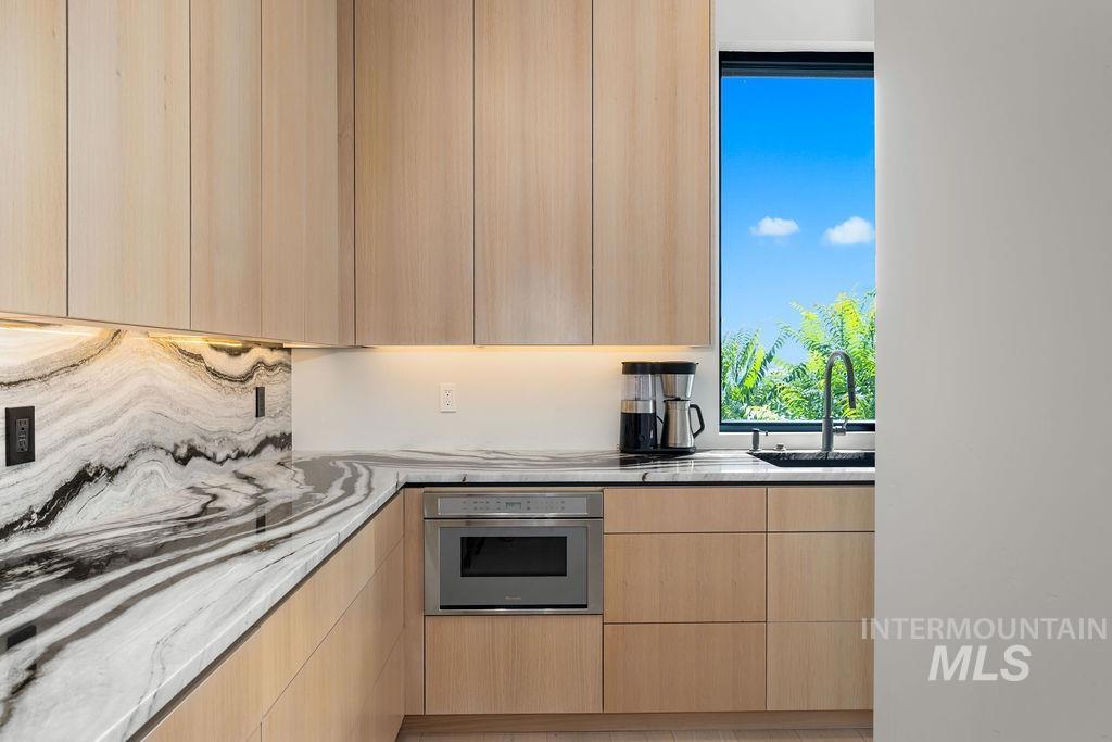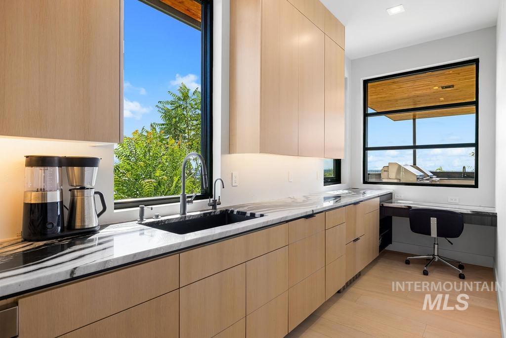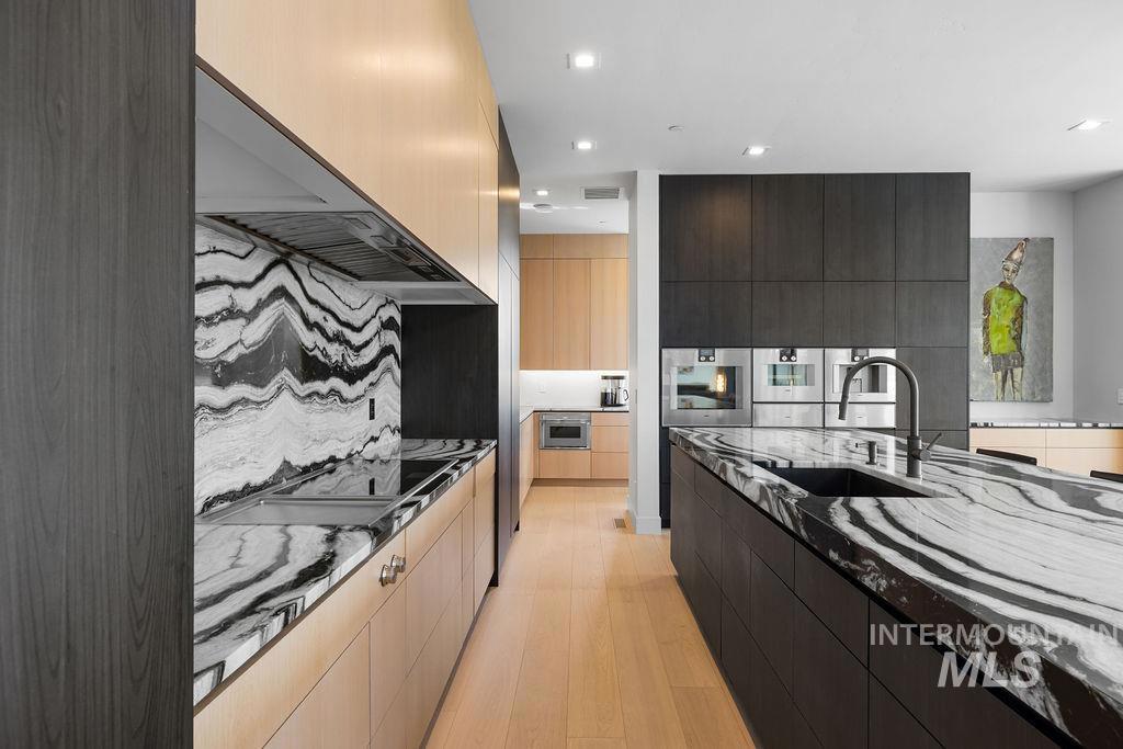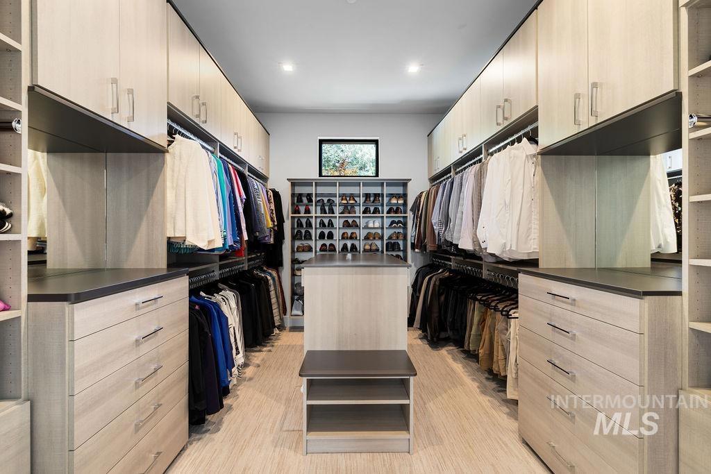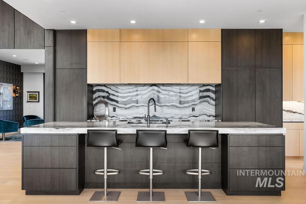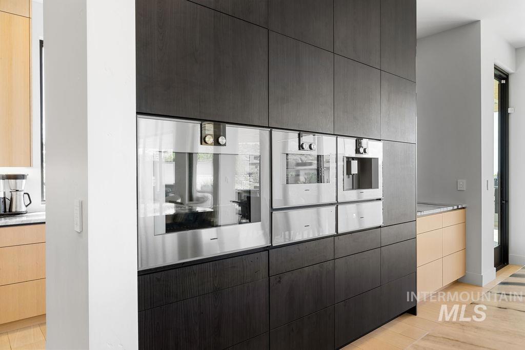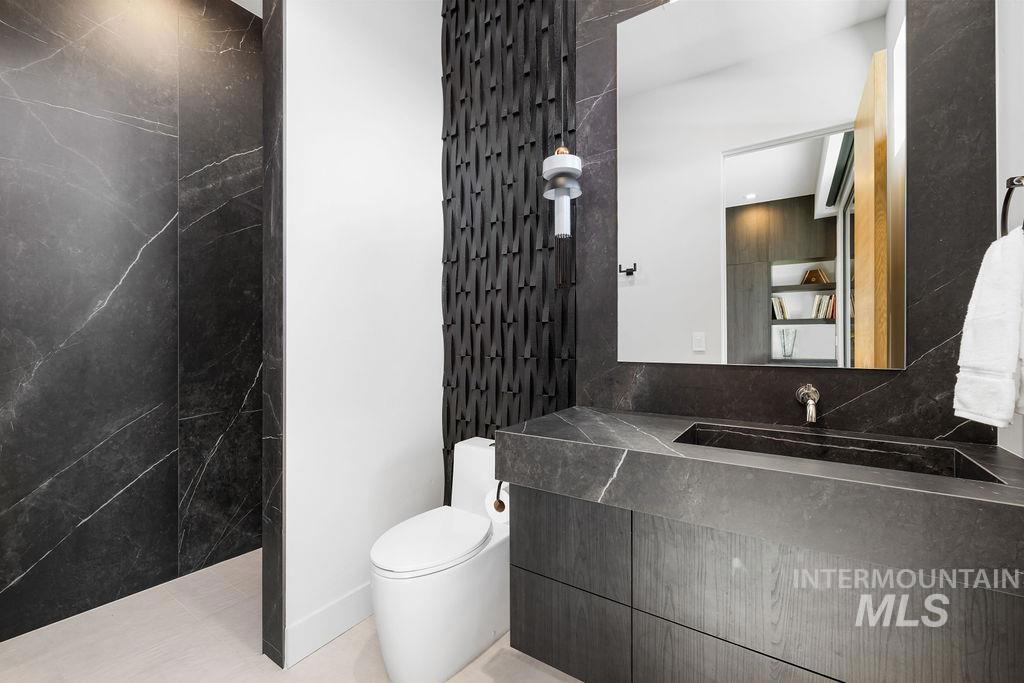 Refined Luxury. Sprawling single-level custom estate on ~1.25 acres in the East Boise Foothills, designed by renowned architect Trey Hoff, with stunning panoramic city and sunset views. A perfect blend of comfort and sophistication, this contemporary home boasts soaring ceilings, rift-sawn oak floors, marble/porcelain surfaces, custom paneling, curated lighting, power shades, sound system, and thoughtful built-ins. The chef’s kitchen is both beautiful and functional, equipped with top-tier Gaggenau and Thermador appliances including an induction cooktop, teppanyaki grill, wall and steam ovens, espresso machine, plus a generous marble island and butler’s pantry. The serene primary suite offers a spa-like bath, dressing closet and direct patio access. Relax in the lounge with bar, wine fridge and ice maker or step outside to enjoy the gorgeous pool and hot tub. A west-facing terrace offers year-round enjoyment w/ fireplace, built-in heaters, and an outdoor kitchen–ideal for elegant entertaining or quiet evenings at home. 4-car garage; No HOA. Low maintenance yard with natural rock hardscaping and native plants.