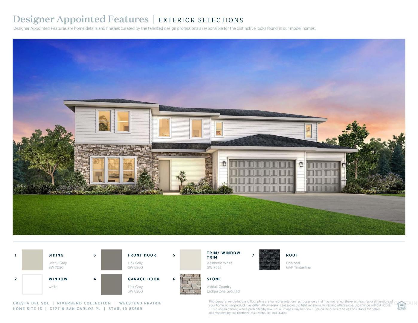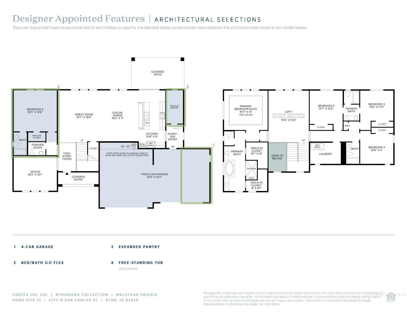 "The Welstead" An airy two-story foyer immediately opens onto a bright great room and casual dining area that overlook the large covered patio. Defined by an oversized center island with breakfast bar, well-appointed kitchen with plenty of counter and cabinet space, and a walk-in pantry. Secluded on the second floor, an elegant tray ceiling highlights the beautiful primary bedroom suite that offers dual walk-in closets and a lovely primary bath with dual vanities, a large soaking tub, luxe shower with seat, and a private water closet. Three secondary bedrooms, two sharing a bath with a separate dual-sink vanity area while one shares a hall bath, feature roomy closets and are central to a spacious loft and convenient laundry. Additionally a guest room and full bath located off the great room, a spacious office off the foyer and powder room. 4 car wide garage. BTVAI