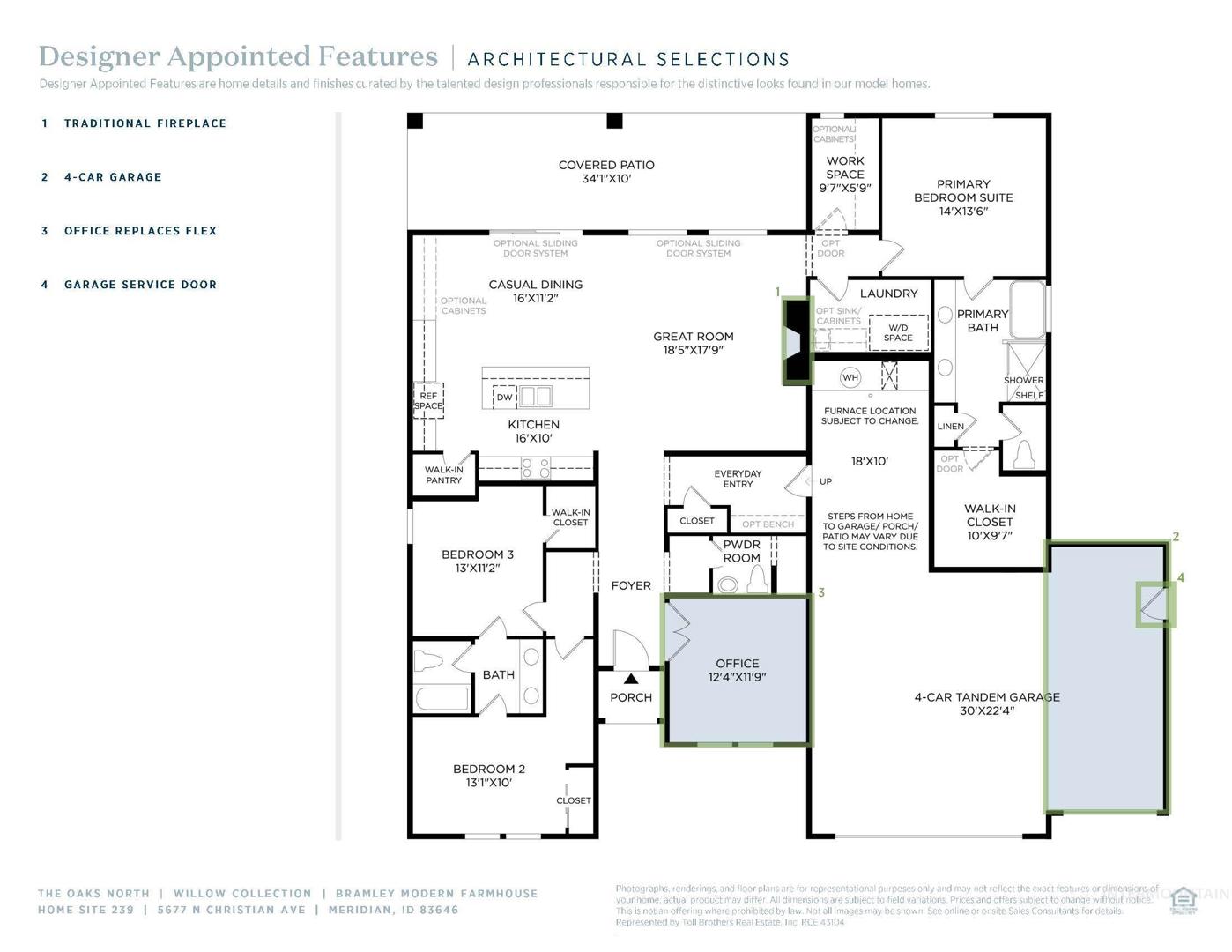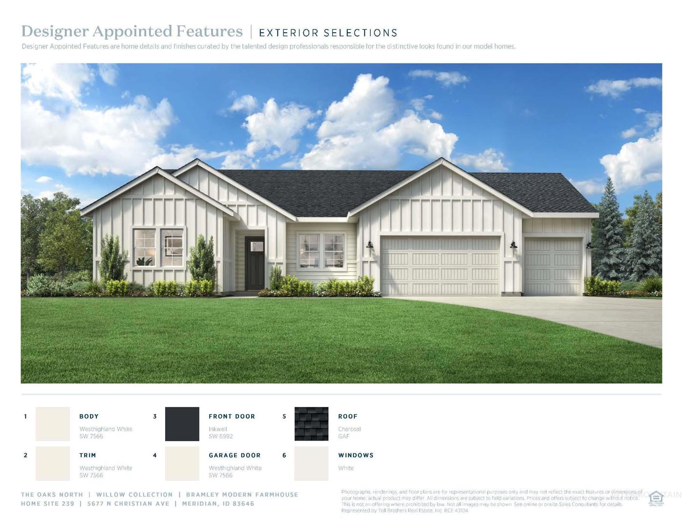 "The Bramley." A welcoming foyer leads to a large great room, with stunning views of the outdoors and access to an expansive covered patio creating a perfect space for indoor-outdoor entertaining. A well-equipped kitchen with island has direct access to the casual dining area boasting ample windows that provide natural light throughout. Two secondary bedrooms with a shared bath and a private office off the foyer. Completing the primary suite is a spa-like private bath with dual sink vanity, tile surround shower, separate soaking tub, and spacious walk-in closet. 4 Car Garage. Front and rear landscape included. BTVAI