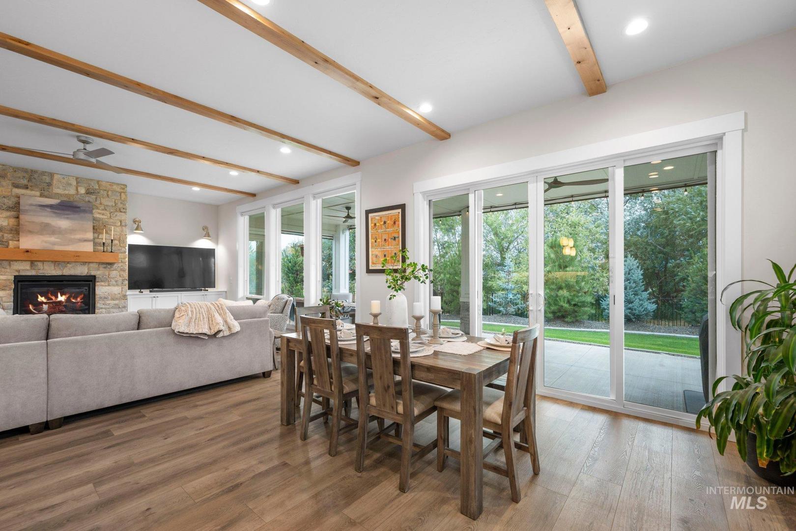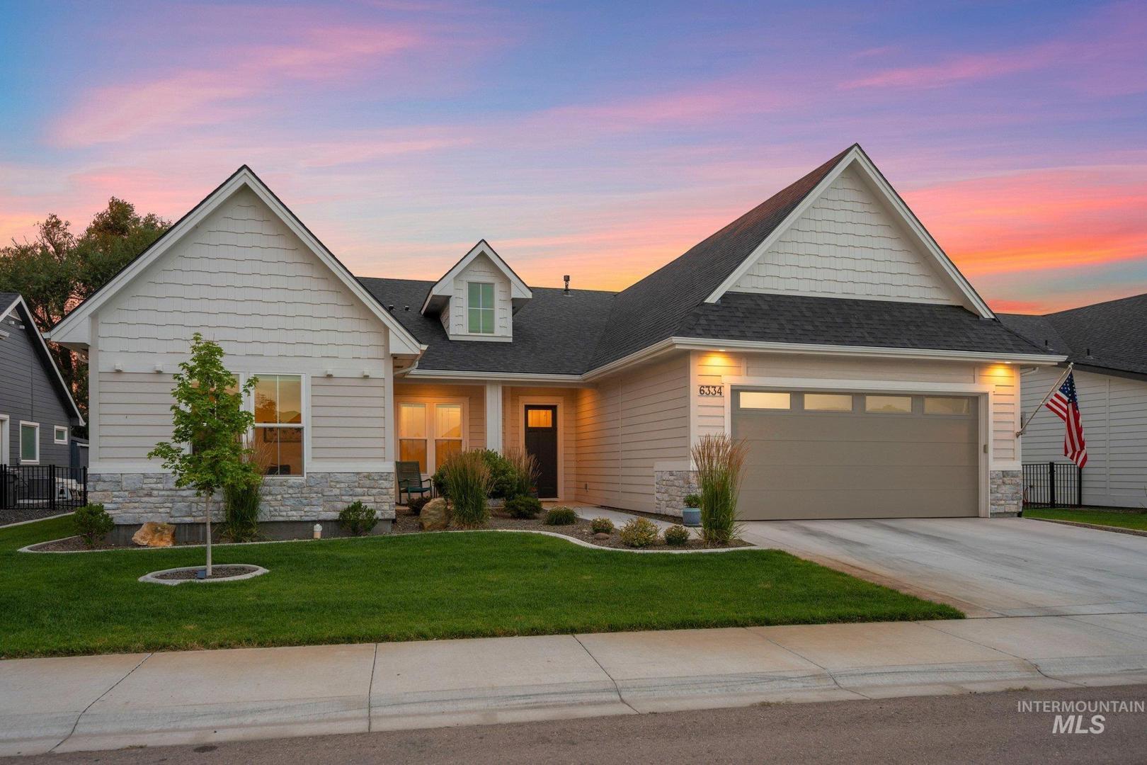 Welcome to 6334 Chateau Ct, a stunning single-level home in the heart of Star’s premier riverside community, Star River Ranch. Built in 2022 by Oakmont Custom Homes, this 2,877 sq ft home offers 3 bedrooms, 2.5 baths, and a versatile flex room ideal for an office or playroom. The open-concept great room boasts durable LVP flooring, ample natural light, and a striking floor-to-ceiling stone fireplace that grounds the design with warmth and texture. The chef’s kitchen is a true masterpiece with quartz countertops, Bosch stainless steel appliances, a large island, and walk-in pantry. The private primary suite offers a spa-like bath and a spacious walk-in closet. Enjoy outdoor living year-round with a covered, retractable screened-in patio, perfect for relaxing or entertaining. Set on a 0.30-acre lot with a 3-car tandem garage, this home also offers access to the community pool, clubhouse, and sportsman`s river access. Experience comfort, custom design, and an unbeatable location in this move-in ready gem!