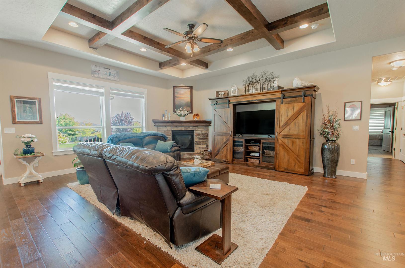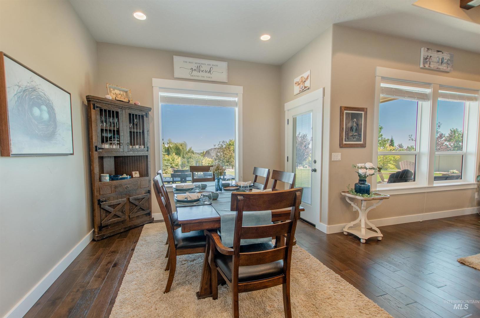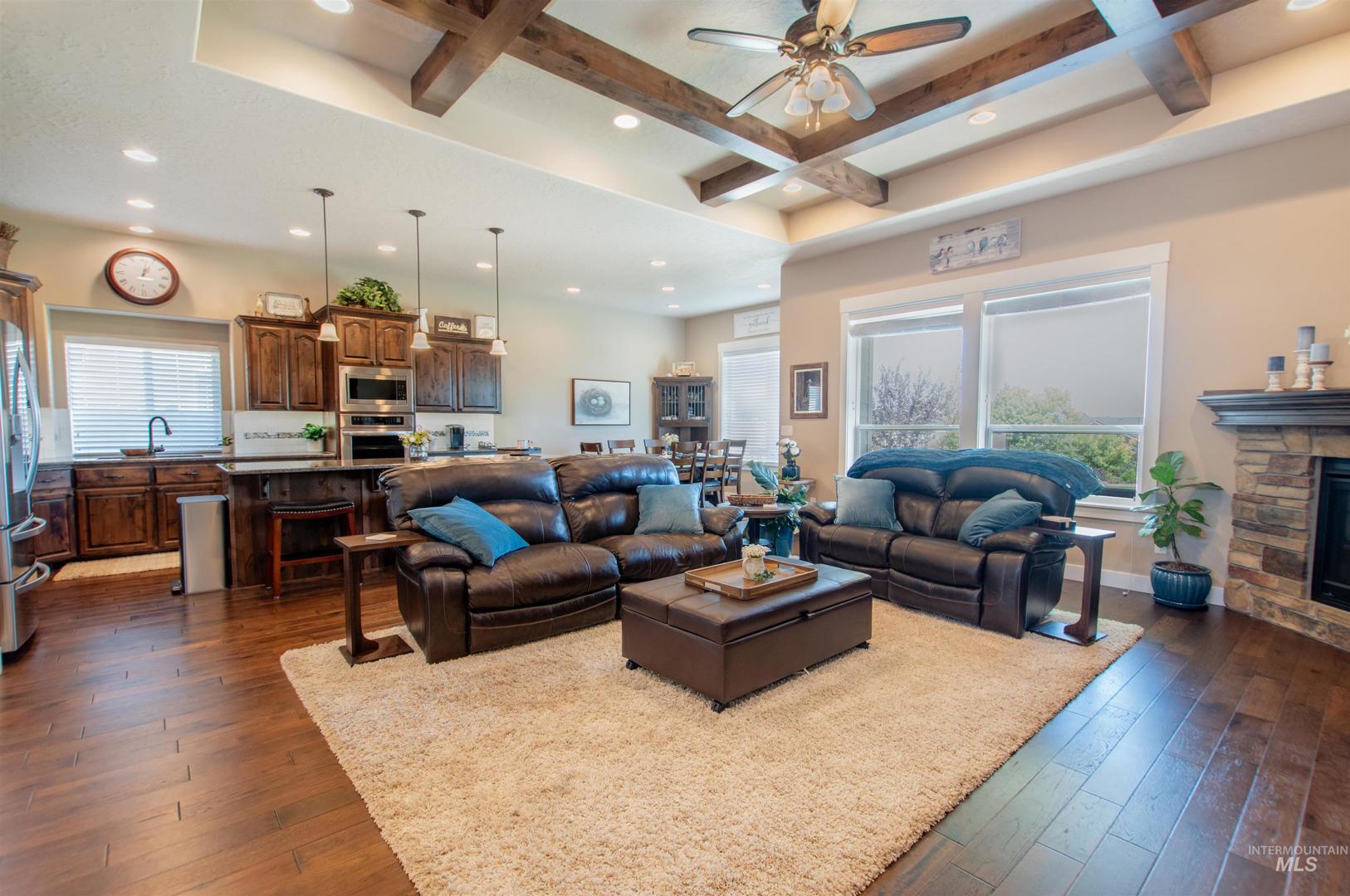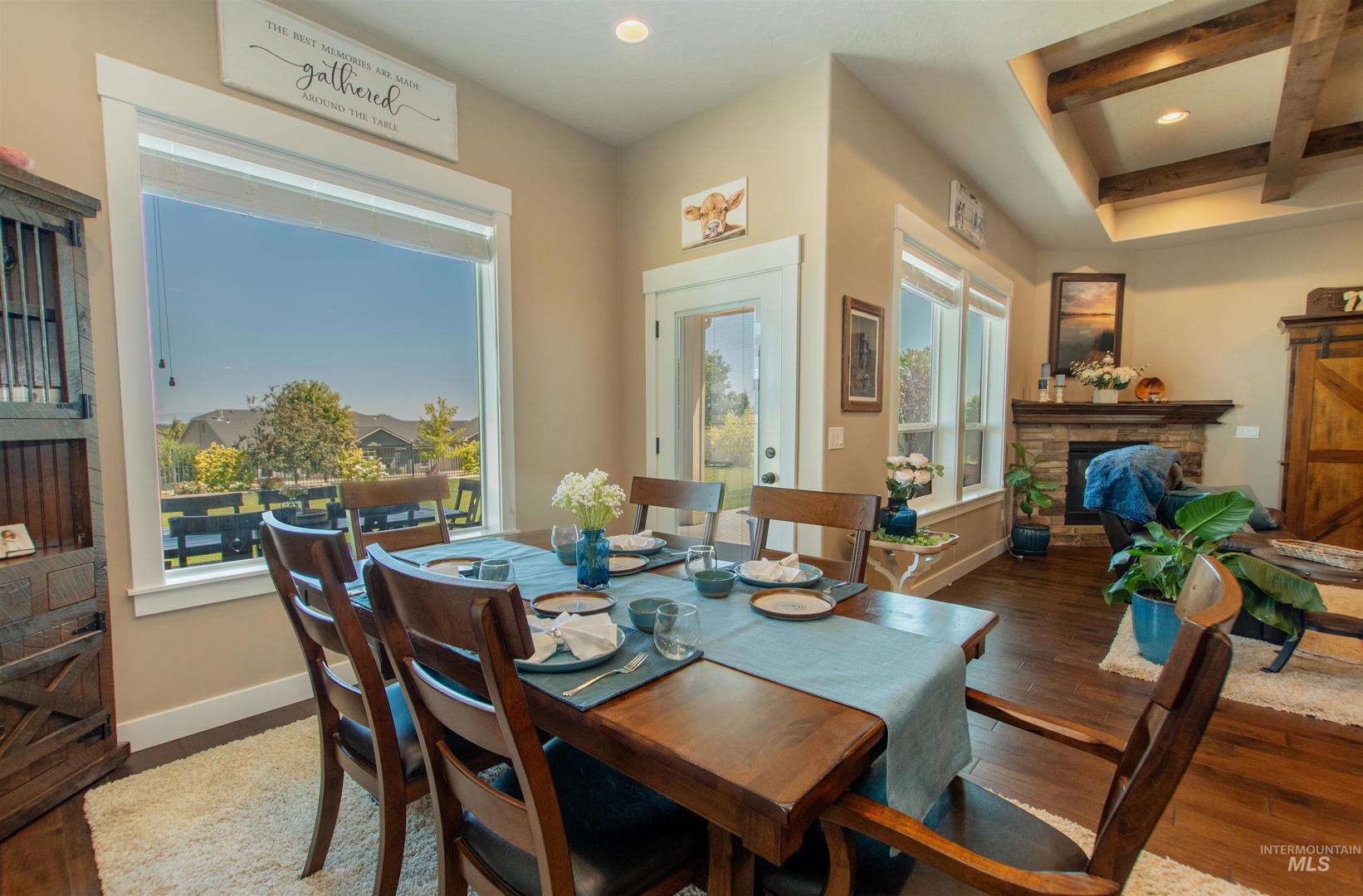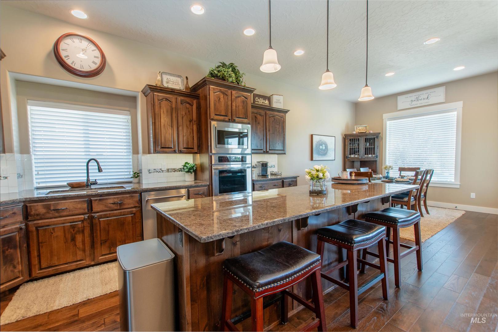 Gorgeous home in the highly sought after Sienna Hills Subdivision! 2nd bedroom is HUGE and can accommodate a King Bed, Couch, TV area, Desk-office area, and a Dresser. It could be used as a Second Master, a Multigenerational area, or a Bonus Room. Home features engineered hardwood floors, granite counters throughout, a coffer with beautiful beam like structures in the great room, plantation shutters, a gas fireplace, beautiful cabinetry, tons of natural light, and a stunning wooden arch structure in the entry. The laundry room includes a sink, cabinetry, and a mudroom organizer to store unwashed laundry. The artistically designed backyard feels like your own private park with no back neighbors. It has a HUGE patio area, partially covered -which can easily accommodate 14+ people for outside eating/entertainment. Views of the Boise Mountains. Community Pool, Clubhouse, Tennis, Pickleball, and Basketball. Close to Lake Lowell Recreational Area & the Wine Country.