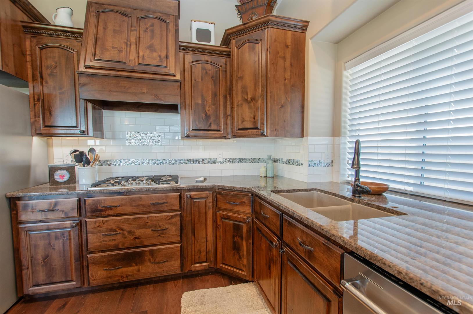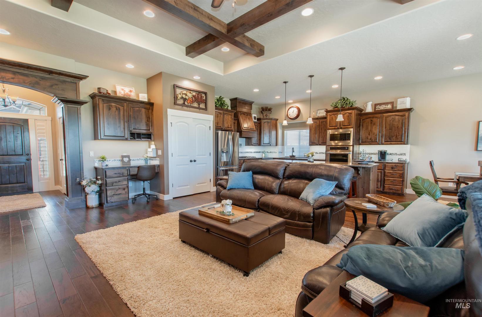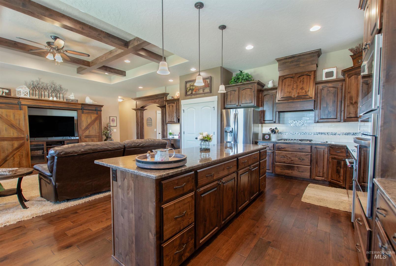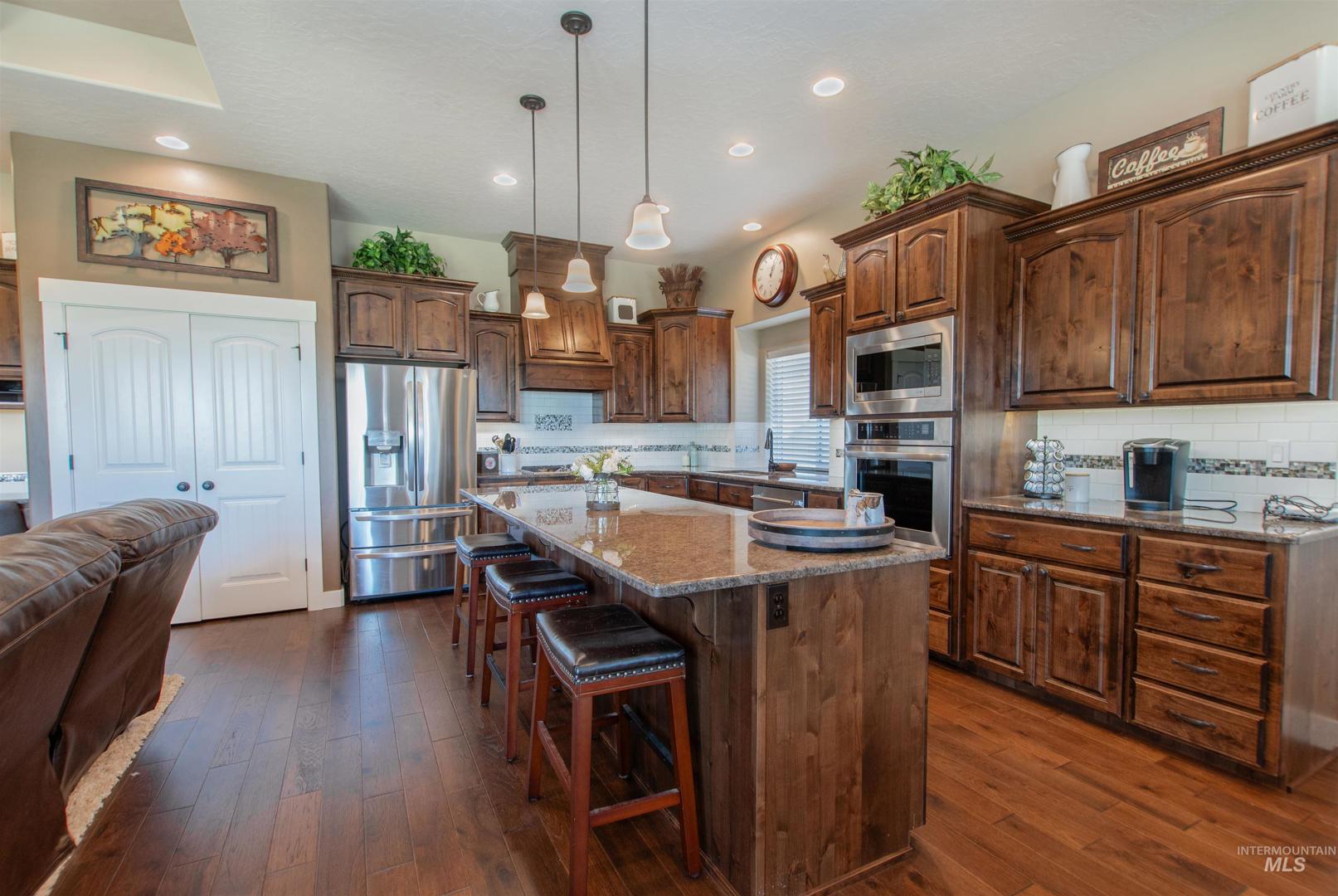 Gorgeous home in the highly sought after Sienna Hills Subdivision! 2nd bedroom is HUGE and can accommodate a King Bed, Couch, TV area, Desk-office area, and a Dresser. It could be used as a Second Master, a Multigenerational area, or a Bonus Room. Home features engineered hardwood floors, granite counters throughout, a coffer with beautiful beam like structures in the great room, plantation shutters, a gas fireplace, beautiful cabinetry, tons of natural light, and a stunning wooden arch structure in the entry. The laundry room includes a sink, cabinetry, and a mudroom organizer to store unwashed laundry. The artistically designed backyard feels like your own private park with no back neighbors. It has a HUGE patio area, partially covered -which can easily accommodate 14+ people for outside eating/entertainment. Views of the Boise Mountains. Community Pool, Clubhouse, Tennis, Pickleball, and Basketball. Close to Lake Lowell Recreational Area & the Wine Country.