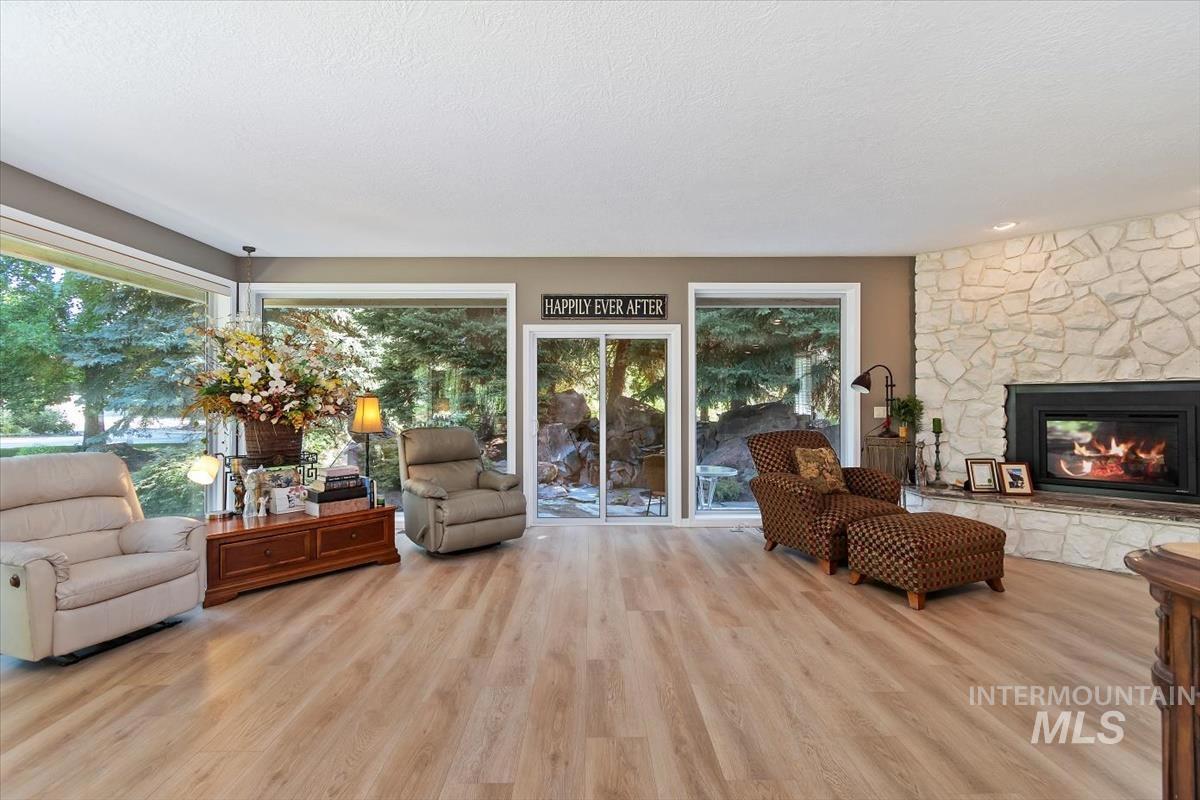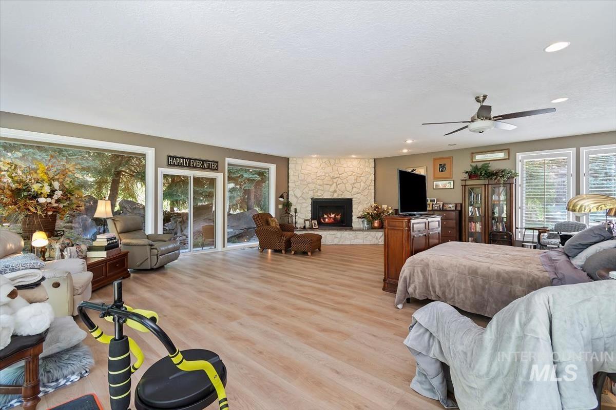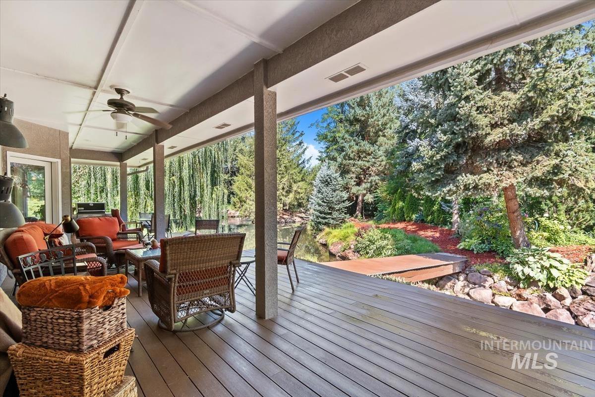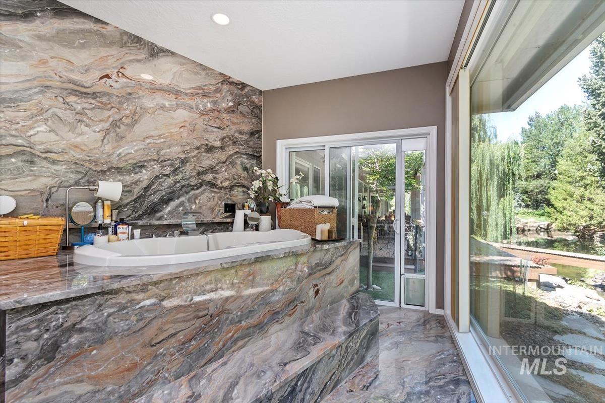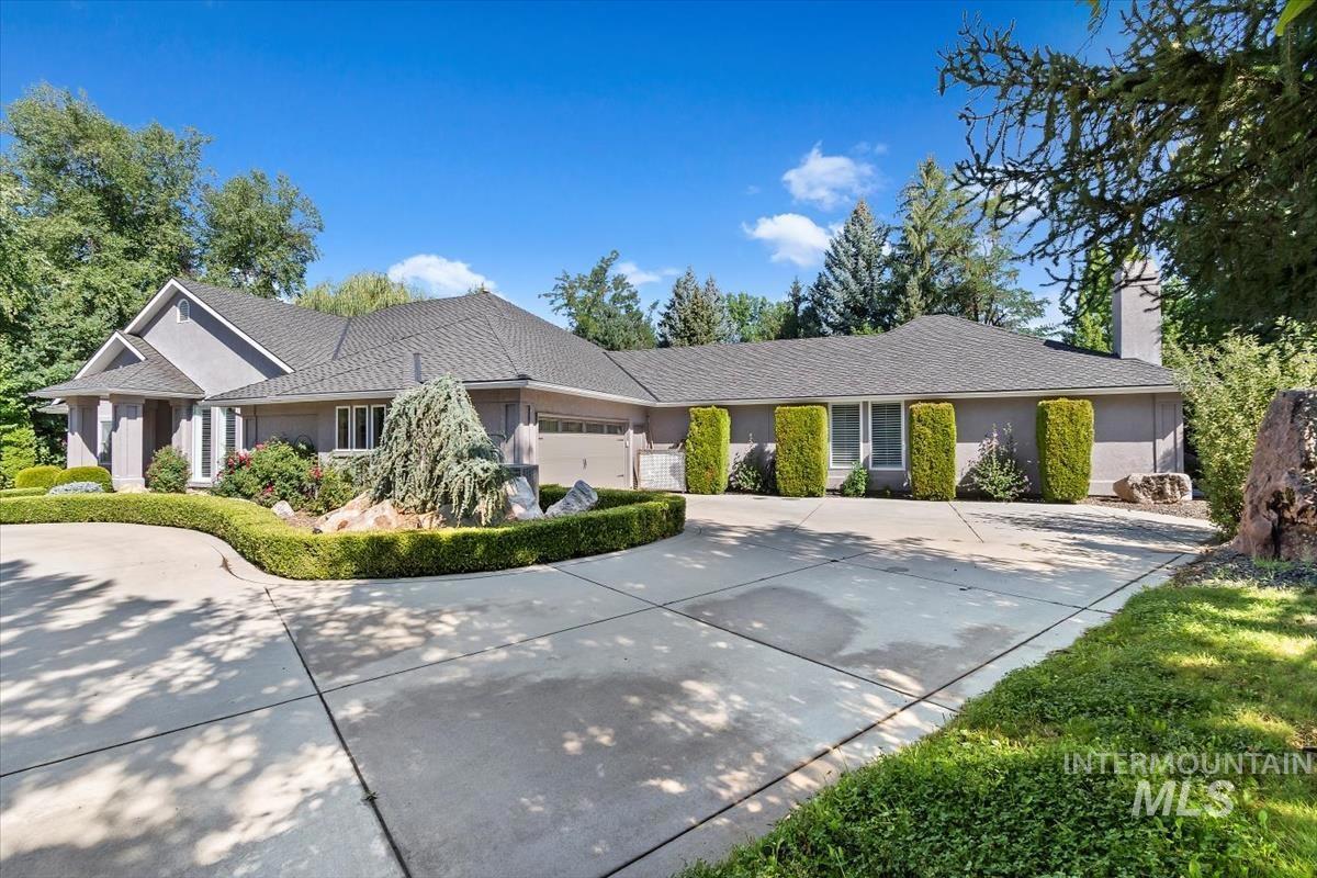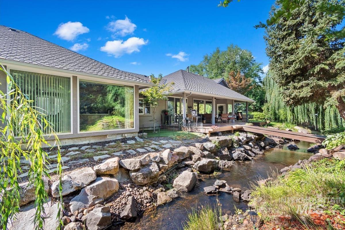 This amazing waterfront, single level home is located in the desirable Riverside Village. This home is in a gated community on a private cul-de-sac. Two Custom waterfalls create an atmosphere of enjoyment. You have to see to believe the majestic beauty and scale of this property. The primary suite is 800+SF featuring a one of a kind built-in marble bathtub, spacious walk-in closet, LG shower, dual vanities and the floor to ceiling windows that provide Picturesque Views. The kitchen has fine finished Walnut cabinetry, Granite counter tops and SS appliances. Walking distance to the greenbelt, 5miles to downtown Boise. The roof, AC, W/Heater and plumbing from Street to house including waterlines inside the house have been replaced with-in the last 5yrs.