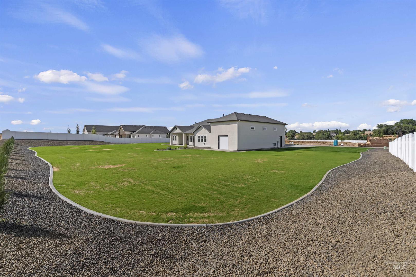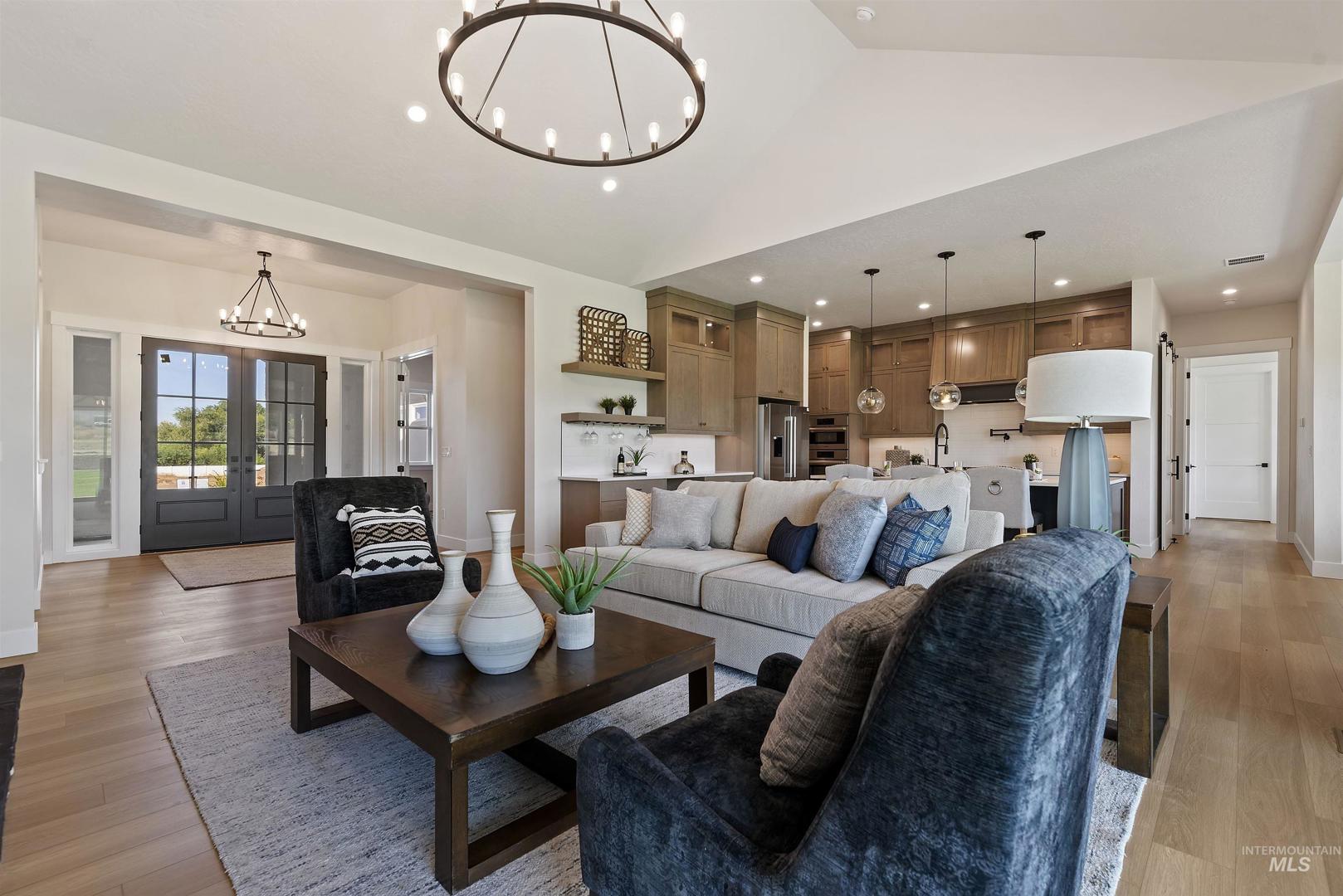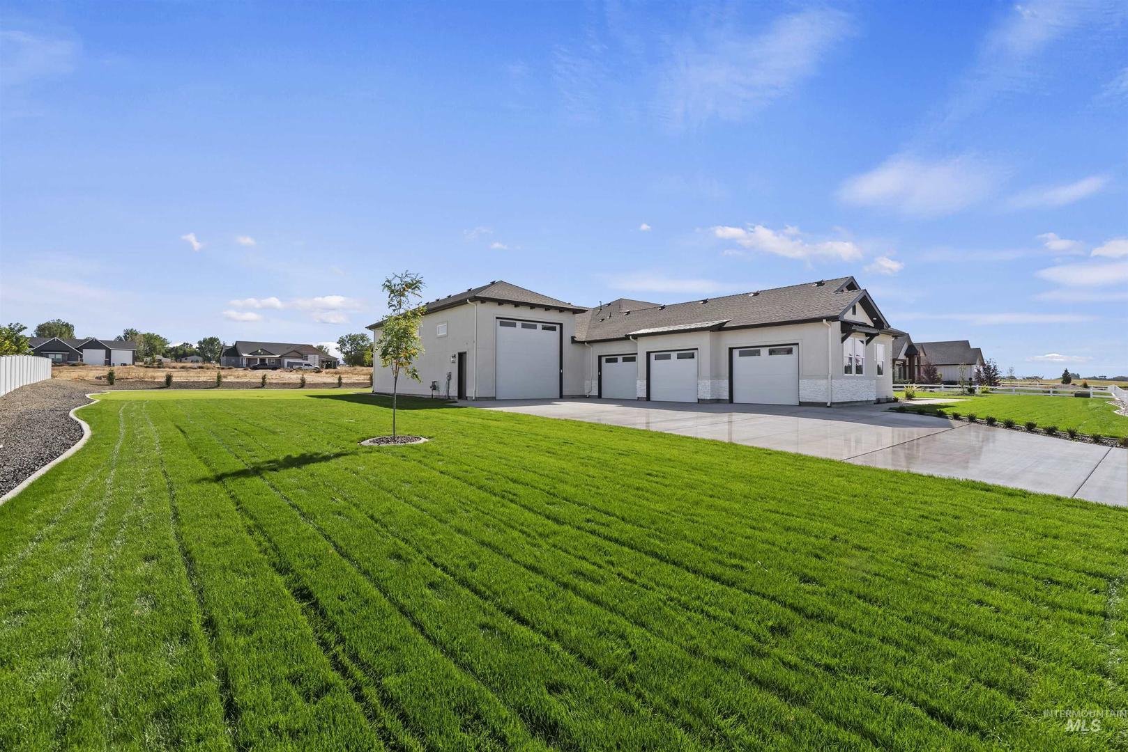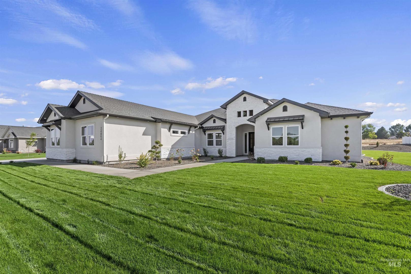 Come Enjoy the Idaho Experience Living in the sought-after Spring Hill Ranch Community! This stunning new construction home sits on a full acre with incredible views, blending luxury with everyday functionality. Featuring 4 bedrooms, 3.5 baths, and an 8-car insulated, painted garage with a 54’ RV bay, there’s plenty of room for all your vehicles and storage. Inside, you’ll find quartz countertops, matte black fixtures, and LVT flooring, all highlighted by soaring 10’+ ceilings. The gourmet kitchen boasts stainless steel appliances, a gas range, double ovens, and a butler’s pantry. The open-concept great room showcases a vaulted ceiling and stone fireplace, with direct access to a covered patio for indoor-outdoor living. Great for entertaining! The primary suite offers coffered ceilings, a walk-in tiled shower, soaking tub, dual vanities and dual walk-in closets. Located minutes to Exit 25, Purple Sage Golf Course, and down downtown Middleton!