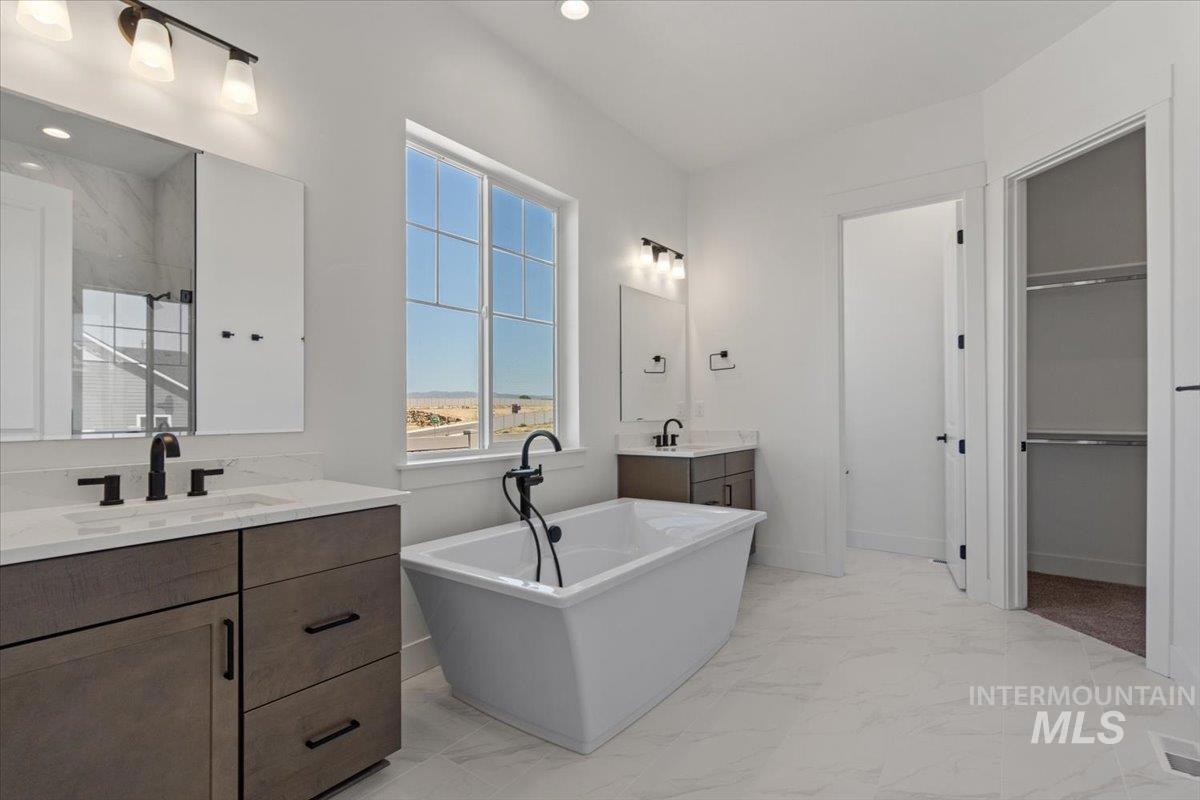 "The Harris" by Richmond American Homes, available this November. This home is available to tour daily from 10 AM to 6 PM, and you don’t need an appointment to visit. You can stop by the Information Center at 967 N Falling Water Way, Eagle, ID 83669, where we have the full inventory of completed and upcoming homes, as well as limited build-to-order opportunities. Please feel free to ask about our current builder special offers and financing options. This beautiful community has a premier Eagle location close to dining, shopping, and recreation. The Portfolio collection homes feature elegant luxury finishes such as 10-foot ceilings, gourmet kitchens with quartz countertops, gas fireplaces, covered patios, upgraded soft-close wood cabinets, and deluxe primary baths. All homes come with tankless water heaters, are HERS rated for superior efficiency and low utility bills, and include front and back landscaping, sprinklers, and fencing. Restrictions apply. PHOTOS SIMILAR