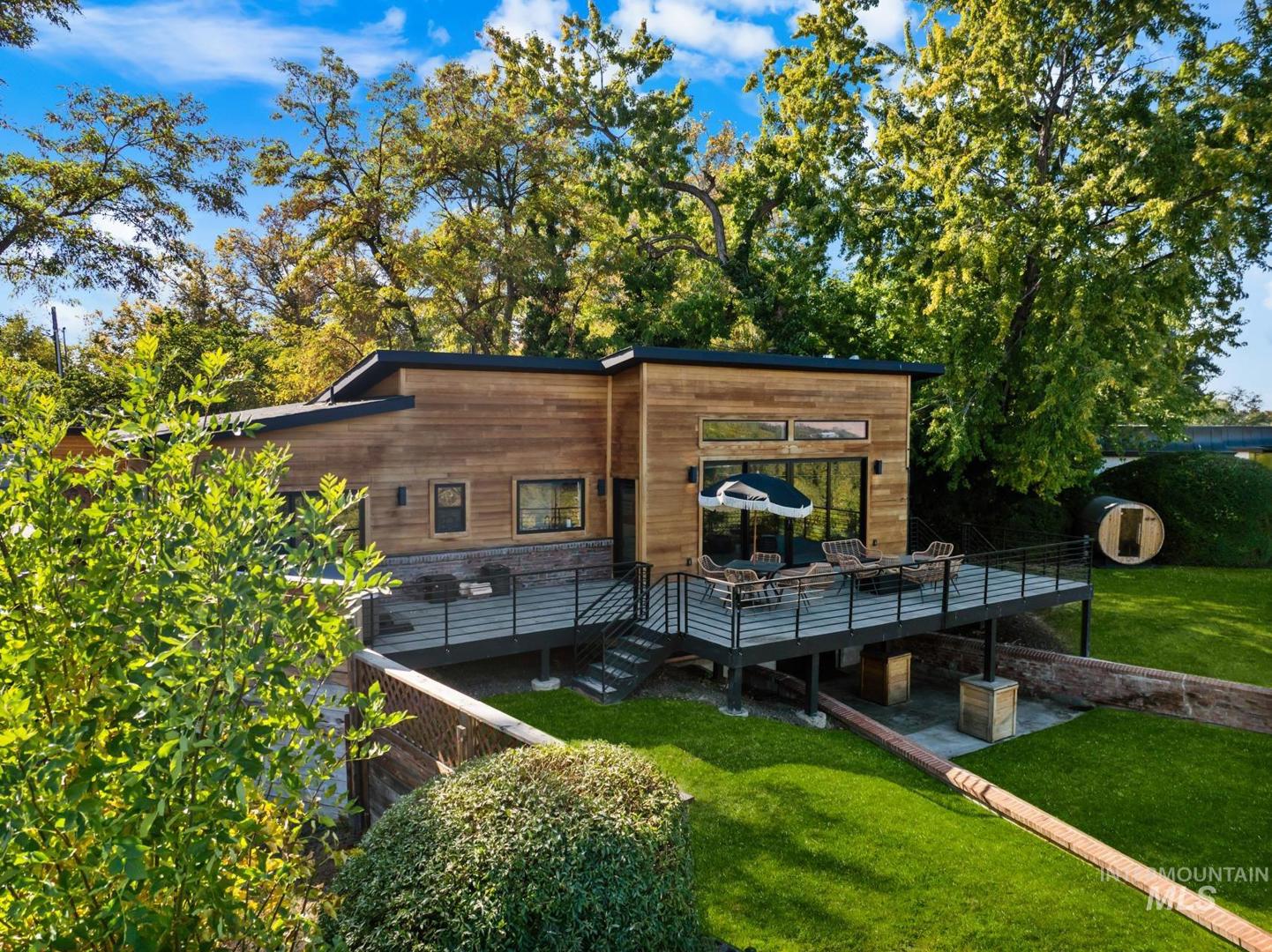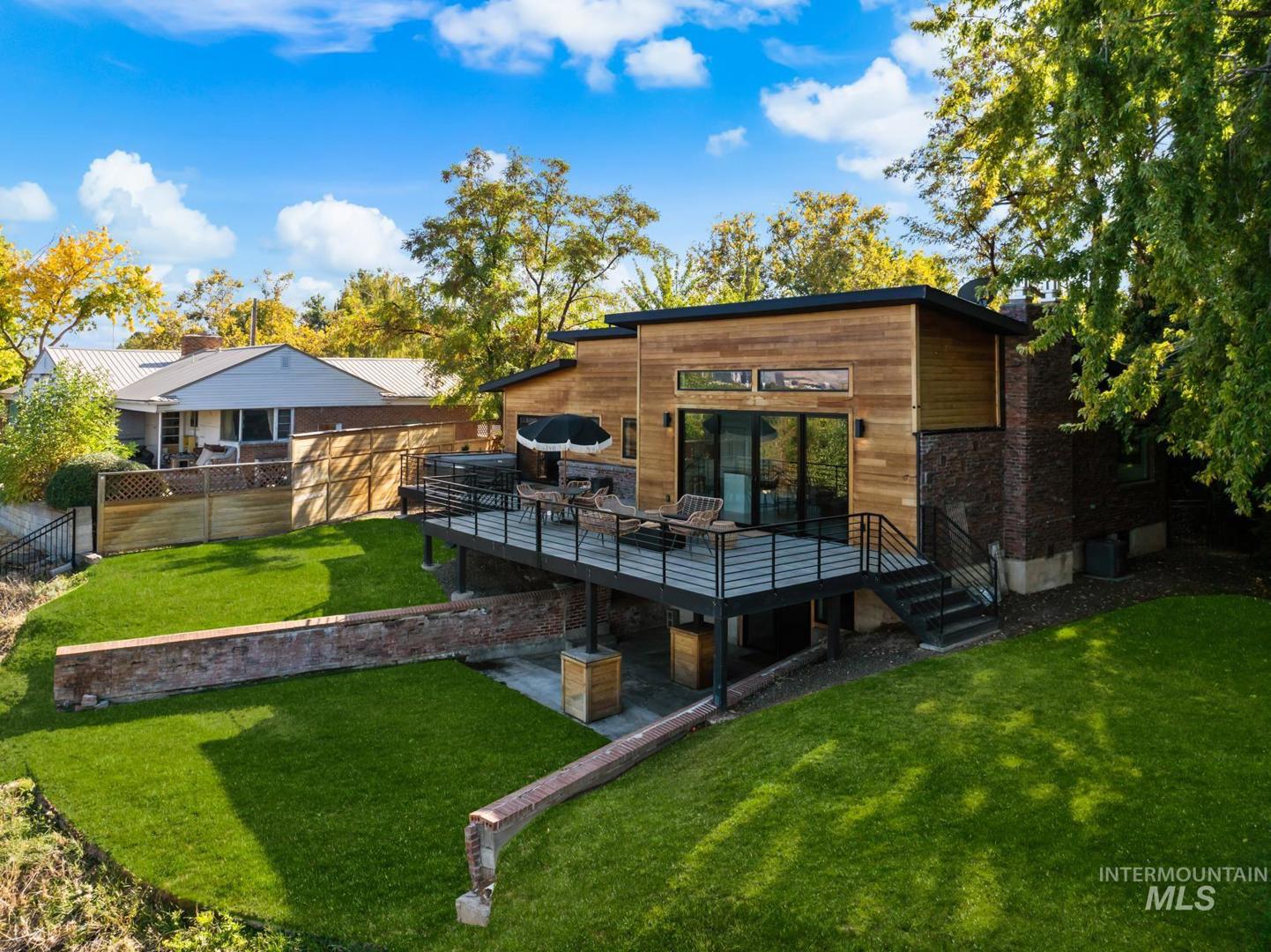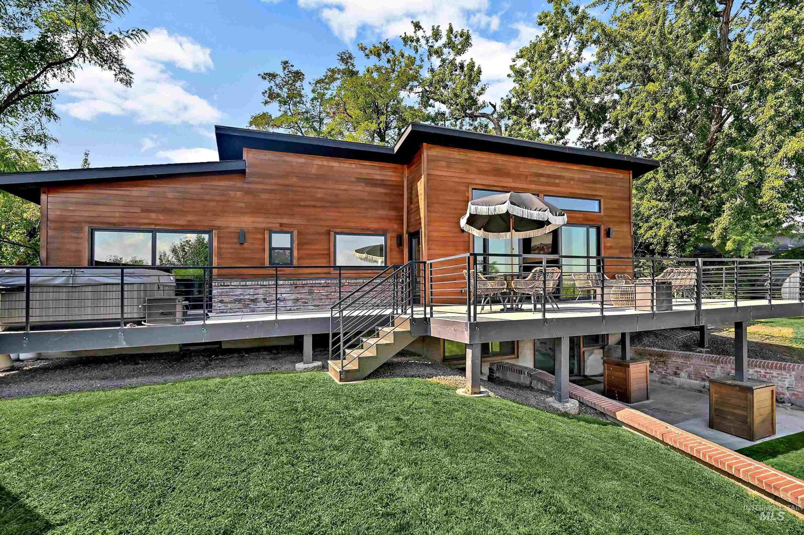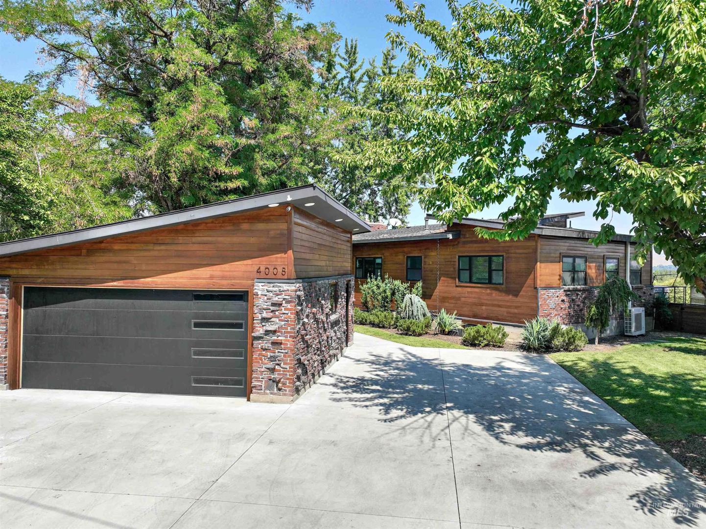 Perched on the rim of the Boise Bench in the coveted Central Rim, this mid-century modern commands iconic views of Kathryn Albertson Park, downtown Boise, Table Rock and the foothills. Fully remodeled in 2018 by HGTV’s Boise Boys, it blends modern sophistication with architectural pedigree. Clean lines, walls of windows and warm wood details create light-filled spaces that flow from the open living room with brick fireplace to a sleek kitchen with island, premium appliances and a storage wall. The main-level primary suite offers a walk-in closet, soaking tub, dual vanity and spa shower. A walkout lower level adds a second fireplace, three bedrooms, oversized laundry and bonus space. Updates include all major systems, expansive deck, hot tub, 8-person sauna and mature landscaping. With private neighborhood access to the Boise River and Greenbelt and just minutes from downtown, top restaurants and the airport, the location is as rare as the view itself.