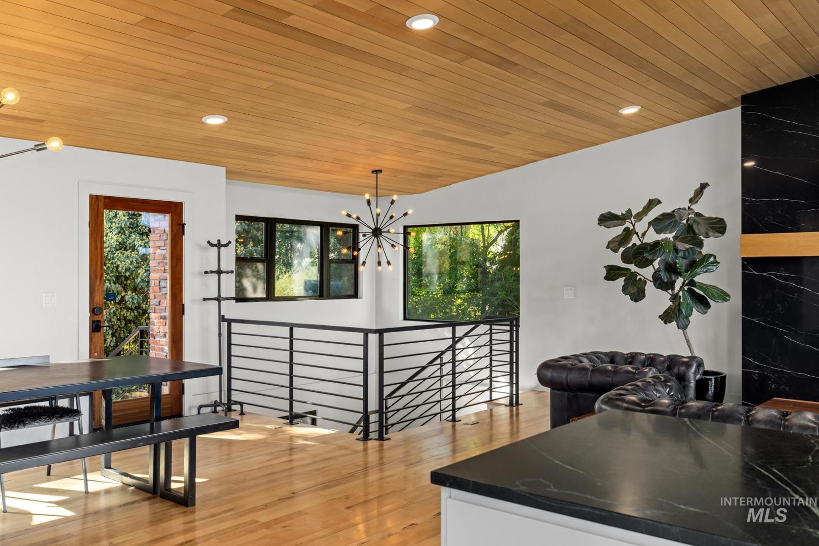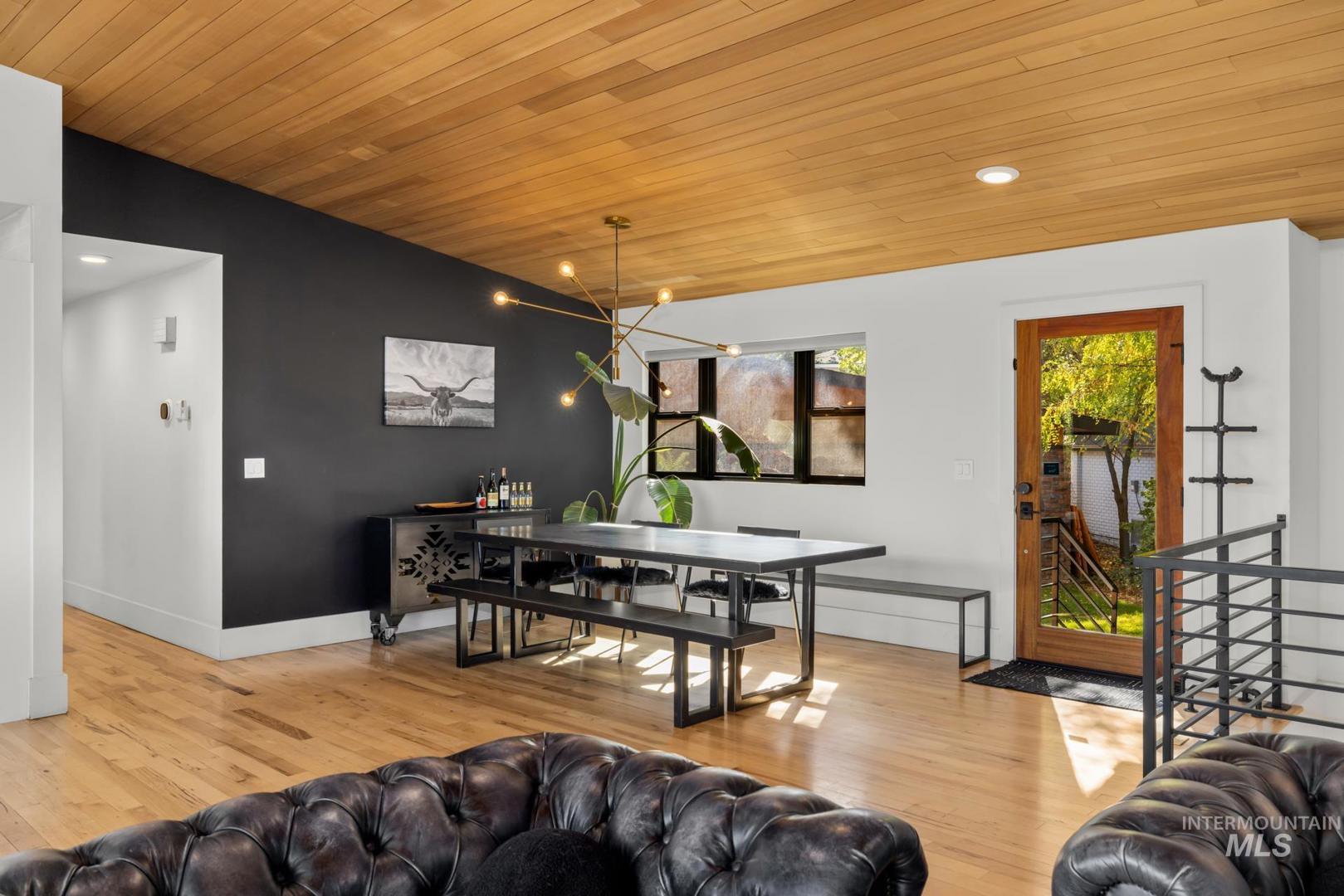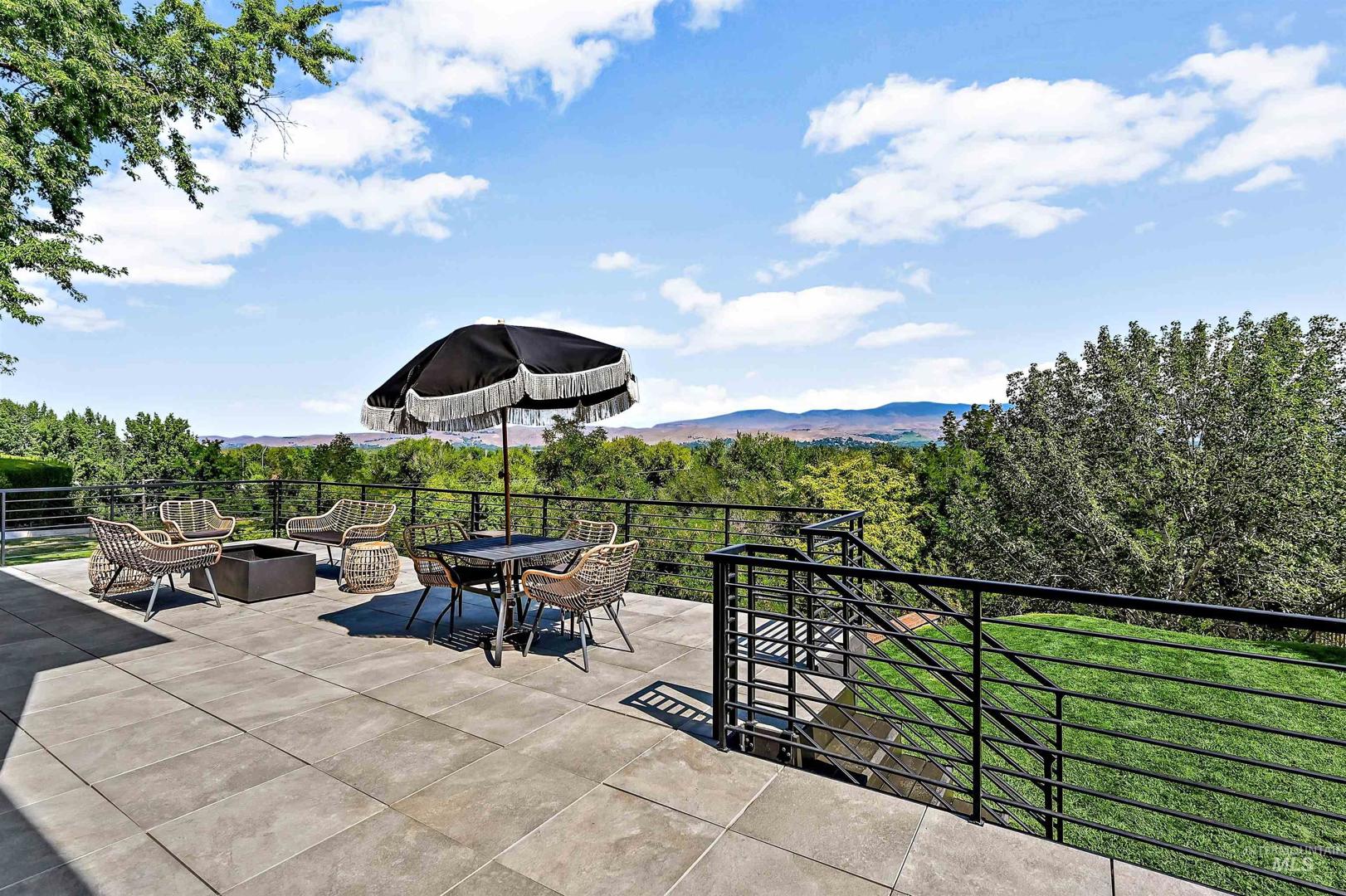 Perched on the rim of the Boise Bench in the coveted Central Rim, this mid-century modern commands iconic views of Kathryn Albertson Park, downtown Boise, Table Rock and the foothills. Fully remodeled in 2018 by HGTV’s Boise Boys, it blends modern sophistication with architectural pedigree. Clean lines, walls of windows and warm wood details create light-filled spaces that flow from the open living room with brick fireplace to a sleek kitchen with island, premium appliances and a storage wall. The main-level primary suite offers a walk-in closet, soaking tub, dual vanity and spa shower. A walkout lower level adds a second fireplace, three bedrooms, oversized laundry and bonus space. Updates include all major systems, expansive deck, hot tub, 8-person sauna and mature landscaping. With private neighborhood access to the Boise River and Greenbelt and just minutes from downtown, top restaurants and the airport, the location is as rare as the view itself.