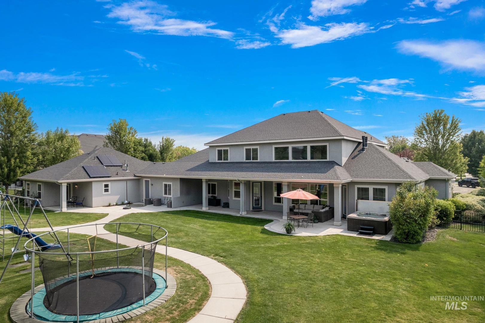 This luxury acreage home in Castlebury West boasts 5 bedrooms w/ flex/6th bedroom, formal dining room, office, Bonus/Rec Room & separate 765 sf ADU! Architectural flare showcased by arched entries, deep molding/trim, & rich knotty hickory hardwood floors. Grand open living area w/ cathedral ceiling & wall of windows flows seamlessly into gourmet kitchen, complete w/ premium appliances, granite countertops, spacious island, & large pantry—perfect for entertaining & everyday living. Private master suite offers romantic ambience w/ gas fireplace & patio access to hot tub. Master bathroom incl. double sink vanity, spa shower & jetted tub. Office equipped w/ built-in cabinets & wall-length desktops. Upper level has 3 lg bedrooms w/ built-in desks, 2 full bathrooms, loft area, bonus room overlooking Great Room & play nook w/ in-wall slide to main level! Covered back patio overlooks lush landscaped yard w/ trampoline, play equip, & cycling path as well as garden area & fruit orchard.