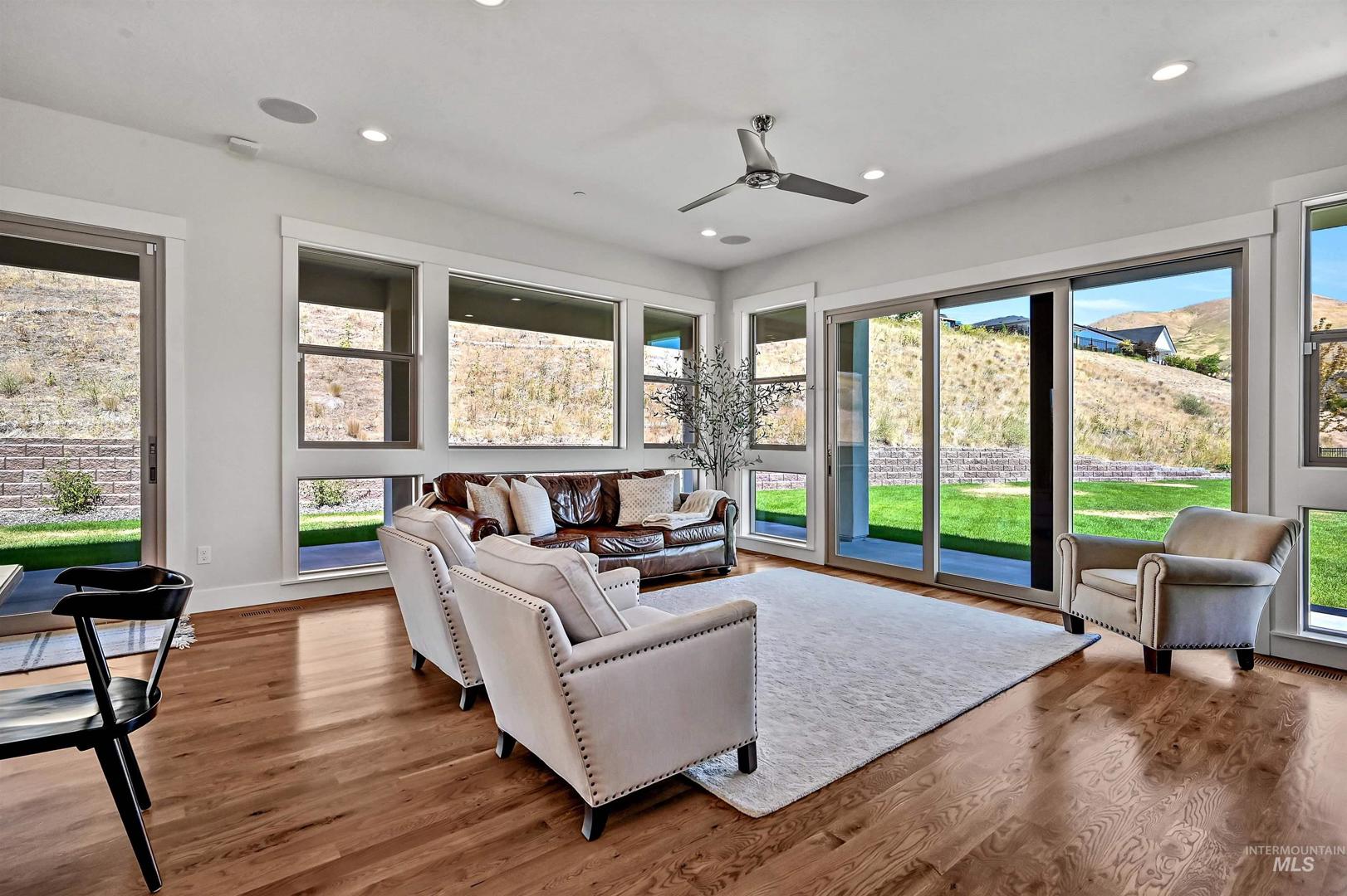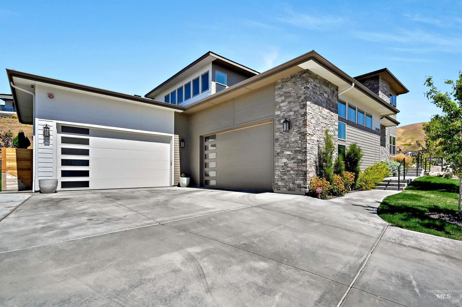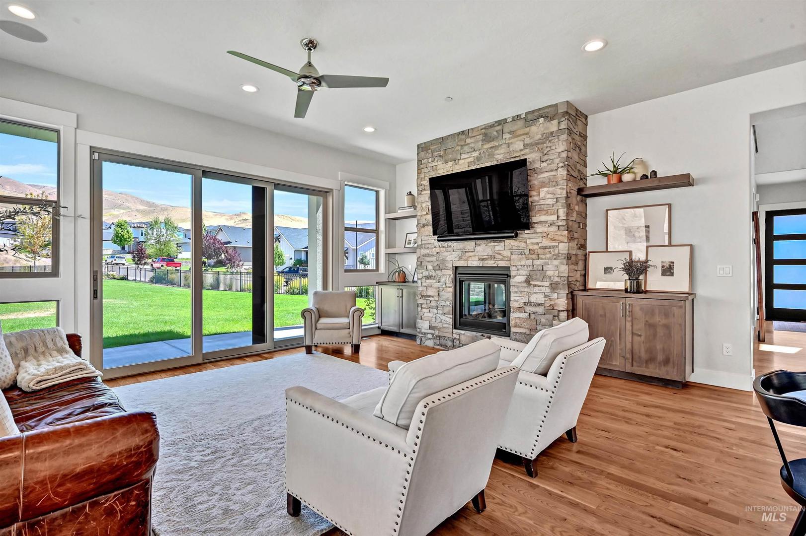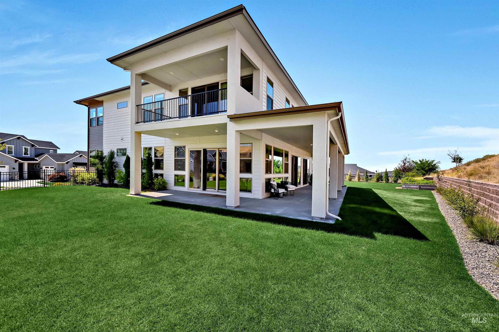 This beautiful modern home with a true 4 car garage, sitting on .92 acres in the highly desirable Harris North community, has been meticulously maintained. As you enter, you are greeted by elegant hardwood floors that carry throughout the main living spaces. The impressive floor-to-ceiling stone fireplace is the centerpiece of the great room, which opens into the dining area and a beautiful kitchen with tiled backsplash extending to the ceiling. The main level offers an open-concept design with many windows and three large telescoping sliding doors allowing for great natural light and leads to two spacious covered patios—perfect for indoor/outdoor entertaining. Additionally, you’ll find a generous sized office/den and a welcoming guest suite. The primary bedroom is a true retreat, featuring access to a private covered balcony, a luxurious ensuite with an oversized shower, separate soaking tub, dual walk-in closets. Two more bedrooms and a sizable bonus area complete this exceptional home.