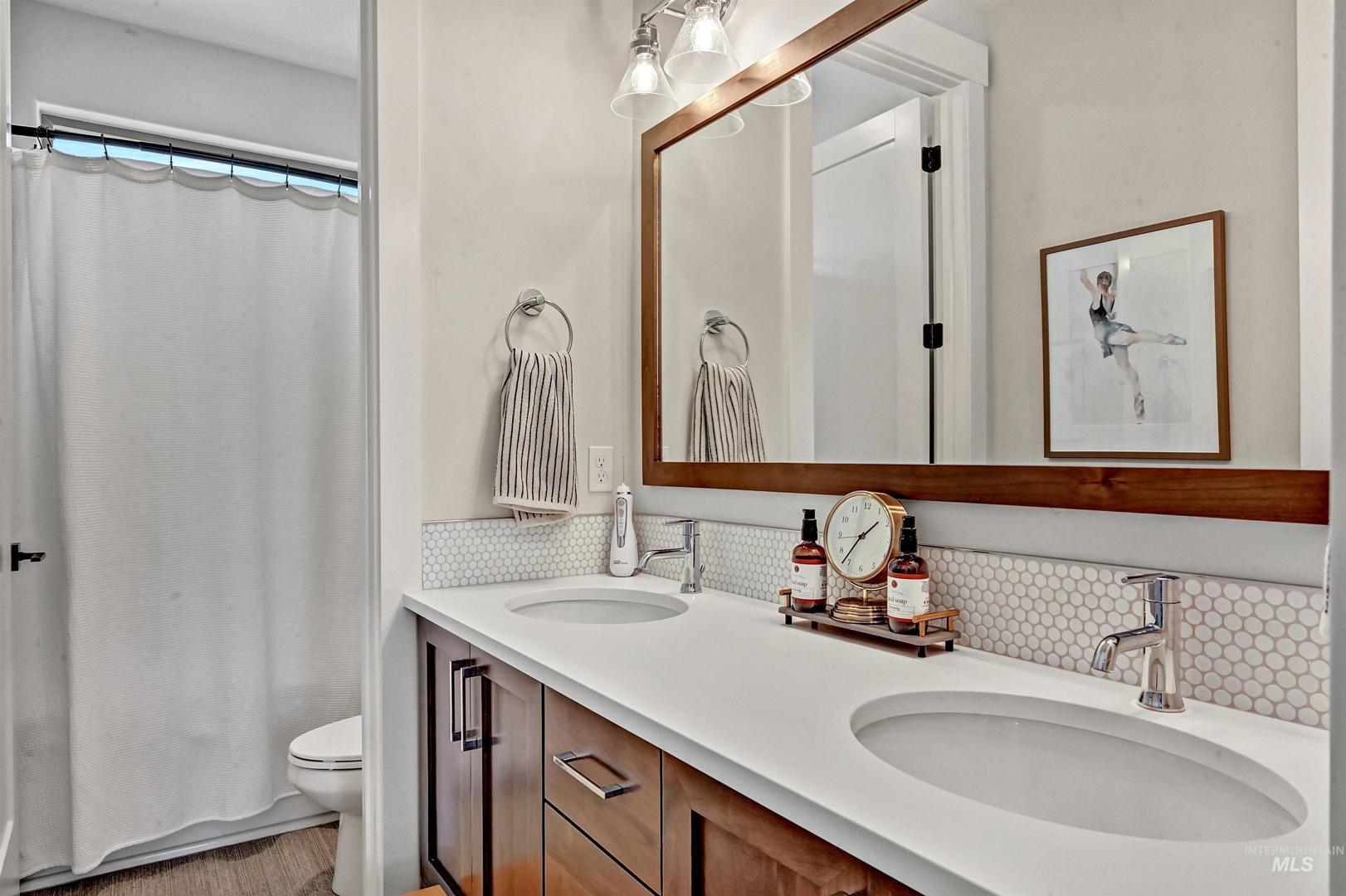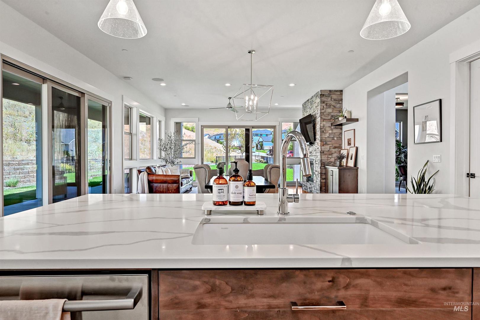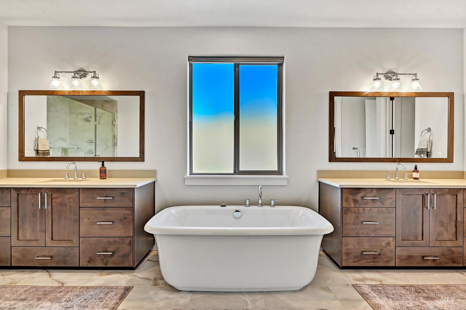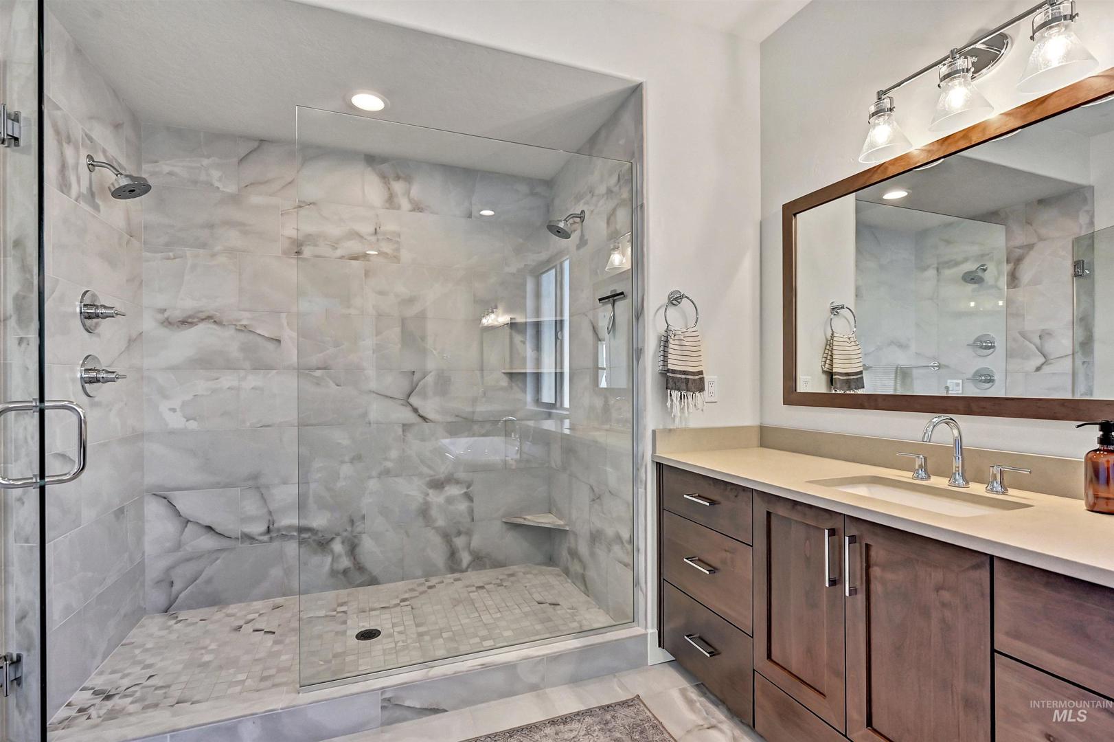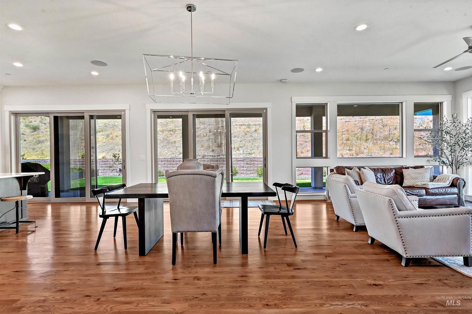 This beautiful modern home with a true 4 car garage, sitting on .92 acres in the highly desirable Harris North community, has been meticulously maintained. As you enter, you are greeted by elegant hardwood floors that carry throughout the main living spaces. The impressive floor-to-ceiling stone fireplace is the centerpiece of the great room, which opens into the dining area and a beautiful kitchen with tiled backsplash extending to the ceiling. The main level offers an open-concept design with many windows and three large telescoping sliding doors allowing for great natural light and leads to two spacious covered patios—perfect for indoor/outdoor entertaining. Additionally, you’ll find a generous sized office/den and a welcoming guest suite. The primary bedroom is a true retreat, featuring access to a private covered balcony, a luxurious ensuite with an oversized shower, separate soaking tub, dual walk-in closets. Two more bedrooms and a sizable bonus area complete this exceptional home.