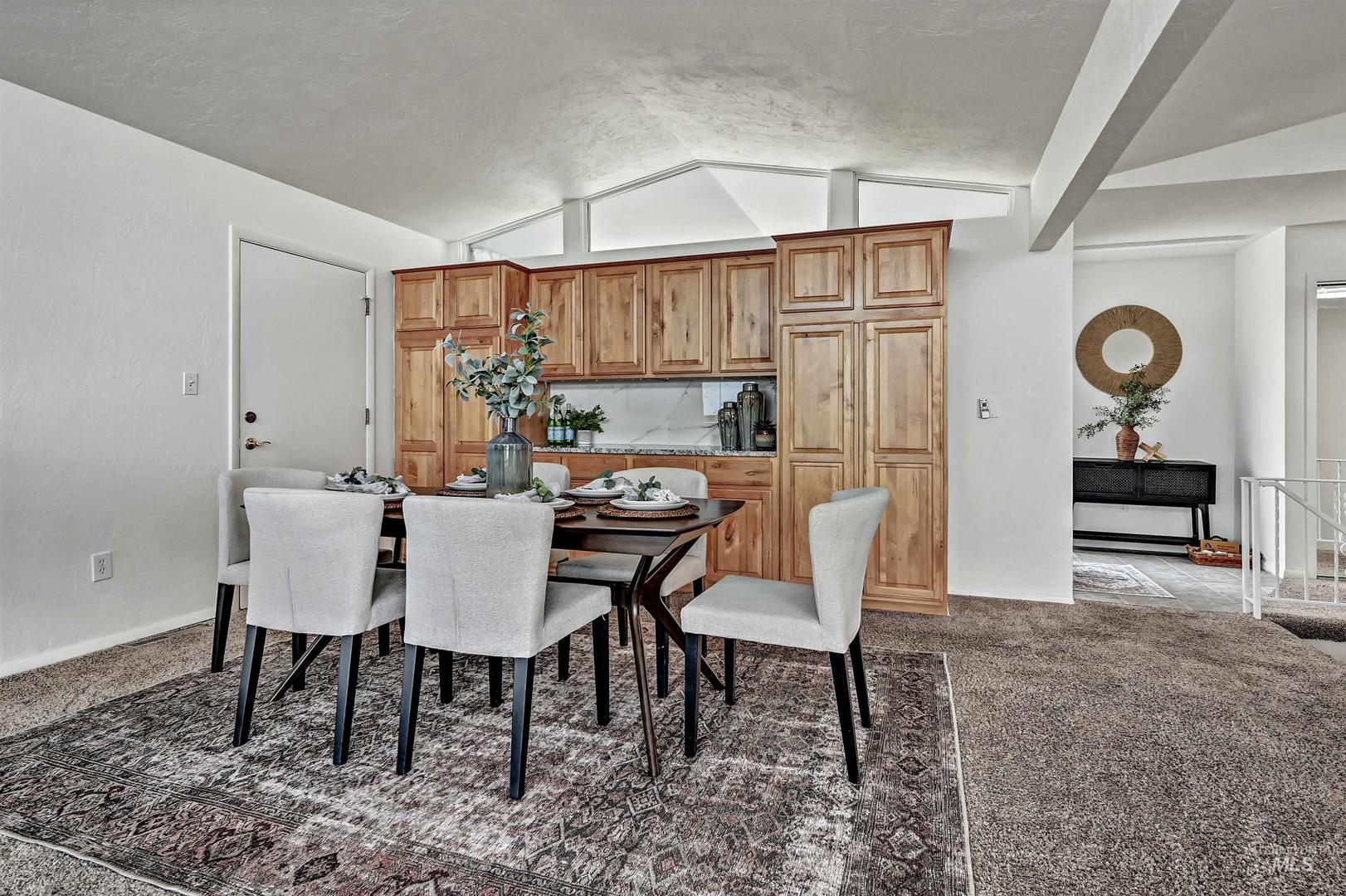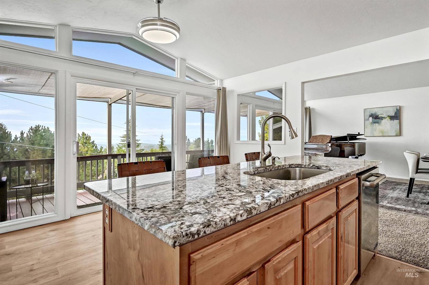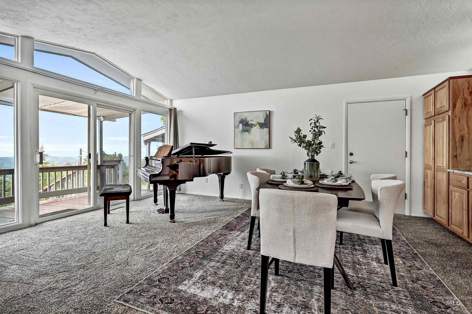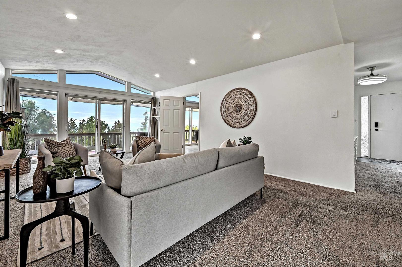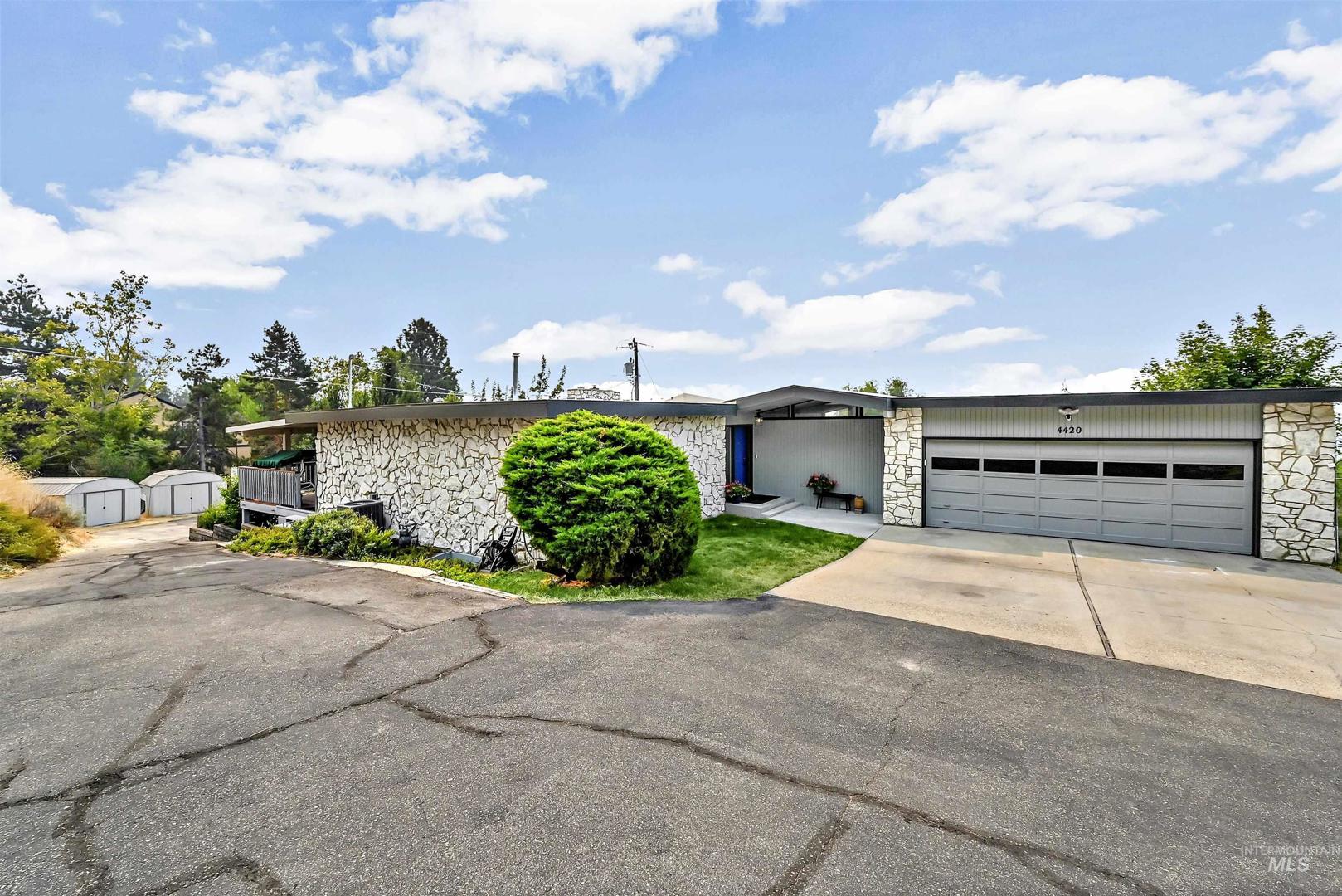 Stunning North Boise Foothills multi-generational home with sweeping panoramic views of downtown Boise and the Owyhee Mountains. This Mid-Century Modern gem features striking architecture, a distinctive roofline, and rare white onyx exterior stonework. Spacious living areas include separate quarters in the daylight basement—ideal for extended family or potential rental income. Enjoy year-round entertaining on the expansive wraparound deck, offering both covered and sunlit spaces to soak in the incredible views. Recent upgrades include a newer roof, new AC and coil, and a new water heater—leaving the heavy lifting done and ready for your finishing touches to restore this Boise masterpiece. Appliances include 2 refrigerators, 2 washer/dryer sets, 2 dishwashers, and 2 stoves—perfectly set up for multi-generational living or a private downstairs unit with its own carport.