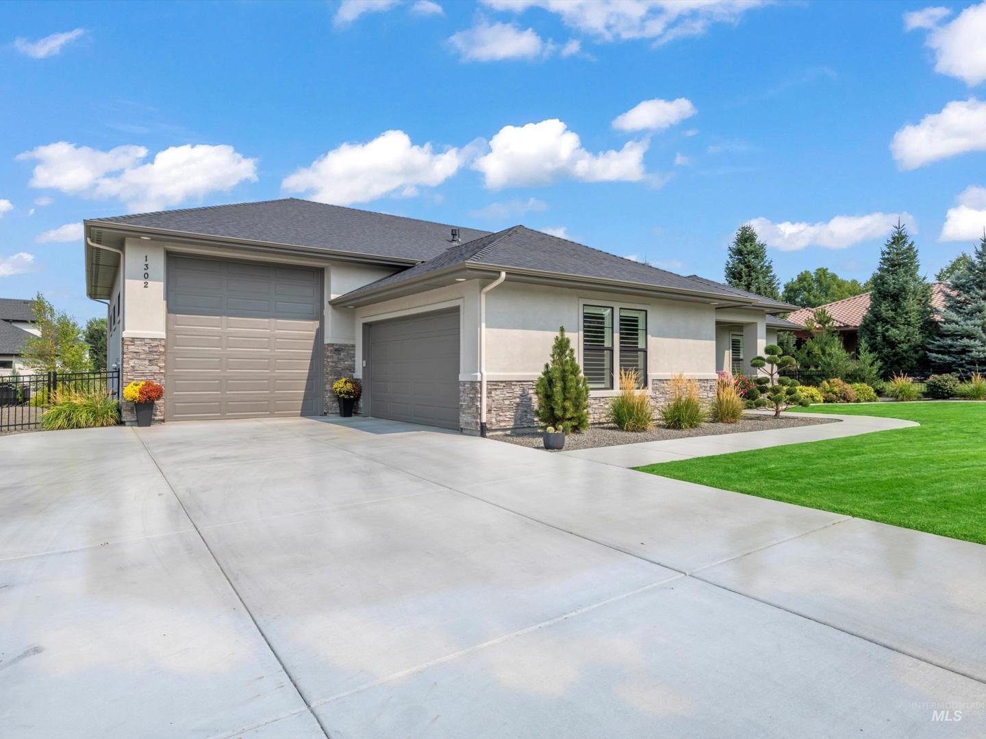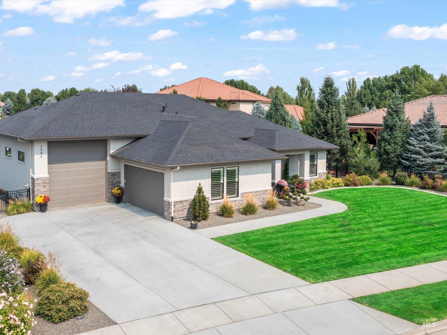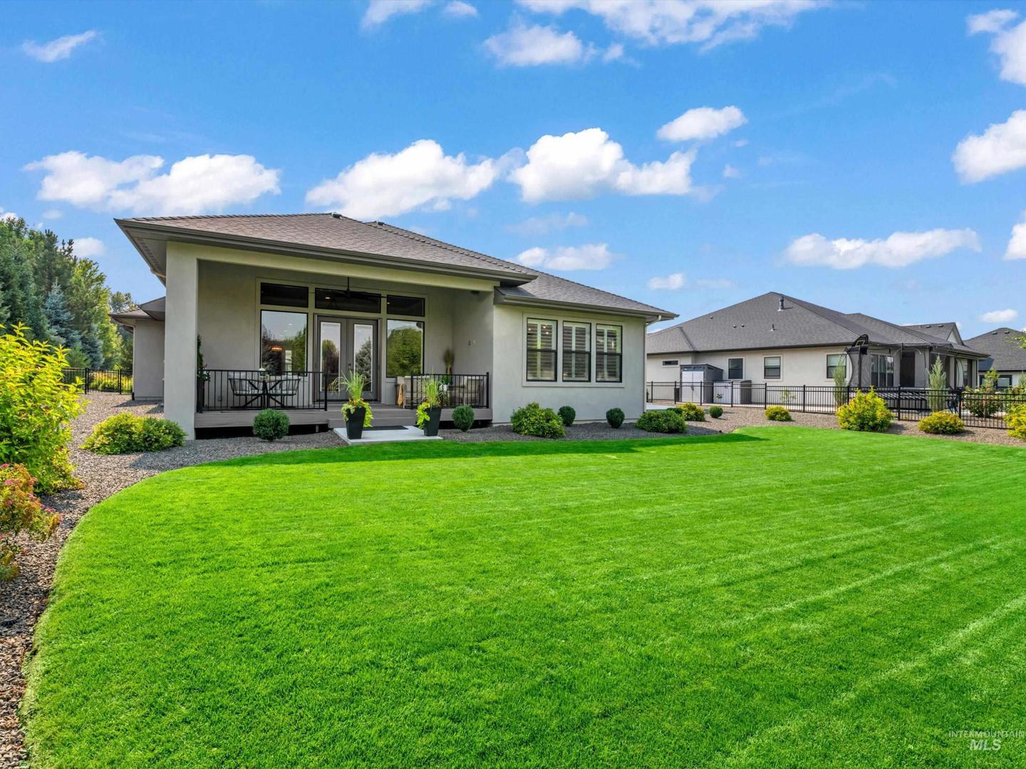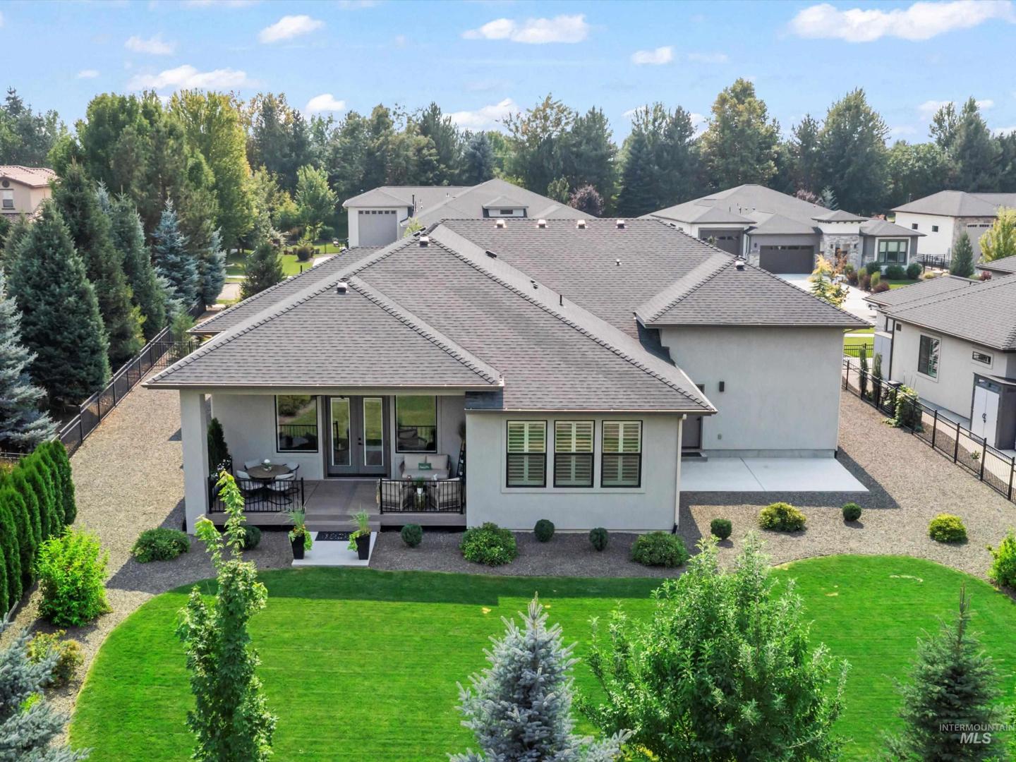 Welcome to one of Eagle’s most coveted enclaves, Tramonto, a 13-home luxury community tucked near downtown, top schools, dining, shopping, and scenic paths. This James Clyde-inspired custom home offers exceptional quality, comfort, and timeless design with adventure-ready features like a large RV bay or shop. Enjoy gleaming hardwood floors, custom window shutters, soaring ceilings, abundant natural light, and stunning backyard views. The open-concept, split-bedroom layout offers an office/flex room, seamless flow, privacy, and open sightlines to stay connected with guests when entertaining. A chef’s kitchen features top-tier appliances, gas cooktop w/griddle, double ovens, quartz counters, and a spacious walk-in pantry. The spa-like primary suite offers serene backyard views, walk-through large closet, dual vanities, soaker tub, and a walk-in dual head shower. Step into your tranquil outdoor oasis with lush landscaping, no immediate rear neighbors, covered patio Trex deck w/TV mount, BBQ gas line, and more!