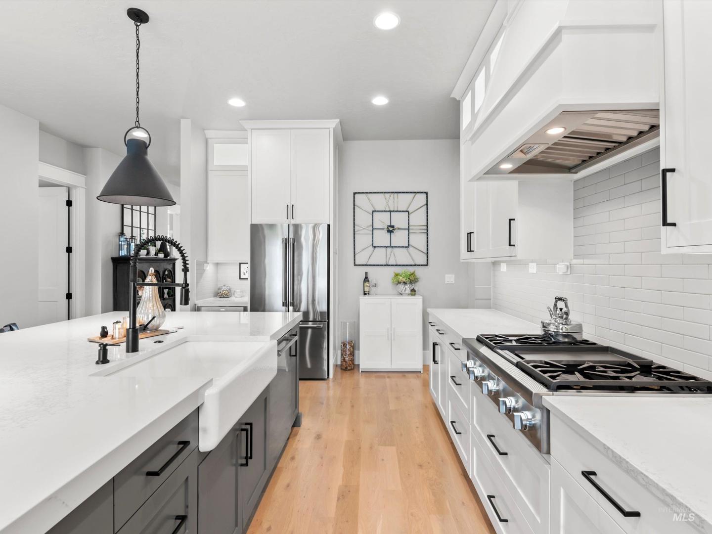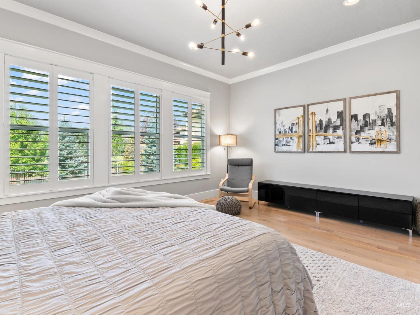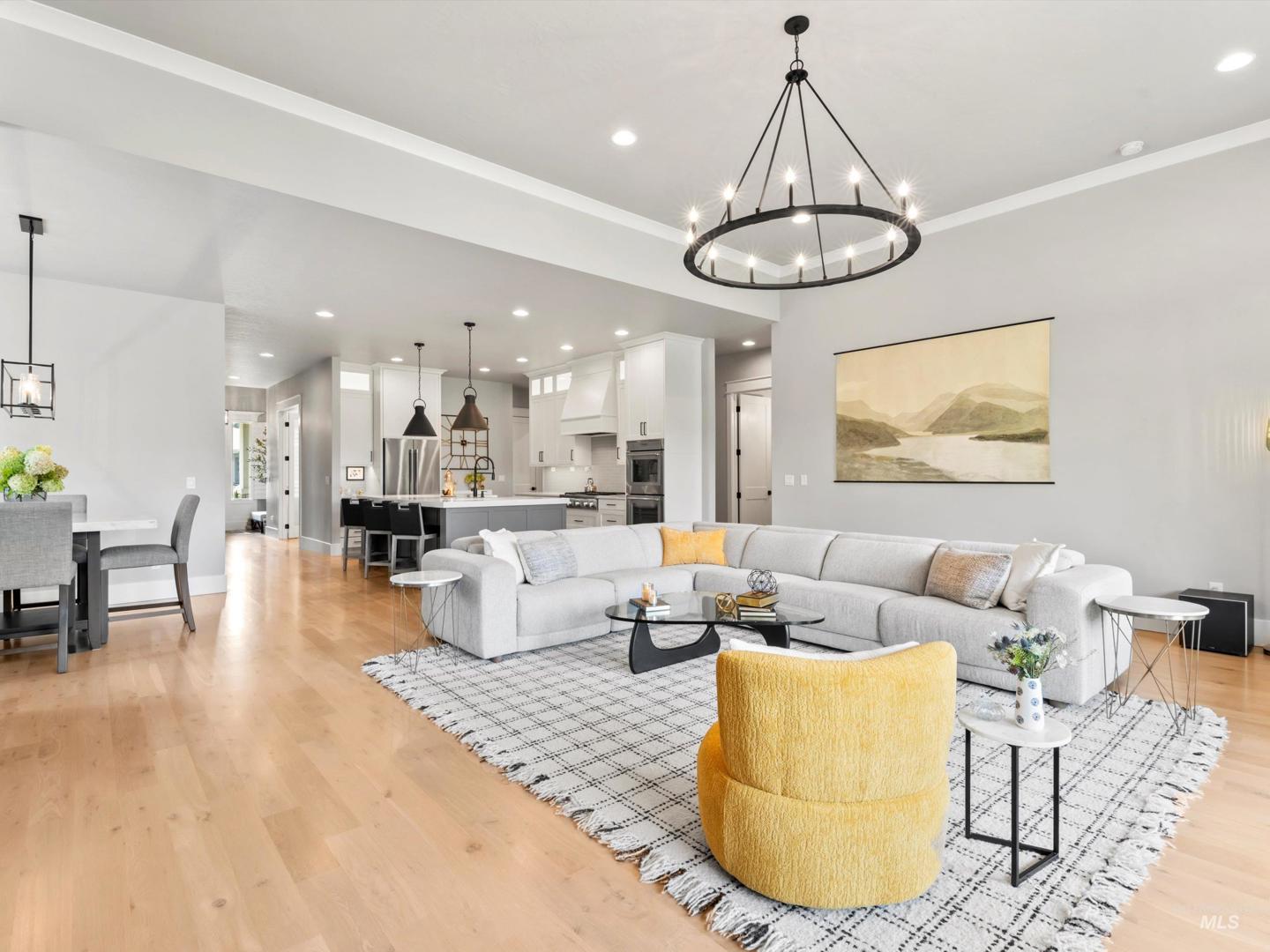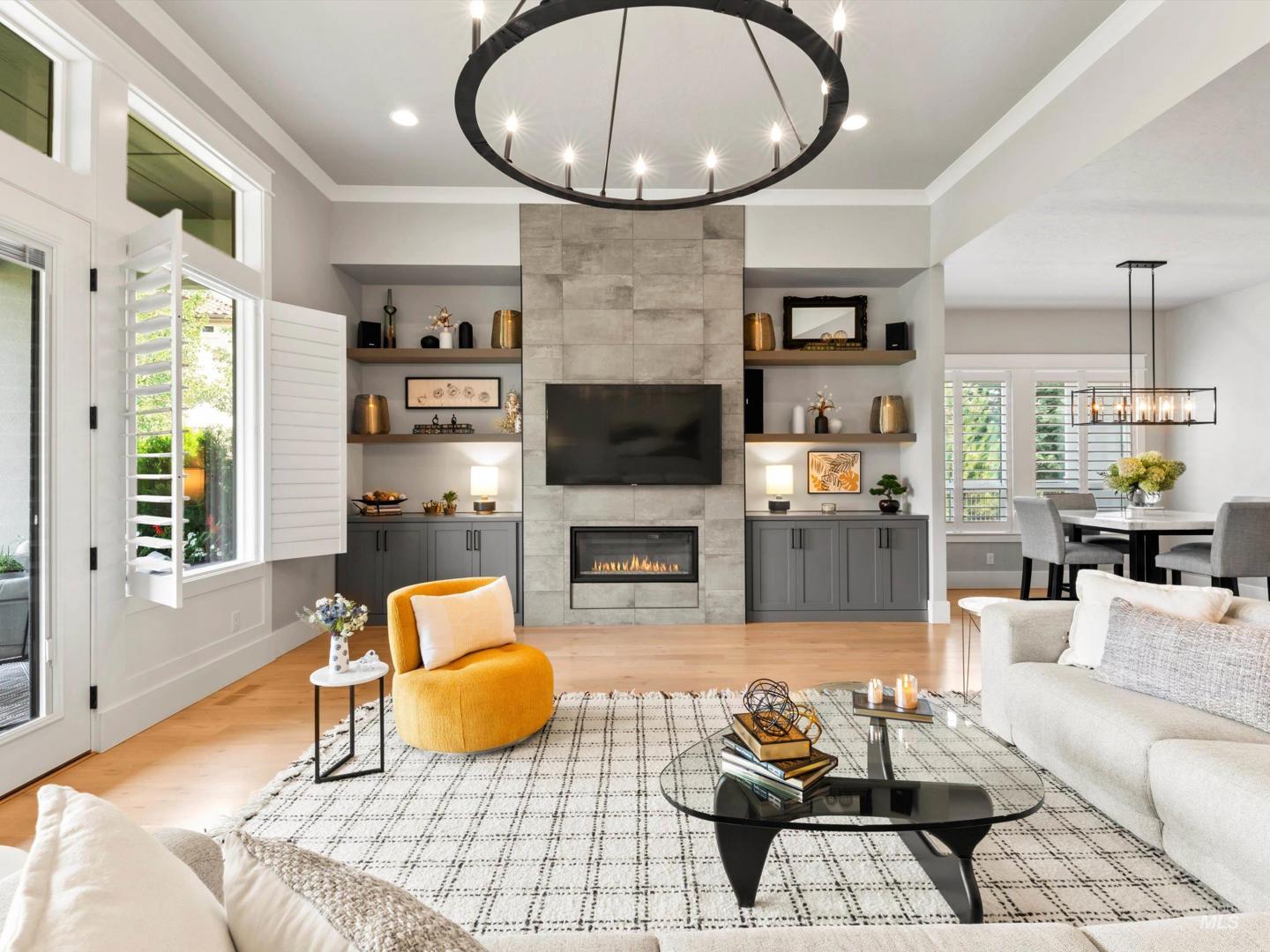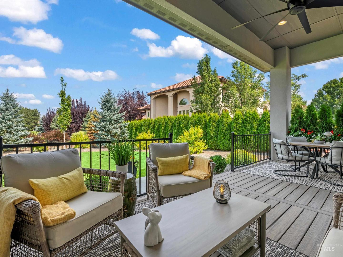 Welcome to one of Eagle’s most coveted enclaves, Tramonto, a 13-home luxury community tucked near downtown, top schools, dining, shopping, and scenic paths. This James Clyde-inspired custom home offers exceptional quality, comfort, and timeless design with adventure-ready features like a large RV bay or shop. Enjoy gleaming hardwood floors, custom window shutters, soaring ceilings, abundant natural light, and stunning backyard views. The open-concept, split-bedroom layout offers an office/flex room, seamless flow, privacy, and open sightlines to stay connected with guests when entertaining. A chef’s kitchen features top-tier appliances, gas cooktop w/griddle, double ovens, quartz counters, and a spacious walk-in pantry. The spa-like primary suite offers serene backyard views, walk-through large closet, dual vanities, soaker tub, and a walk-in dual head shower. Step into your tranquil outdoor oasis with lush landscaping, no immediate rear neighbors, covered patio Trex deck w/TV mount, BBQ gas line, and more!