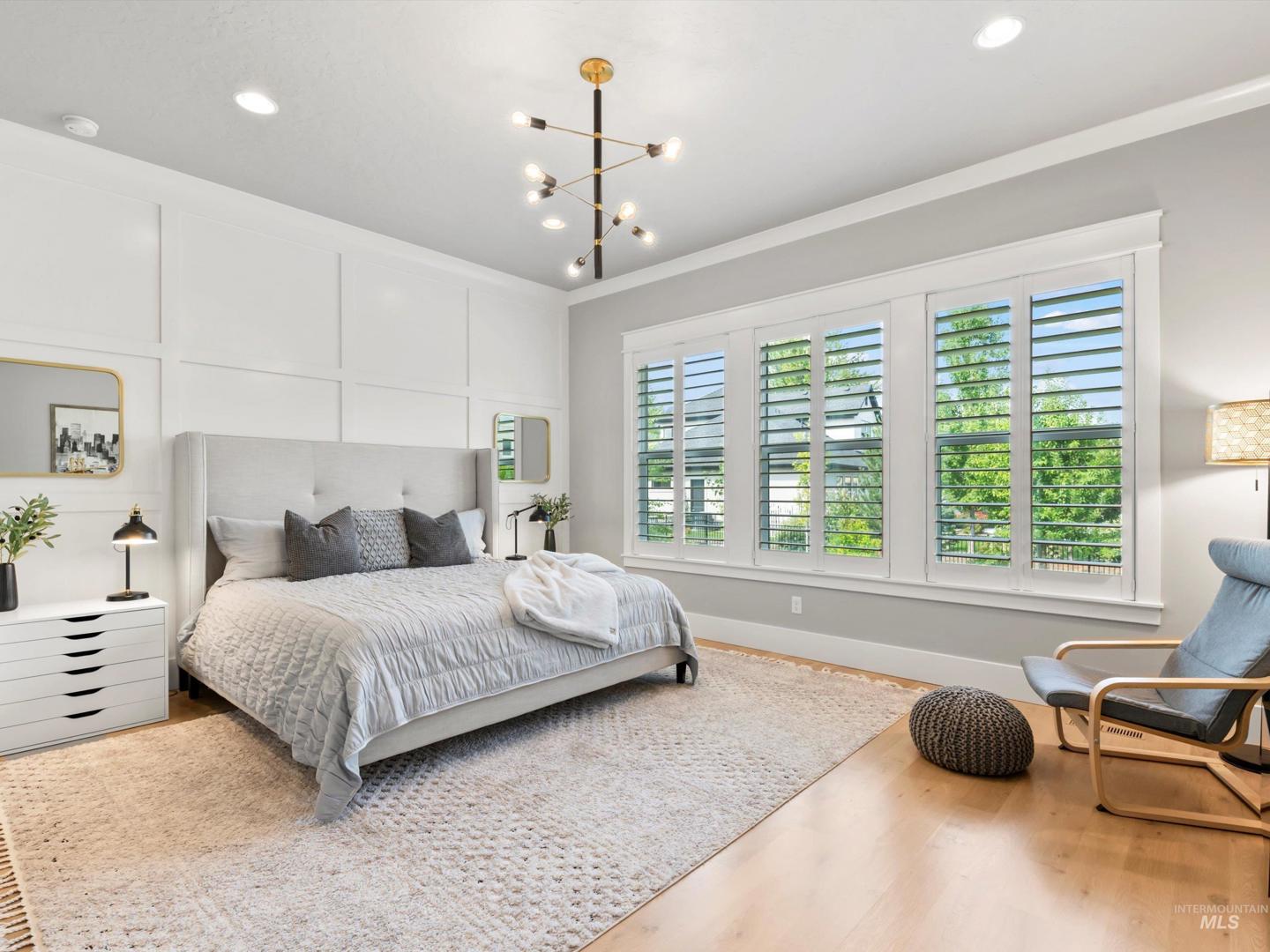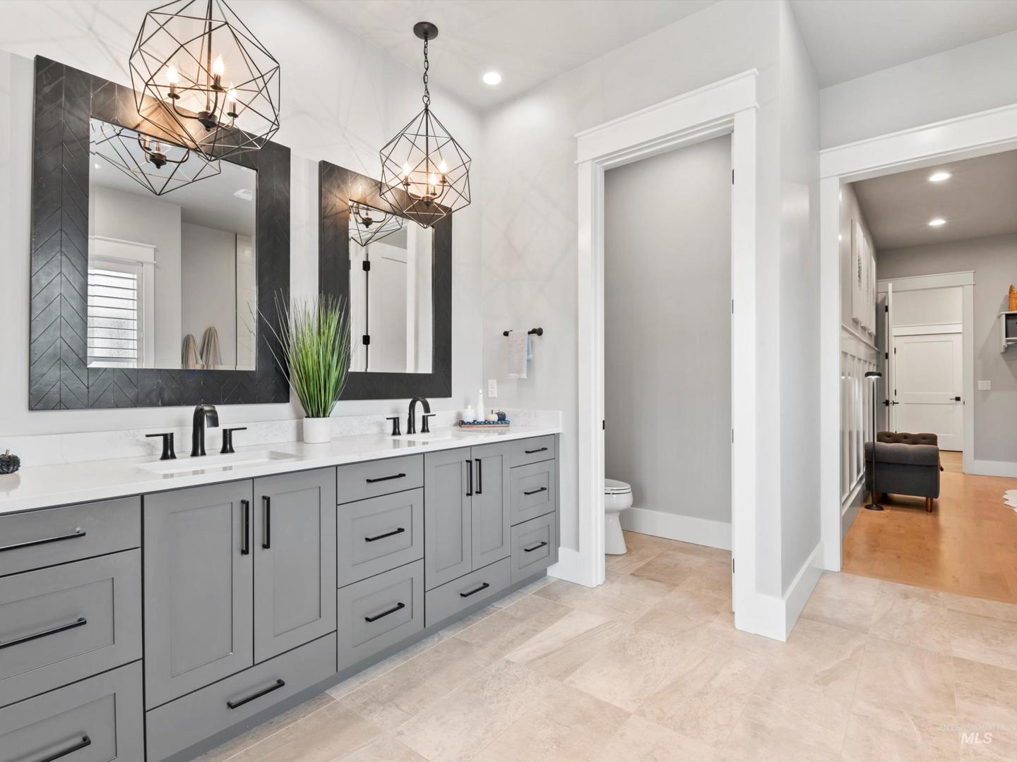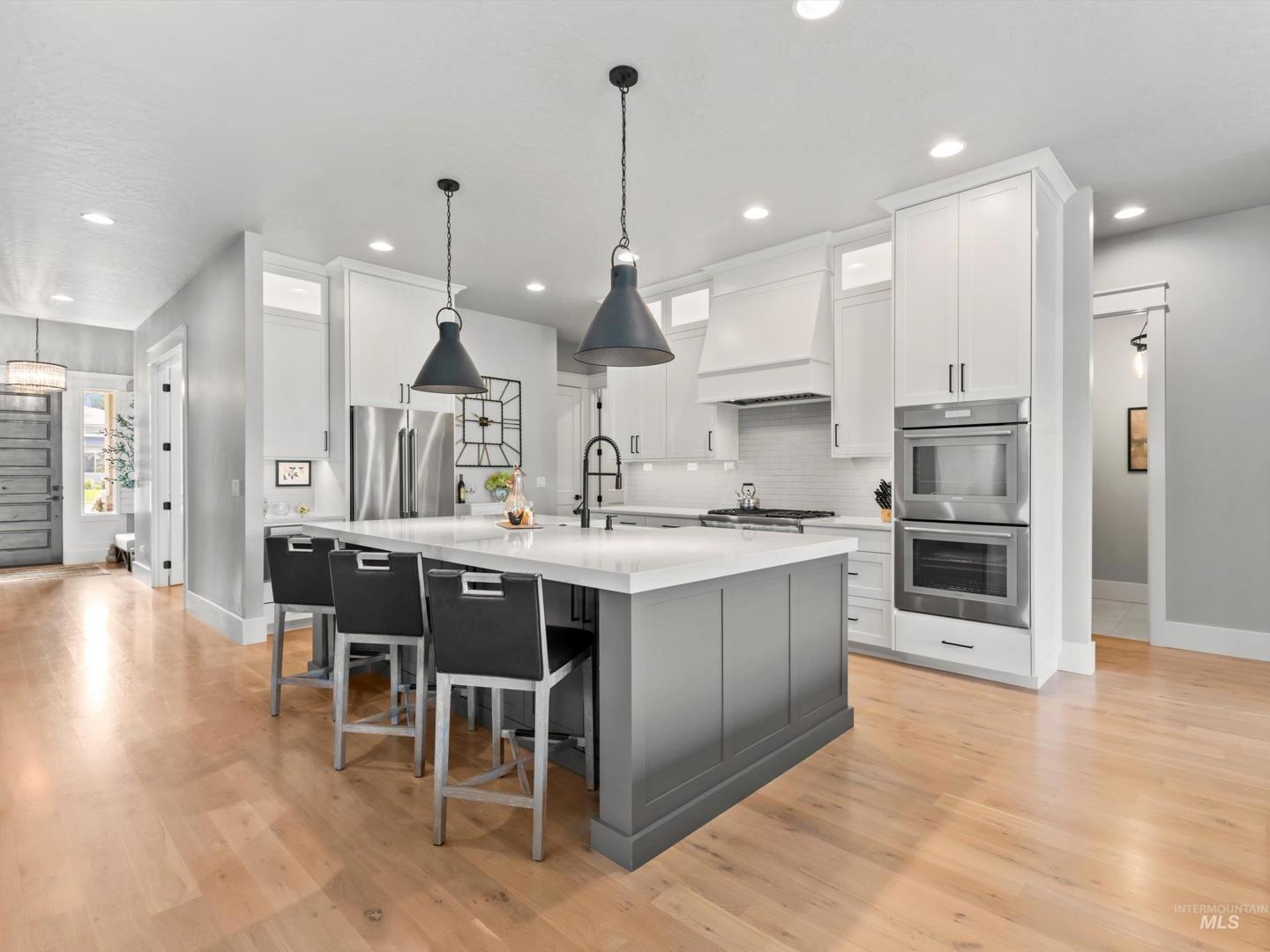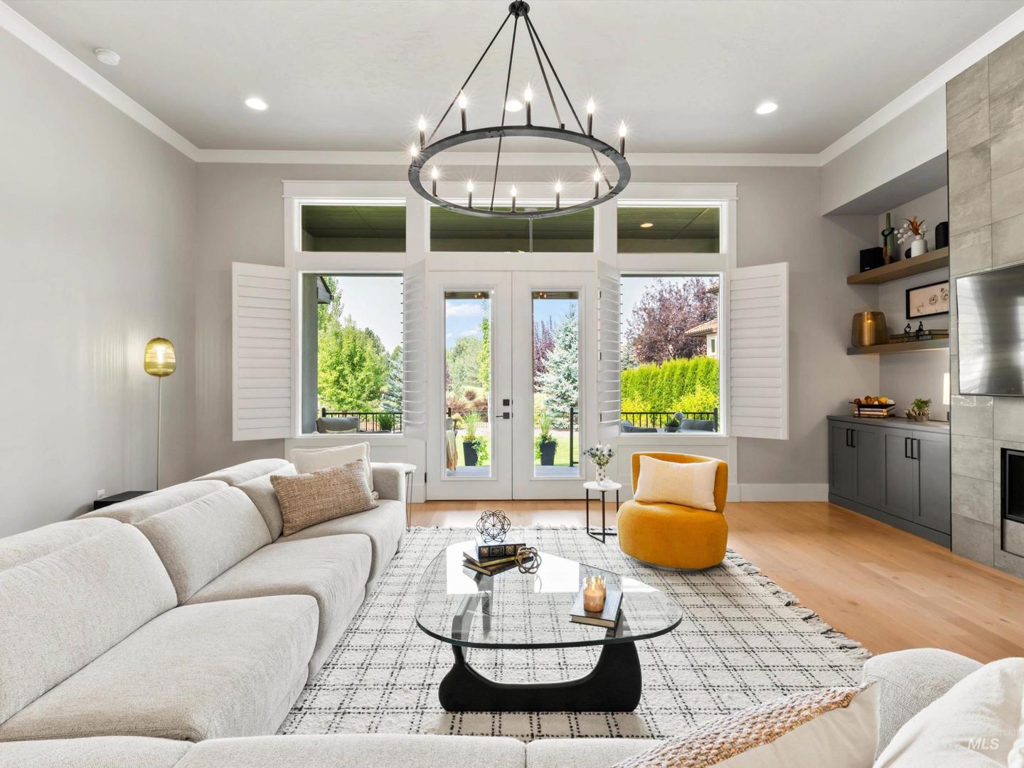 Welcome to one of Eagle’s most coveted enclaves, Tramonto, a 13-home luxury community tucked near downtown, top schools, dining, shopping, and scenic paths. This James Clyde-inspired custom home offers exceptional quality, comfort, and timeless design with adventure-ready features like a large RV bay or shop. Enjoy gleaming hardwood floors, custom window shutters, soaring ceilings, abundant natural light, and stunning backyard views. The open-concept, split-bedroom layout offers an office/flex room, seamless flow, privacy, and open sightlines to stay connected with guests when entertaining. A chef’s kitchen features top-tier appliances, gas cooktop w/griddle, double ovens, quartz counters, and a spacious walk-in pantry. The spa-like primary suite offers serene backyard views, walk-through large closet, dual vanities, soaker tub, and a walk-in dual head shower. Step into your tranquil outdoor oasis with lush landscaping, no immediate rear neighbors, covered patio Trex deck w/TV mount, BBQ gas line, and more!
