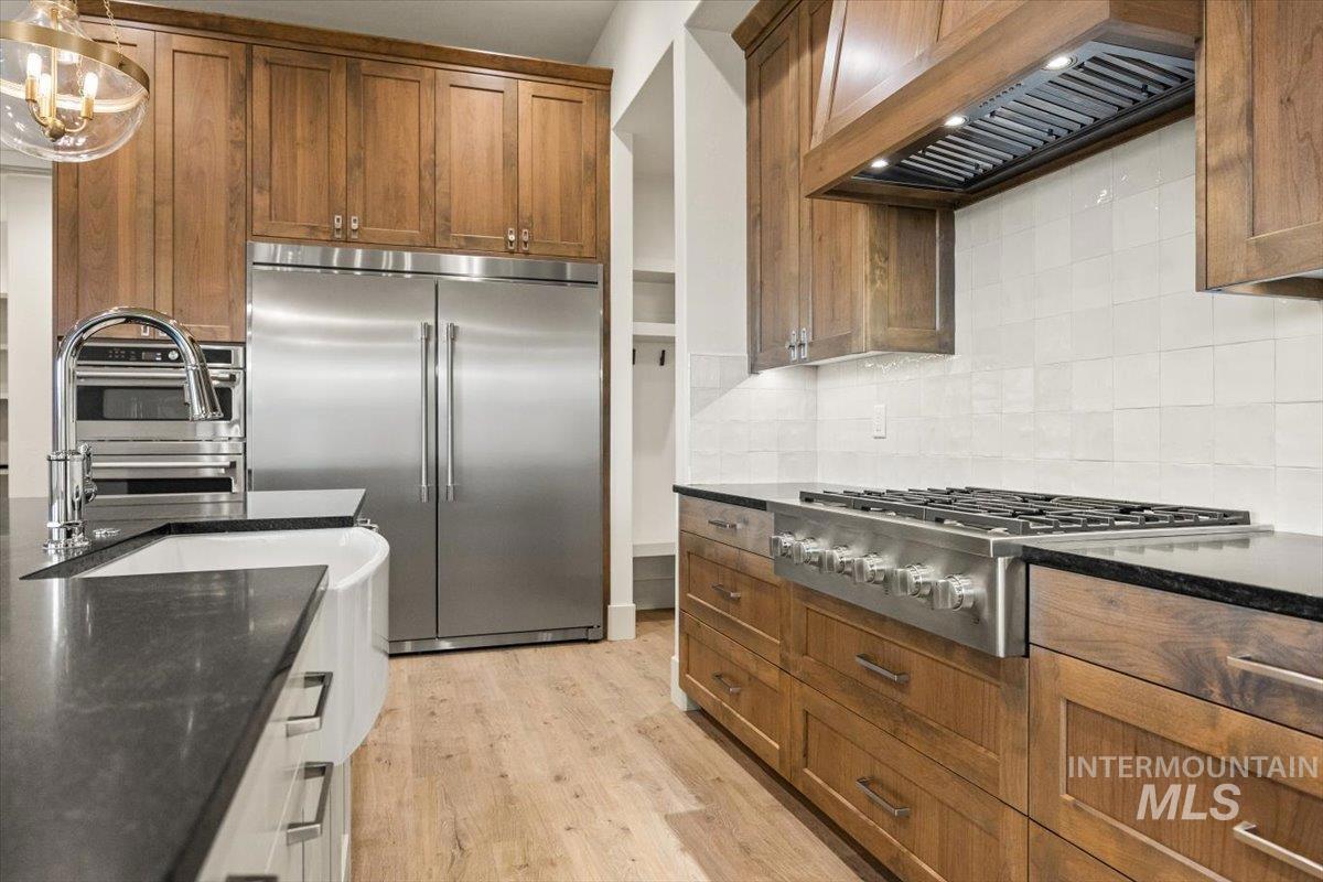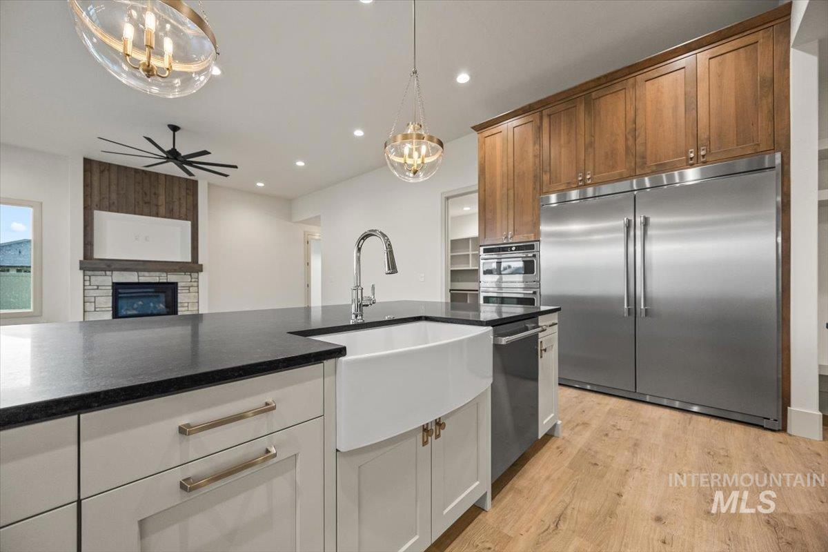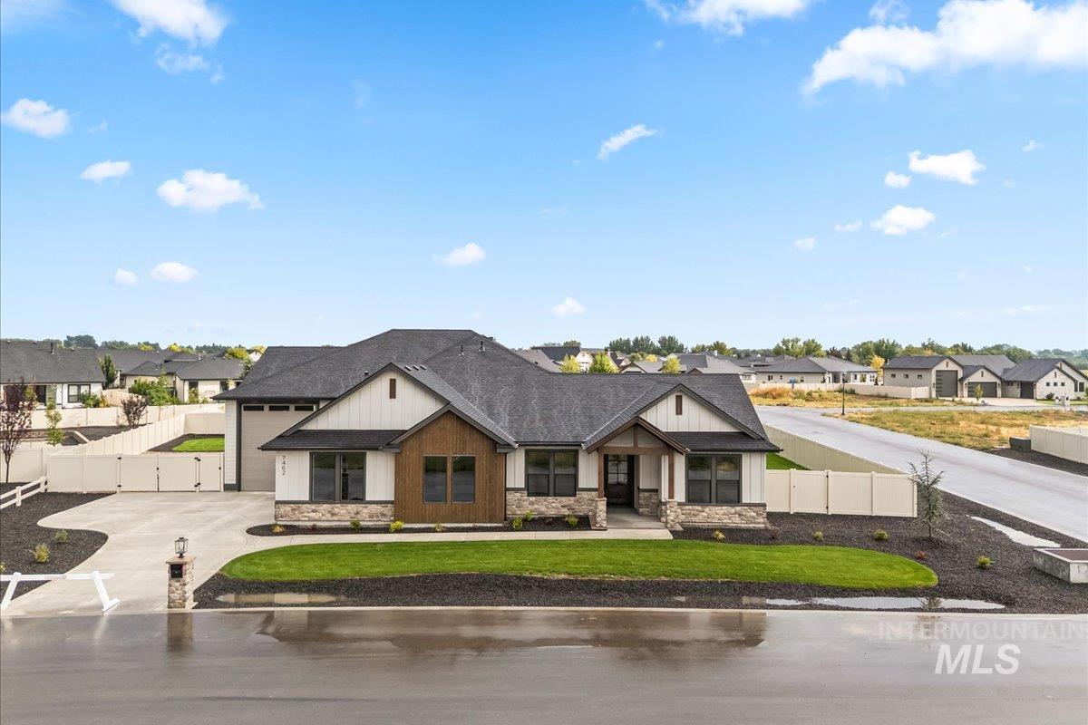 From the striking blend of stone and wood accents to the expansive 51` RV bay, the attention to detail and craftsmanship by Prominent Homes shines throughout. Step inside to a light-filled great room with soaring ceilings, statement fireplace, and large sliding doors that lead to a private, covered back patio, offering views of the fully landscaped 0.470-acre corner lot w/room for add`l toys or shop. The open kitchen boasts custom cabinetry, sleek dark quartz countertops, butler`s pantry, and high-end stainless steel appliances, incl a side-by-side fridge/freezer. Beautiful connecting dining space incorporating wood accents. Each bedroom includes its own full bath, ensuring privacy for all. The luxurious primary suite offers dual vanities, a freestanding tub, a large tile shower, and a walk-in closet with direct access to the laundry room. Don`t miss the dedicated den off the entryway providing added flexibility. Located in the sought-after Brittania Heights with easy access to the 10-Mile Interchange.
