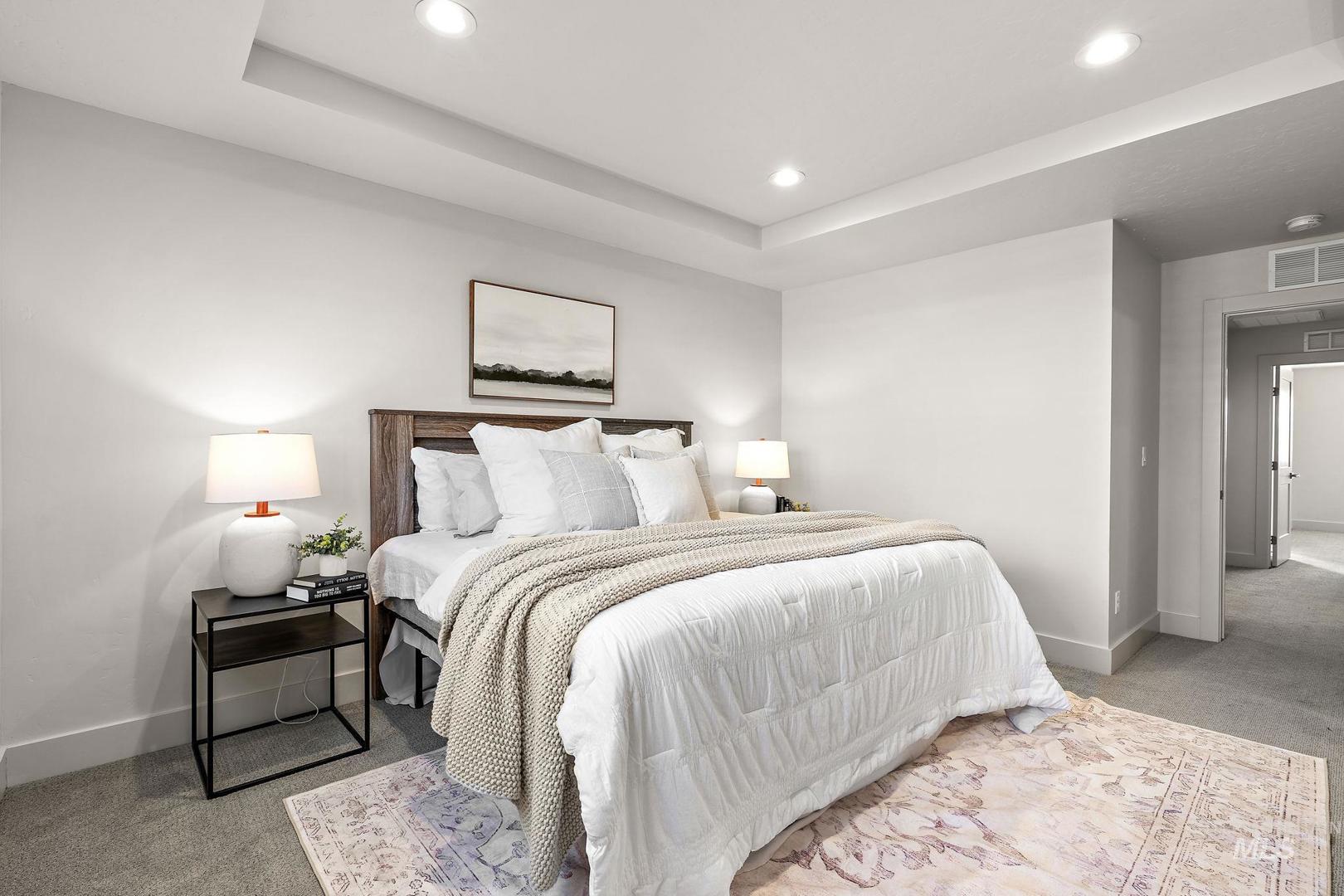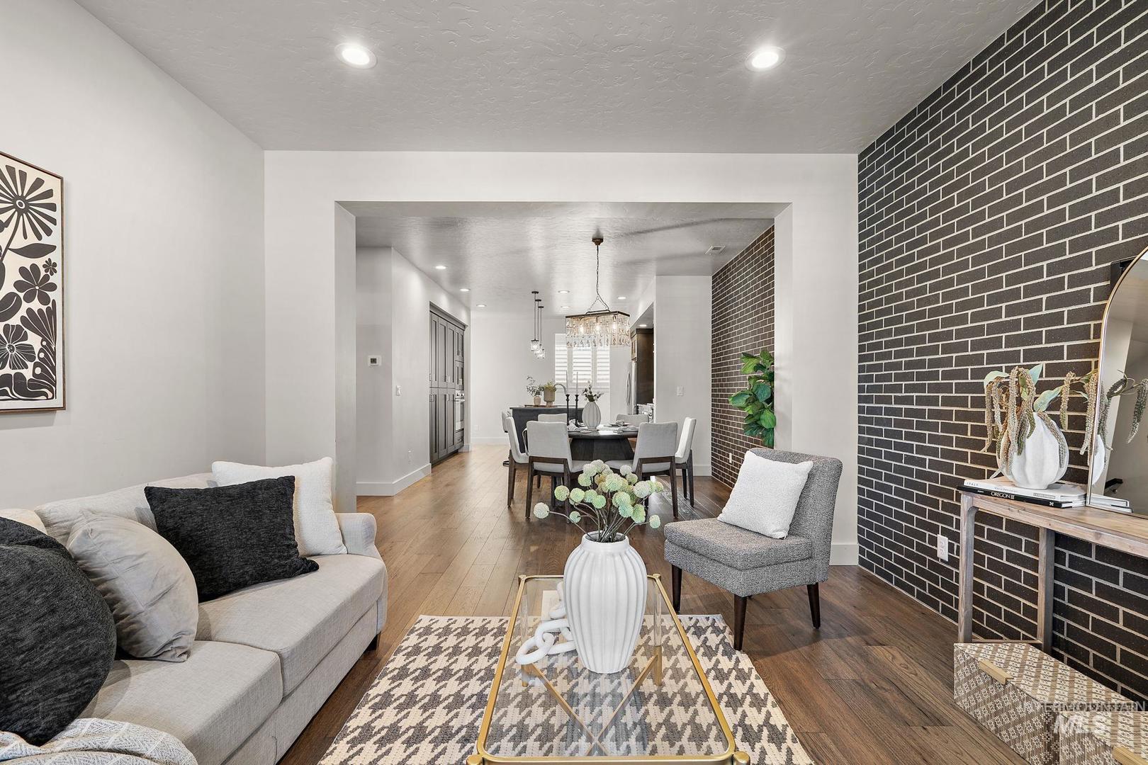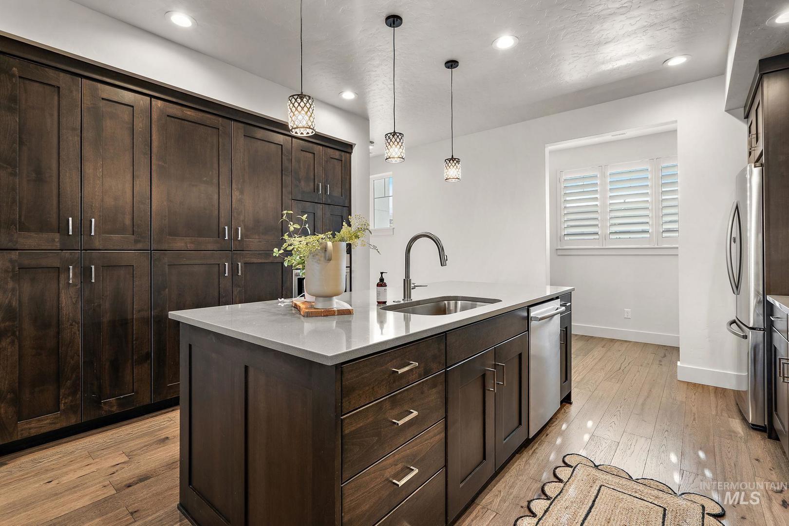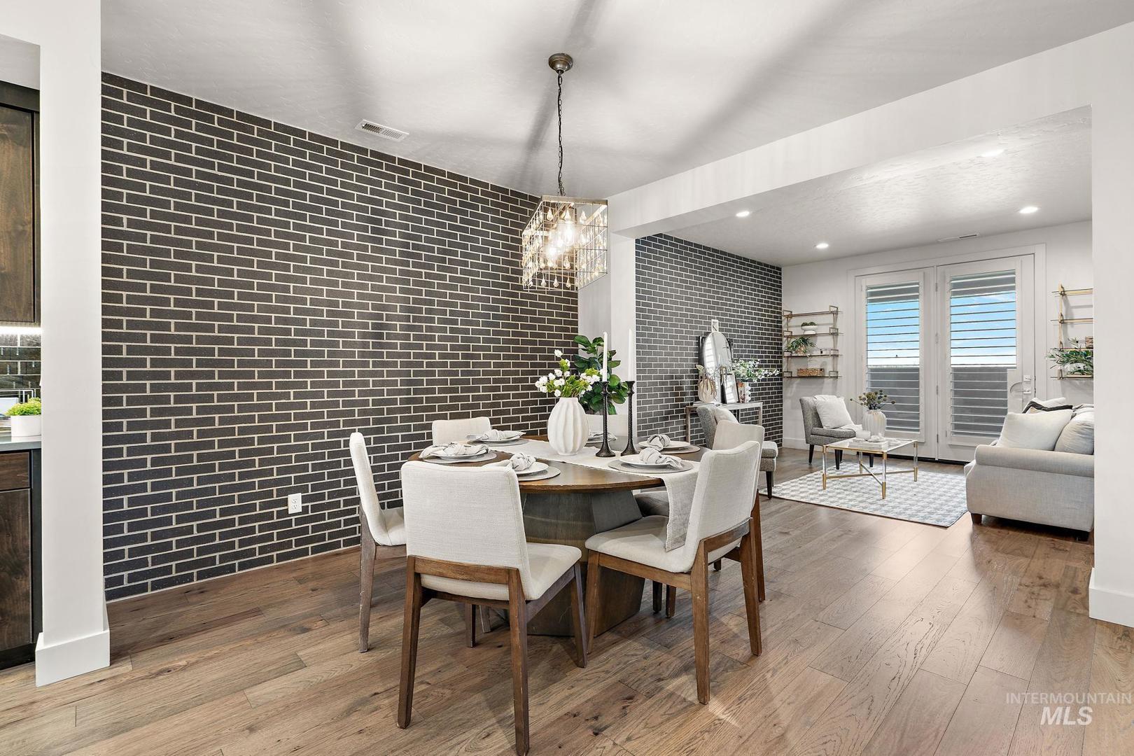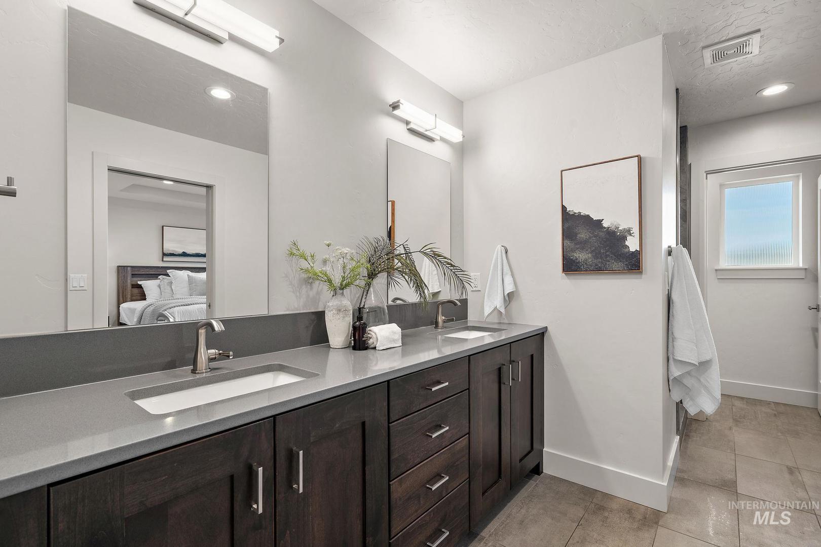 Stylish Harris Ranch Townhome Beautifully designed 3-bedroom, 3.5-bath townhome with oversized 2-car garage in the sought-after BLVD at Harris Ranch. Showcasing gorgeous, up-to-the-minute finishes, this home features quartz countertops, custom cabinetry, custom plantation shutters, stunning light fixtures, and a chic brick accent wall that brings an urban loft vibe. Dual primary suites upstairs plus a private bedroom and full bath on the main level create a versatile layout perfect for comfort and privacy. Open gathering areas make entertaining easy, while the low-maintenance design offers a lock-and-leave lifestyle. Located in the heart of Harris Ranch with premier access to community pools, the Boise River Greenbelt, foothills Ridge-to-Rivers trails, shops, restaurants, and the Idaho Shakespeare Festival. Immaculately maintained and move-in ready—this home truly shows like new!