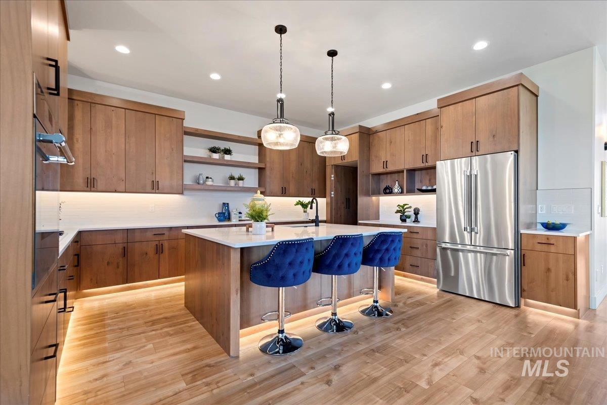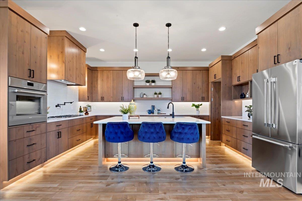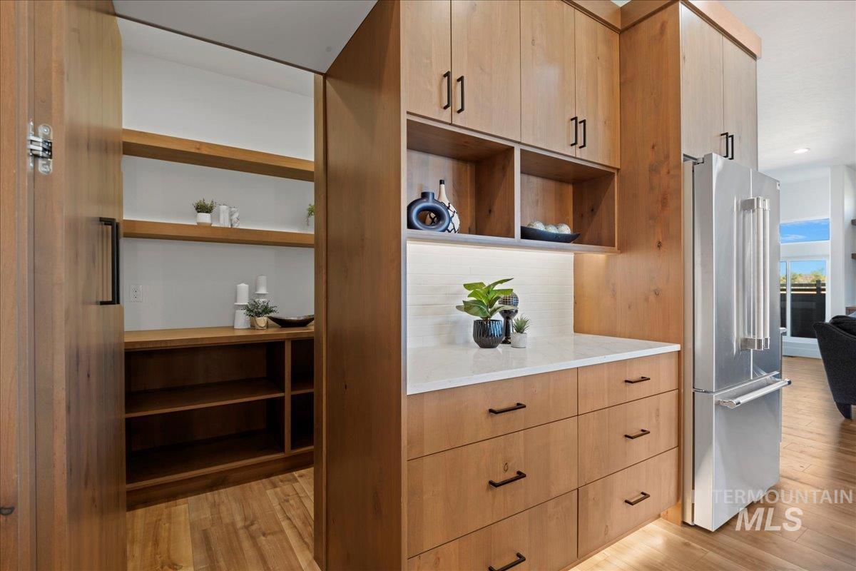 Capstone’s superior craftsmanship defines this single-level residence—thoughtful design, elevated finishes, and function at every turn. 2,544 sq ft with a flexible 4-bed layout (or 3 + office) and 2.5 baths. A true RV garage anchors the exterior. Inside, custom tile and designer details set a clean, modern tone. The chef’s kitchen showcases a full Thermador appliance set, a generous island, custom cabinetry, and a hidden butler’s pantry with walk-in storage, plus a pot filler and under-cabinet LED lighting. The private owner’s suite opens to the patio; the spa-style bath offers dual vanities and a large shower, and the suite includes a large fire-rated built-in safe. The garage is insulated and painted, with RV/EV pre-wire in place. Backed by a 4-year builder warranty. Enjoy effortless indoor/outdoor living on the covered patio and the planned Inspirado amenities—clubhouse, pool, pickleball, playgrounds, and green space.