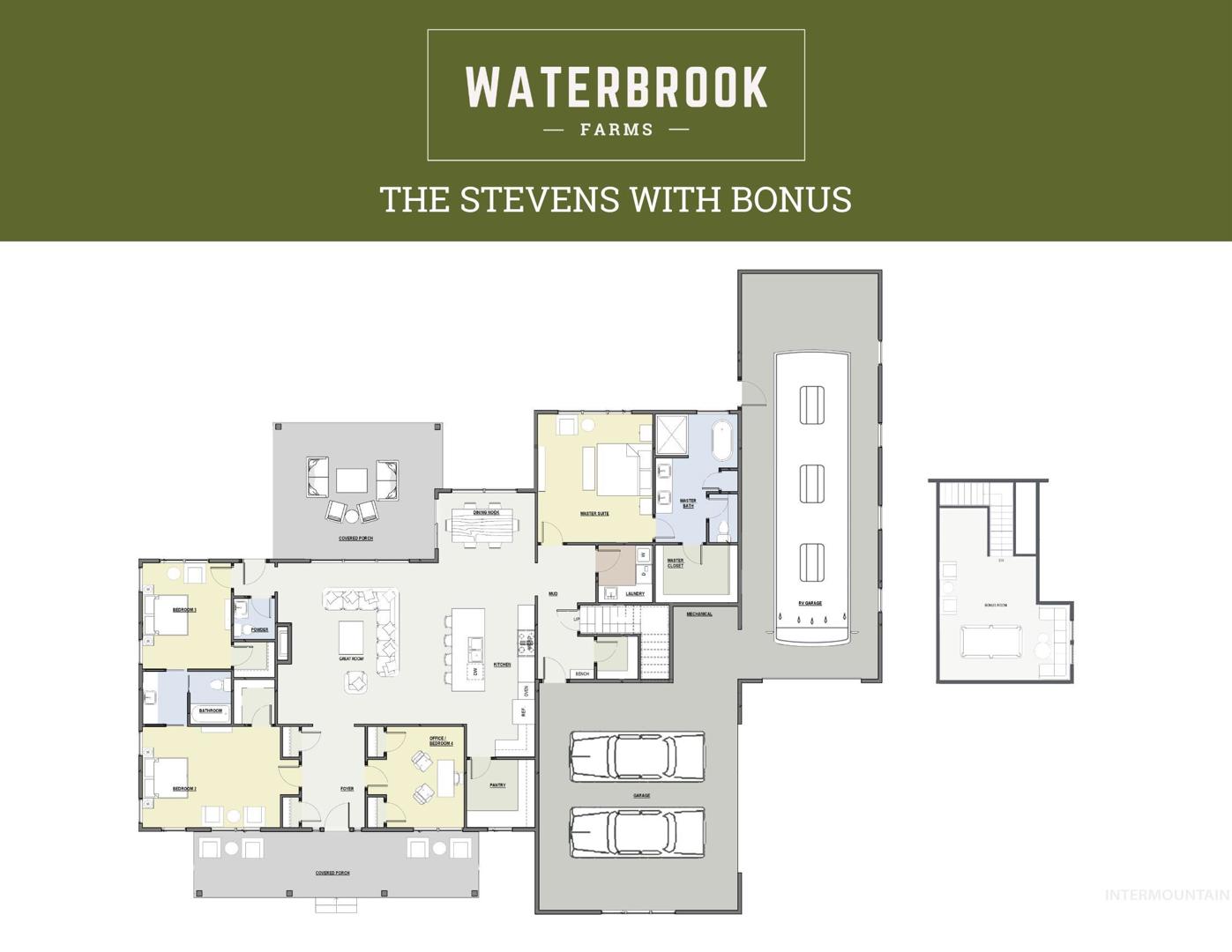Tucked away in a private cul-de-sac in Waterbrook Farms with an inviting covered front porch, The Stevens captures the essence of modern country living. Inside, the vaulted great room is filled with natural light from thoughtfully placed windows, creating serene views throughout. The kitchen is a true centerpiece, featuring an oversized island, large walk-in pantry, quartz countertops, Bosch stainless steel appliances, and abundant space for both cooking and entertaining. A split-bedroom layout ensures privacy, while an upstairs bonus room adds versatility for work, play, or relaxation. Standard features include 8` doors, a cozy gas fireplace, LVP flooring, and premium carpet. Smart upgrades such as a Ring Doorbell and Nest Thermostat provide modern convenience, and the back patio is complete with a gas line stub for easy outdoor cooking. For ultimate storage, the 50` RV garage is a standout feature.