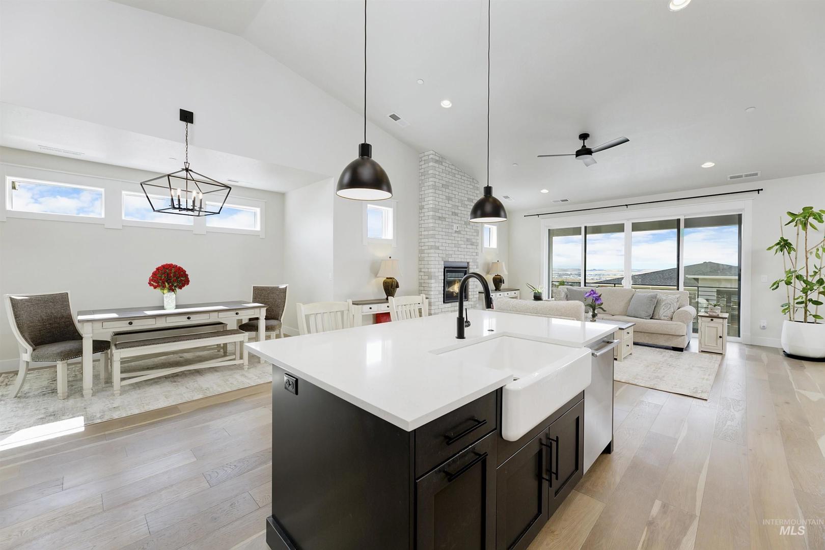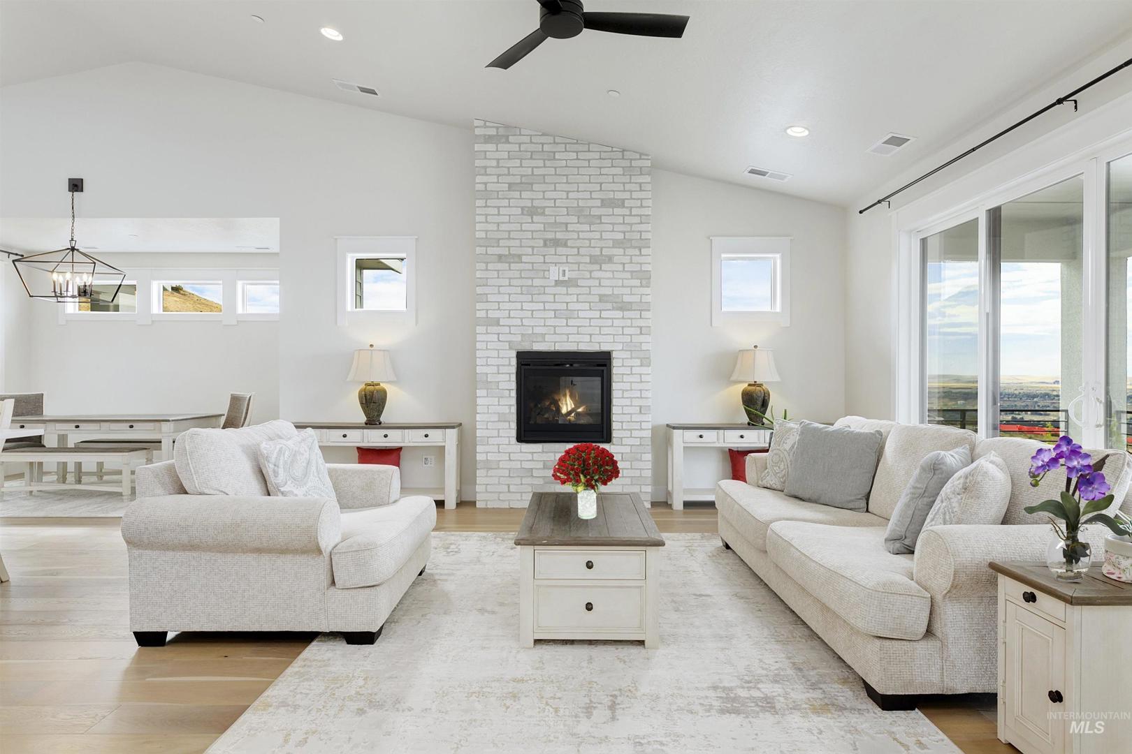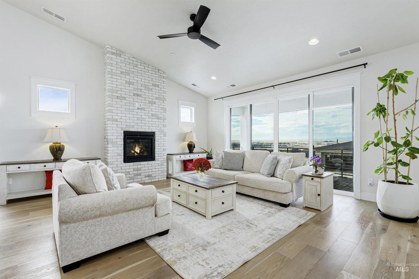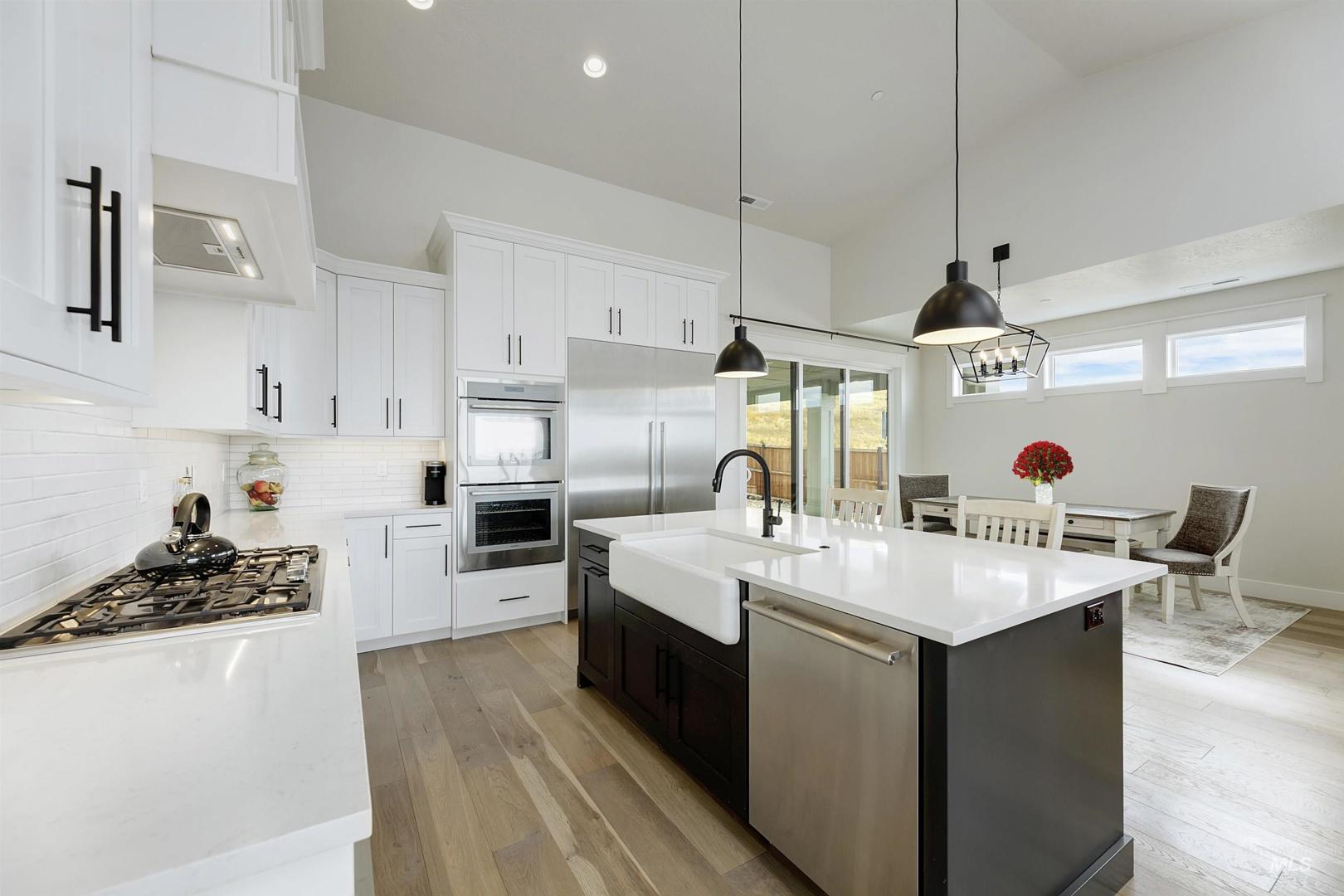 Stunning Todd Campbell custom home in Boulder Point, perfectly positioned below Table Rock with no back neighbors. This thoughtfully designed, perfect condition home blends modern elegance with timeless craftsmanship. A vaulted great room welcomes you into an airy open floor plan that flows seamlessly to a covered patio and spacious backyard that embraces all the foothill beauty. To the south, a second covered deck offers sweeping views of Barber Valley. The bright kitchen is a showpiece, featuring Thermador appliances, full-height cabinetry, and a sprawling island perfect for gathering. Upstairs, a secure primary suite and office create a private retreat, while the lower level is built for entertaining with a large family room, two bedrooms, and a full bath - ideal for guests or multi-generational living. Located in the Boise foothills near hiking and biking trails, the Boise River, Greenbelt, Micron, Lucky Peak, and downtown. This home offers a perfect blend of style, privacy, recreation, and modern luxury.