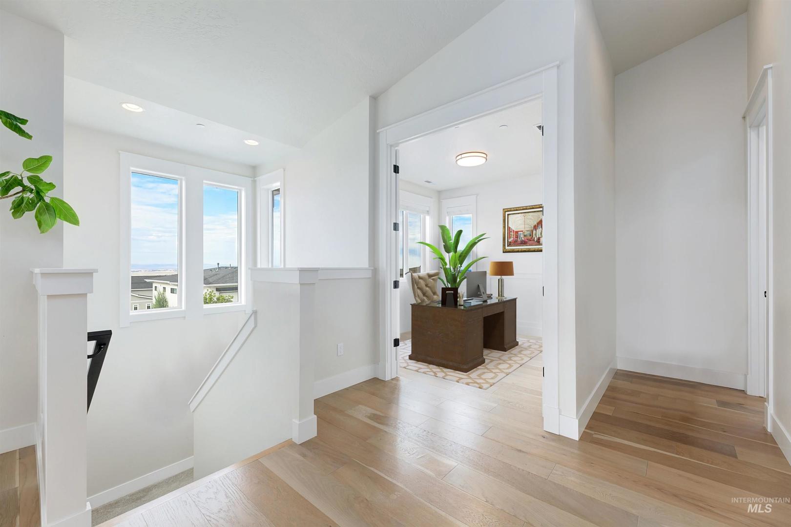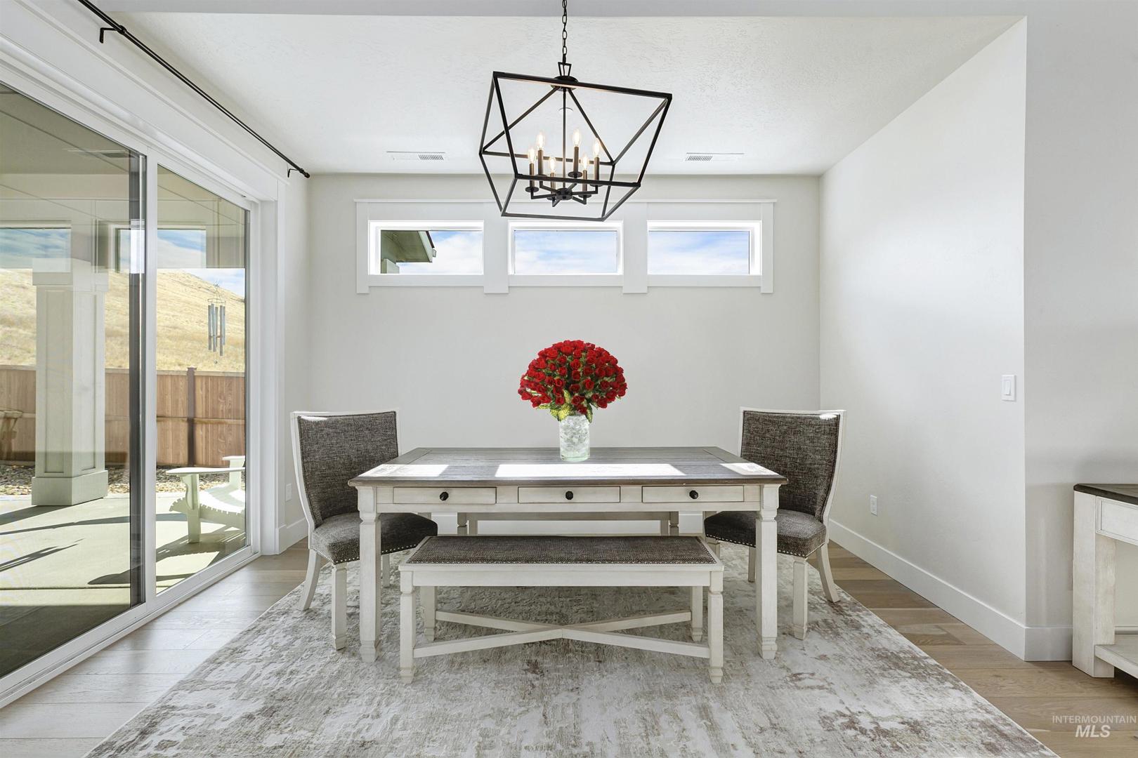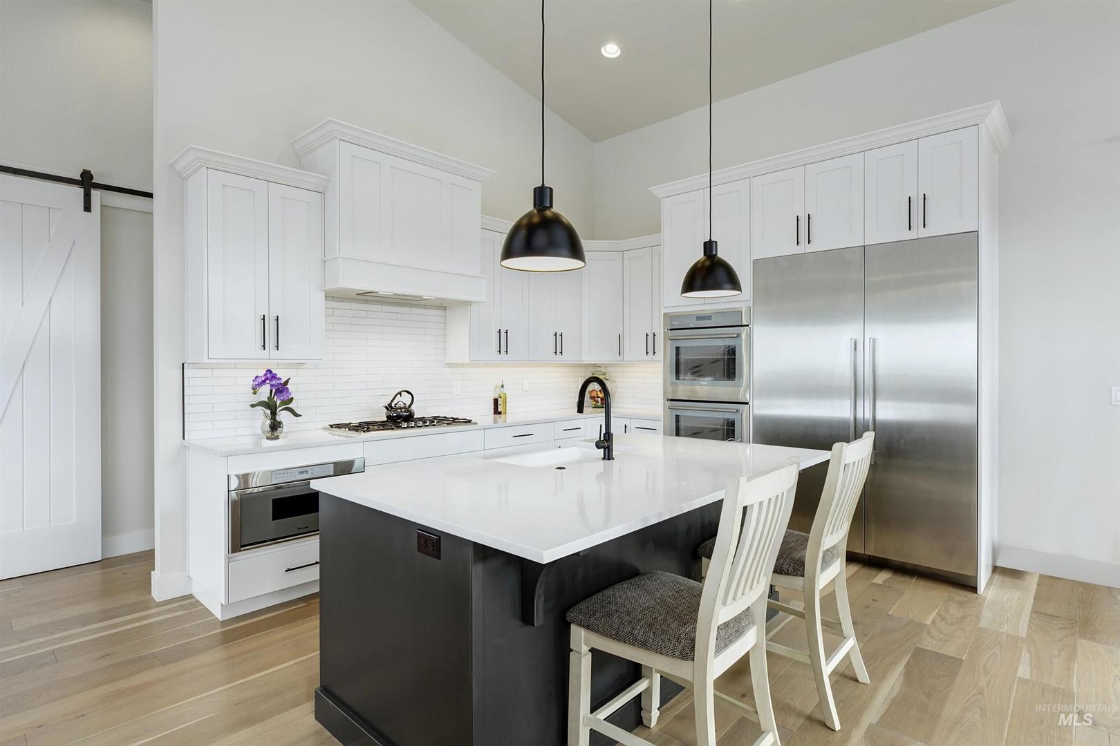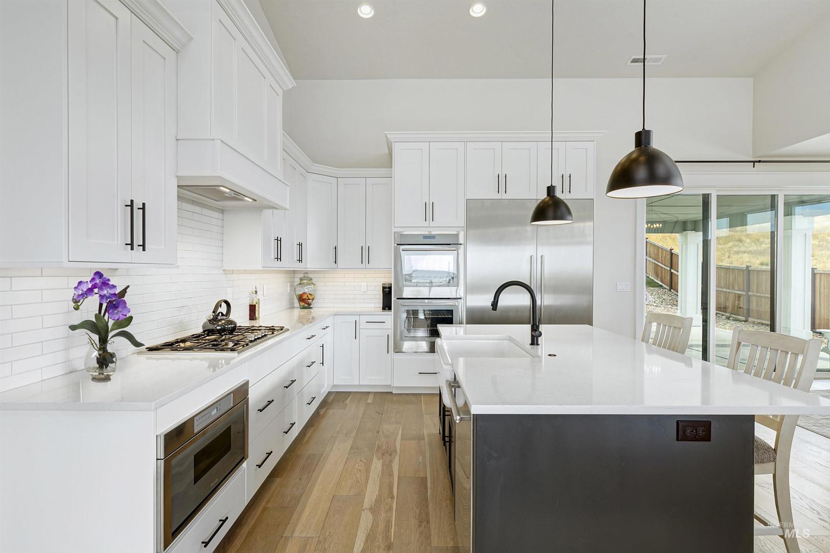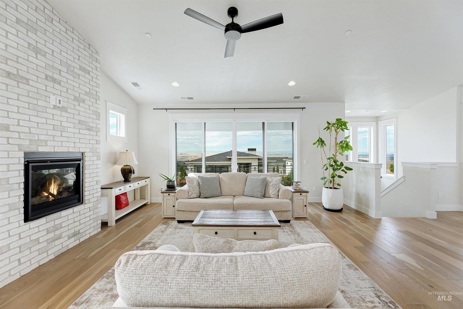 Stunning Todd Campbell custom home in Boulder Point, perfectly positioned below Table Rock with no back neighbors. This thoughtfully designed, perfect condition home blends modern elegance with timeless craftsmanship. A vaulted great room welcomes you into an airy open floor plan that flows seamlessly to a covered patio and spacious backyard that embraces all the foothill beauty. To the south, a second covered deck offers sweeping views of Barber Valley. The bright kitchen is a showpiece, featuring Thermador appliances, full-height cabinetry, and a sprawling island perfect for gathering. Upstairs, a secure primary suite and office create a private retreat, while the lower level is built for entertaining with a large family room, two bedrooms, and a full bath - ideal for guests or multi-generational living. Located in the Boise foothills near hiking and biking trails, the Boise River, Greenbelt, Micron, Lucky Peak, and downtown. This home offers a perfect blend of style, privacy, recreation, and modern luxury.