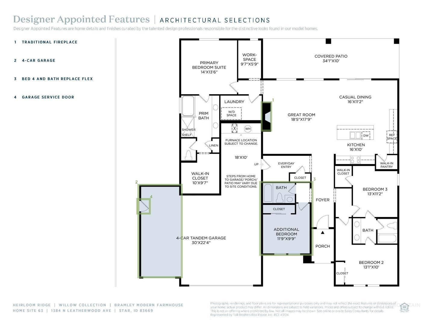Welcome to the Bramley with a welcoming foyer that leads to a large great room, with stunning views of the outdoors and access to an expansive covered patio creating a perfect space for indoor-outdoor entertaining. A well-equipped kitchen with island has direct access to the casual dining area boasting ample windows that provide natural light throughout. Two additional bedrooms share a private bath and a third bedroom with hall bath. Completing the primary suite is a spa-like private bath with dual sink vanity, tile surround shower, separate soaking tub, and spacious walk-in closet. Convenient workspace near the primary suite and spacious laundry room round out this great home. 4 car garage. Front and rear landscape included. BTVAI