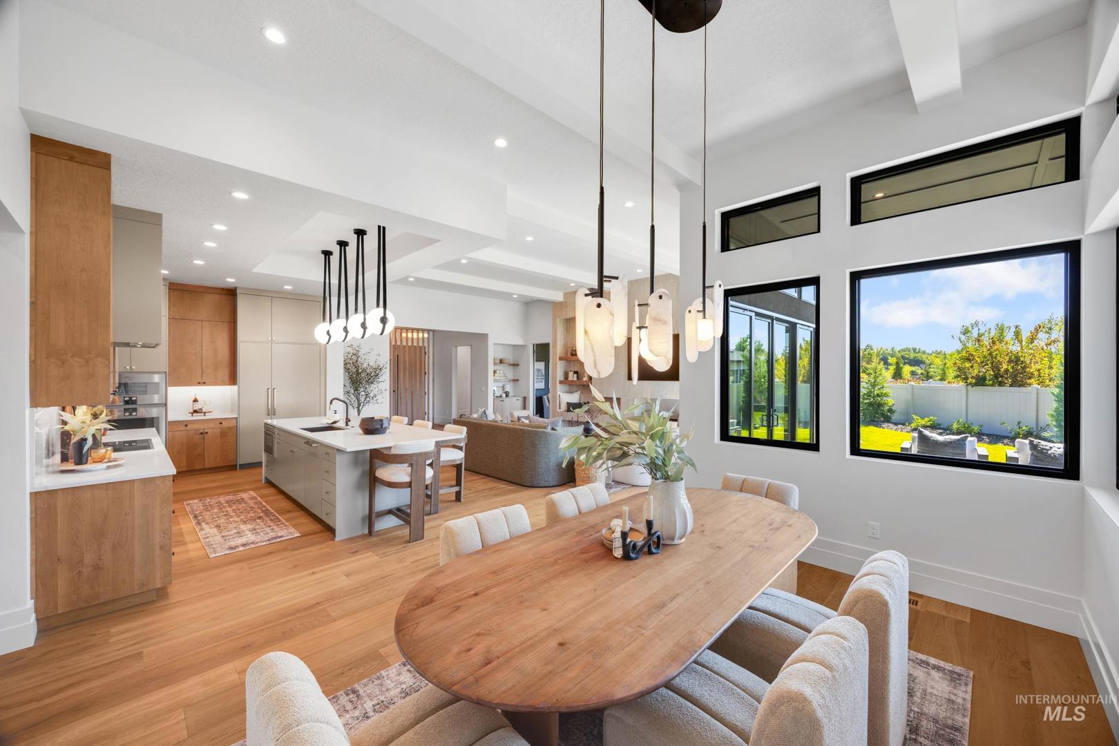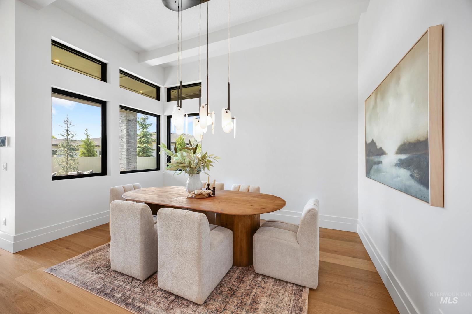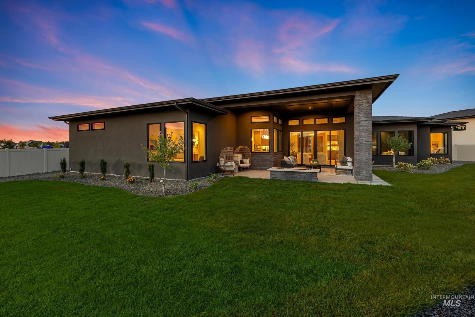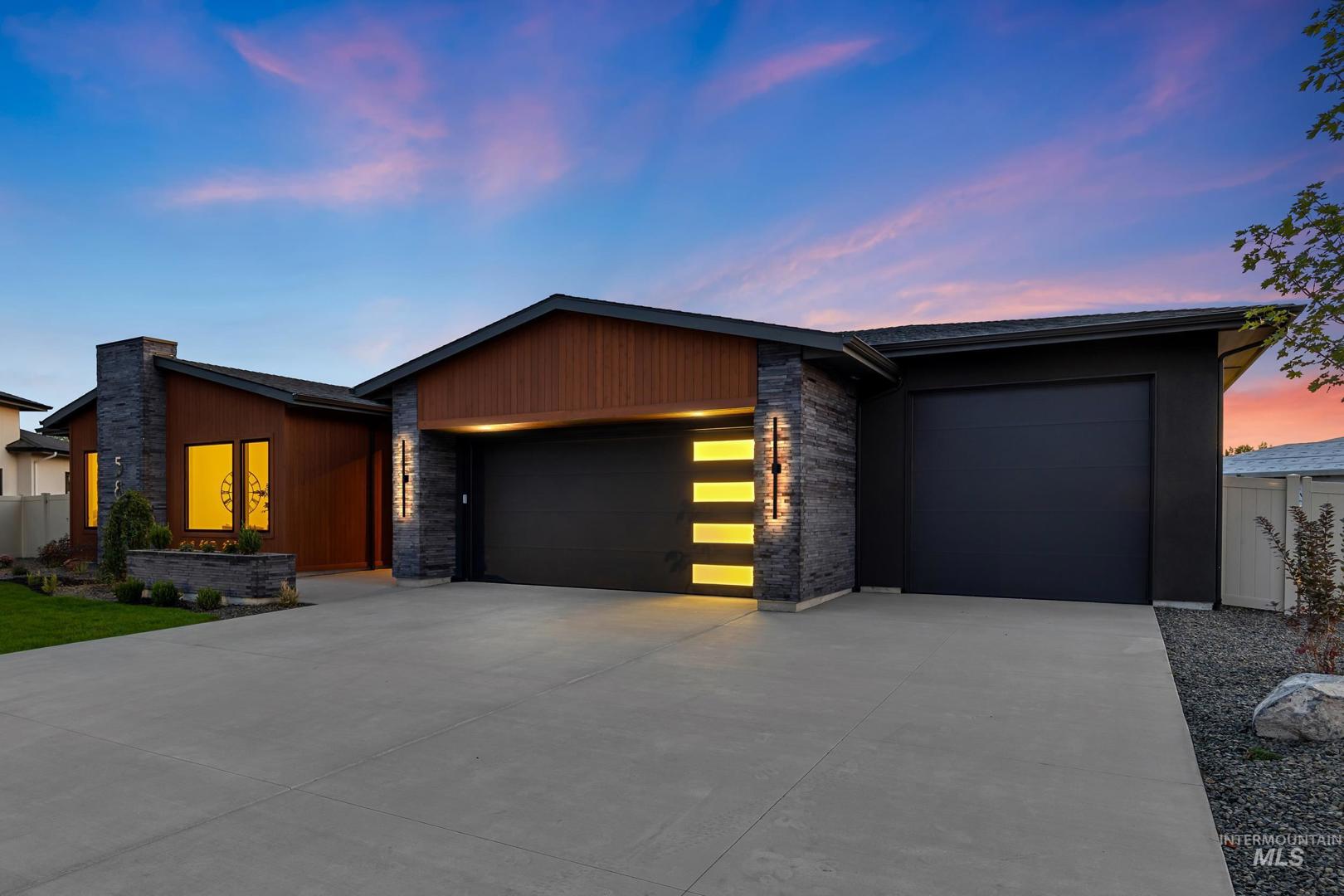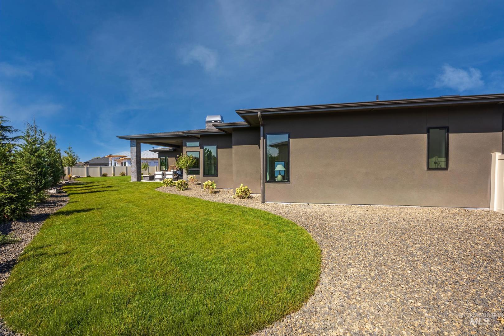 Open House, Saturday, November 1 from 12-3pm! 2025 Fall Parade of Home! Exceptional custom home by Zach Evans Construction in Eagle, ID’s serene Whitehurst Neighborhood. This stunning single-level retreat on a tranquil cul-de-sac spans a third acre, featuring 4 bedrooms, a flex room, and soaring beamed ceilings in the inviting great room. Flooded with natural light from expansive windows, it overlooks a picturesque southern backyard, exuding a warm, modern-rustic vibe with its elegant wood accents, sleek finishes, and cozy yet sophisticated ambiance—perfect for those who value a blend of natural beauty and contemporary style. The gourmet kitchen boasts a generous waterfall island with premium appliances, ideal for culinary enthusiasts, while the private master wing offers corner windows, a spa-like bathroom with a tiled shower and standalone tub, and a luxurious custom closet, appealing to those seeking a personal sanctuary. A guest suite with ensuite bath, two additional bedrooms with a shared bath, and a spacious garage with boat bay.