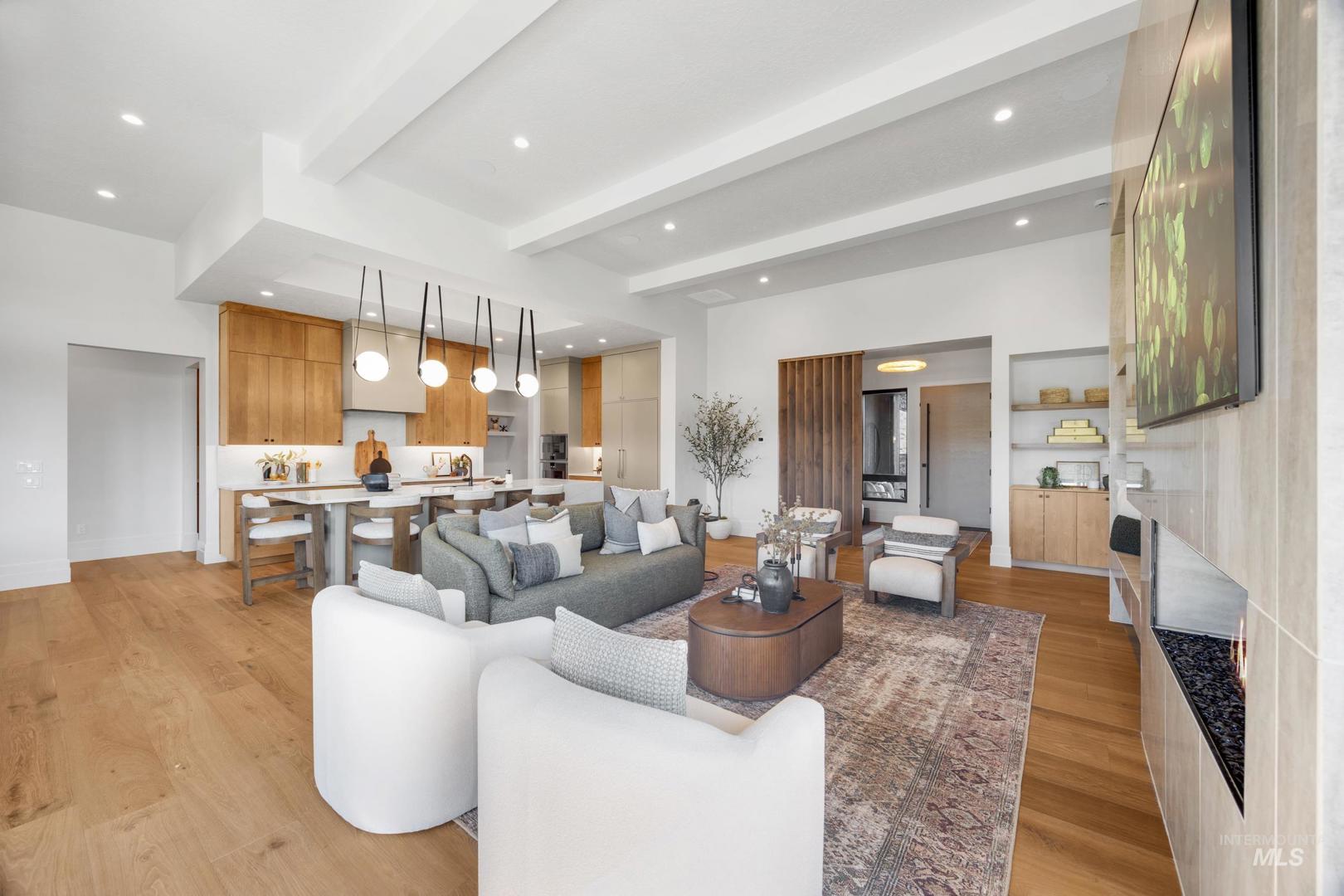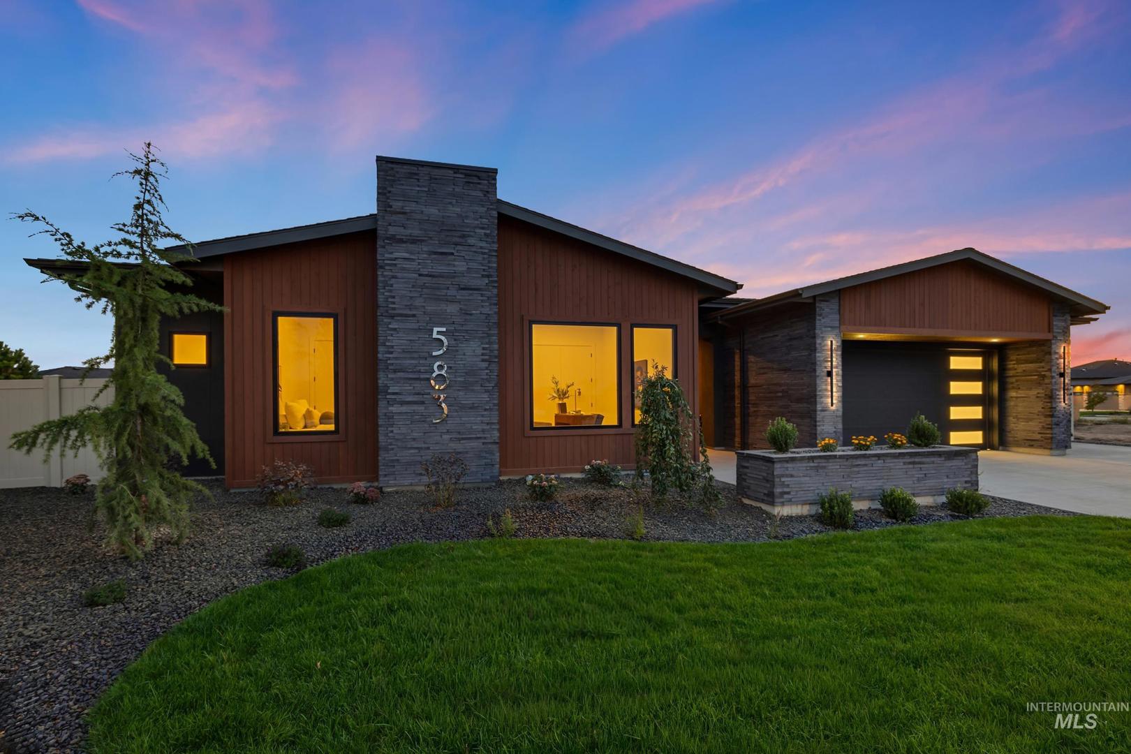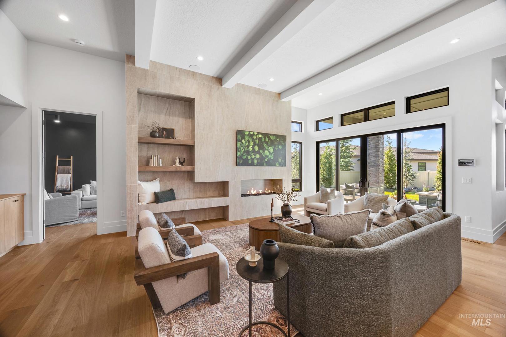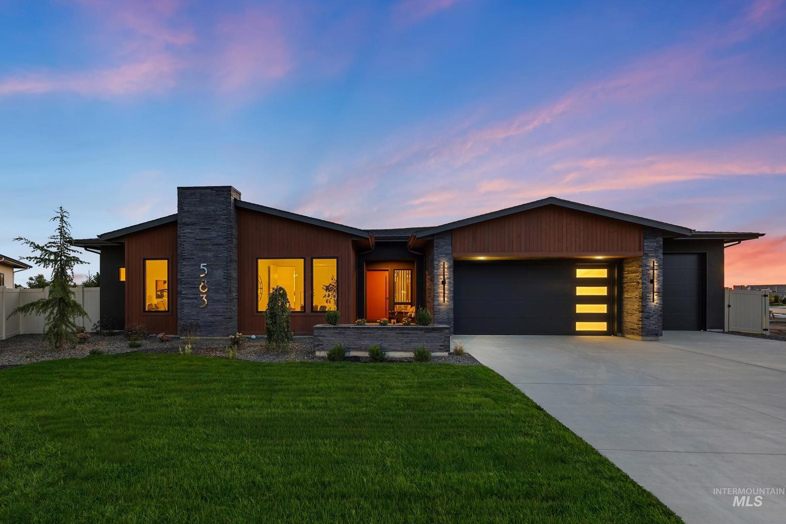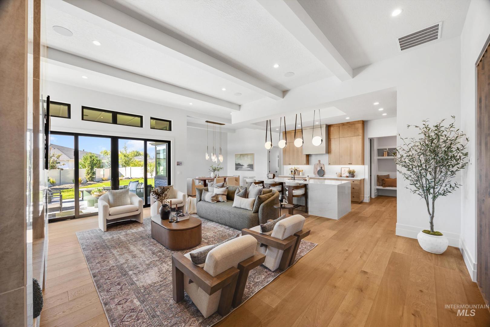 Open House, Saturday, November 1 from 12-3pm! 2025 Fall Parade of Home! Exceptional custom home by Zach Evans Construction in Eagle, ID’s serene Whitehurst Neighborhood. This stunning single-level retreat on a tranquil cul-de-sac spans a third acre, featuring 4 bedrooms, a flex room, and soaring beamed ceilings in the inviting great room. Flooded with natural light from expansive windows, it overlooks a picturesque southern backyard, exuding a warm, modern-rustic vibe with its elegant wood accents, sleek finishes, and cozy yet sophisticated ambiance—perfect for those who value a blend of natural beauty and contemporary style. The gourmet kitchen boasts a generous waterfall island with premium appliances, ideal for culinary enthusiasts, while the private master wing offers corner windows, a spa-like bathroom with a tiled shower and standalone tub, and a luxurious custom closet, appealing to those seeking a personal sanctuary. A guest suite with ensuite bath, two additional bedrooms with a shared bath, and a spacious garage with boat bay.
