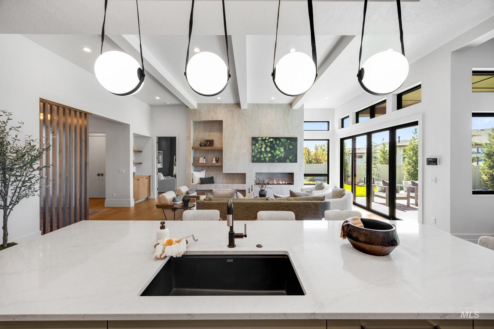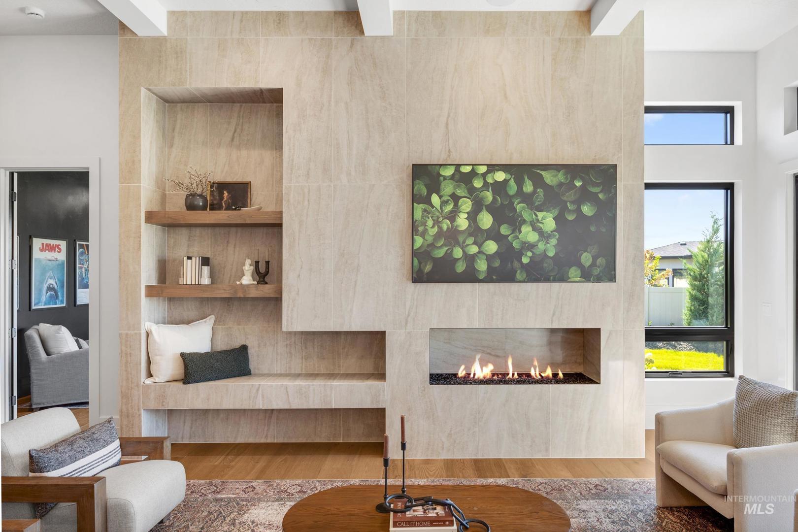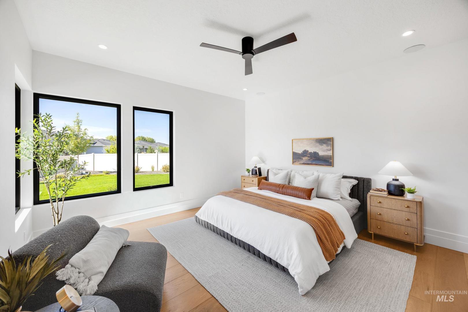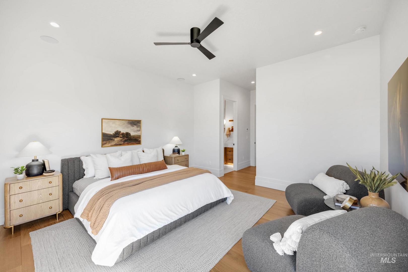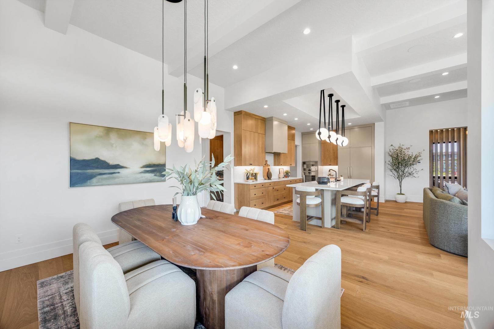 Open House, Saturday, November 1 from 12-3pm! 2025 Fall Parade of Home! Exceptional custom home by Zach Evans Construction in Eagle, ID’s serene Whitehurst Neighborhood. This stunning single-level retreat on a tranquil cul-de-sac spans a third acre, featuring 4 bedrooms, a flex room, and soaring beamed ceilings in the inviting great room. Flooded with natural light from expansive windows, it overlooks a picturesque southern backyard, exuding a warm, modern-rustic vibe with its elegant wood accents, sleek finishes, and cozy yet sophisticated ambiance—perfect for those who value a blend of natural beauty and contemporary style. The gourmet kitchen boasts a generous waterfall island with premium appliances, ideal for culinary enthusiasts, while the private master wing offers corner windows, a spa-like bathroom with a tiled shower and standalone tub, and a luxurious custom closet, appealing to those seeking a personal sanctuary. A guest suite with ensuite bath, two additional bedrooms with a shared bath, and a spacious garage with boat bay.
