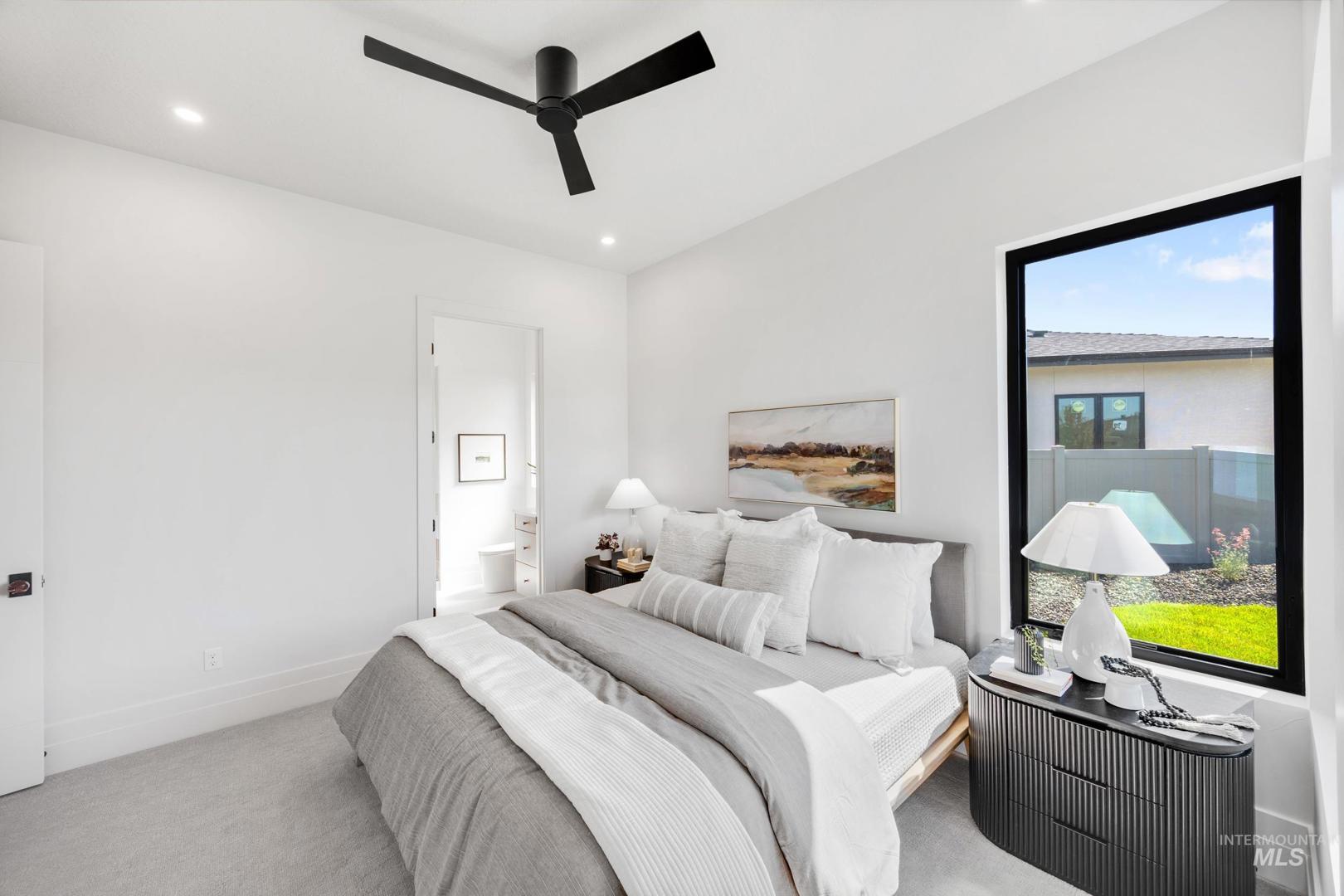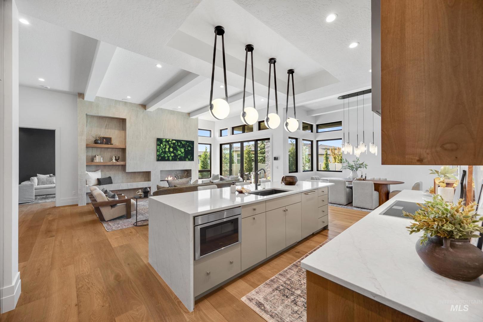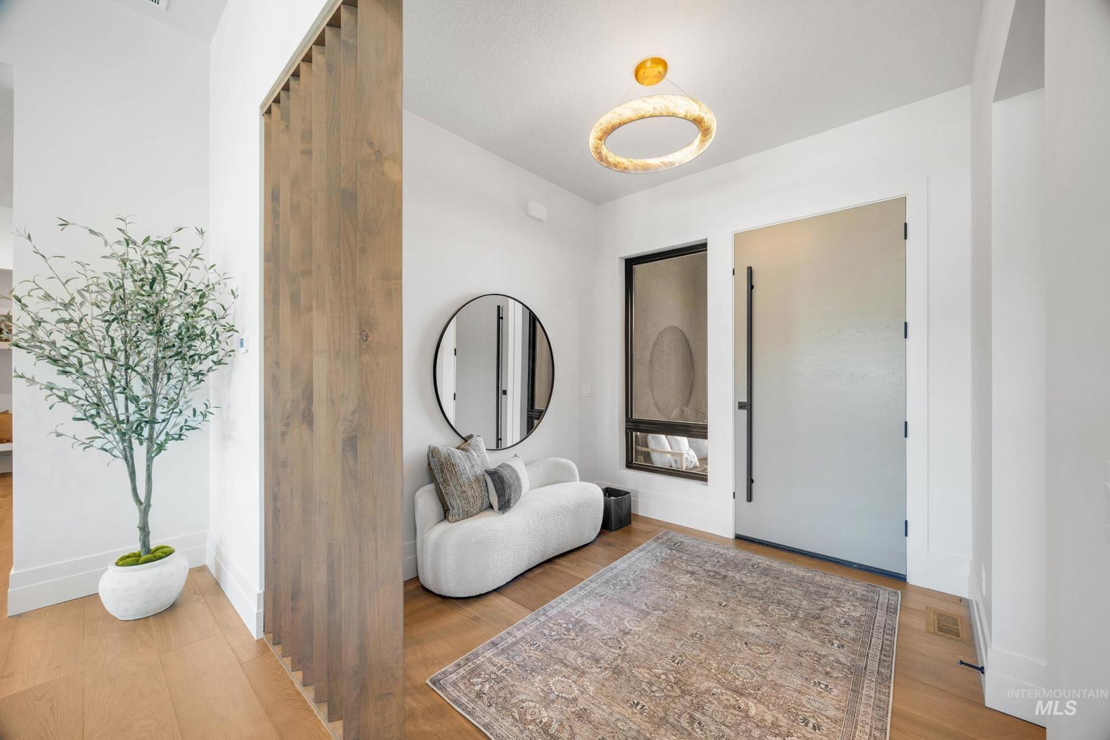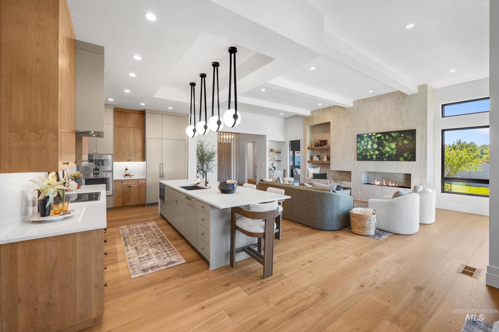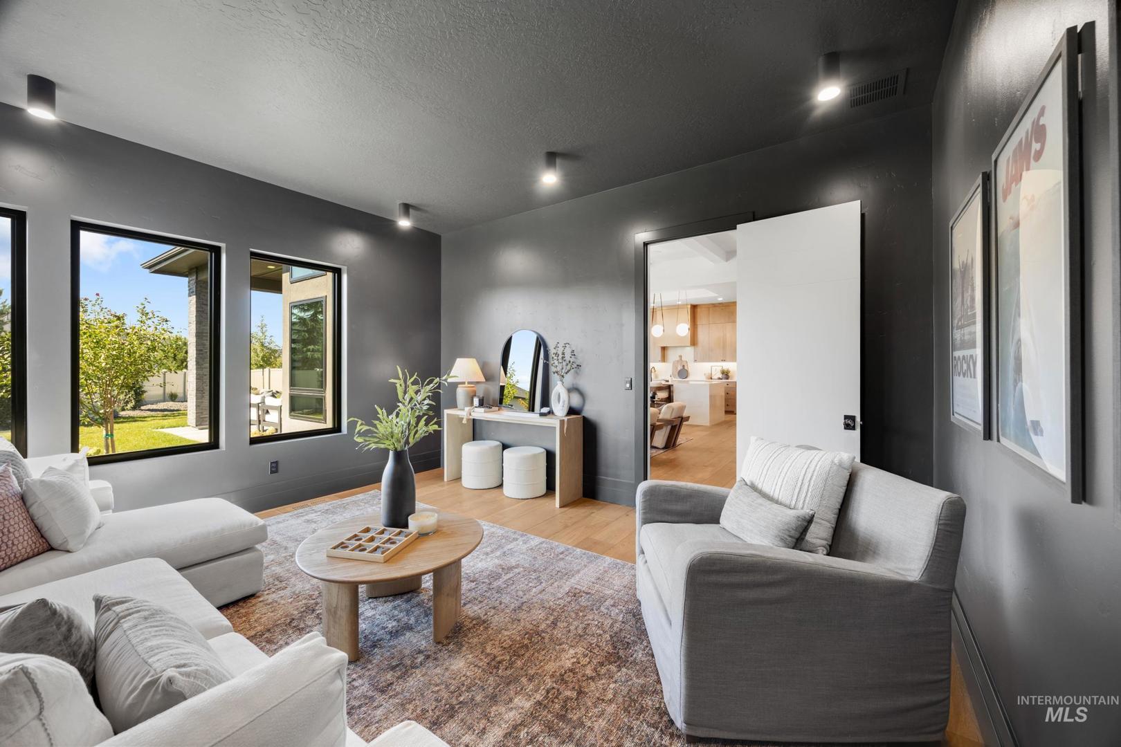 Open House, Saturday, November 1 from 12-3pm! 2025 Fall Parade of Home! Exceptional custom home by Zach Evans Construction in Eagle, ID’s serene Whitehurst Neighborhood. This stunning single-level retreat on a tranquil cul-de-sac spans a third acre, featuring 4 bedrooms, a flex room, and soaring beamed ceilings in the inviting great room. Flooded with natural light from expansive windows, it overlooks a picturesque southern backyard, exuding a warm, modern-rustic vibe with its elegant wood accents, sleek finishes, and cozy yet sophisticated ambiance—perfect for those who value a blend of natural beauty and contemporary style. The gourmet kitchen boasts a generous waterfall island with premium appliances, ideal for culinary enthusiasts, while the private master wing offers corner windows, a spa-like bathroom with a tiled shower and standalone tub, and a luxurious custom closet, appealing to those seeking a personal sanctuary. A guest suite with ensuite bath, two additional bedrooms with a shared bath, and a spacious garage with boat bay.