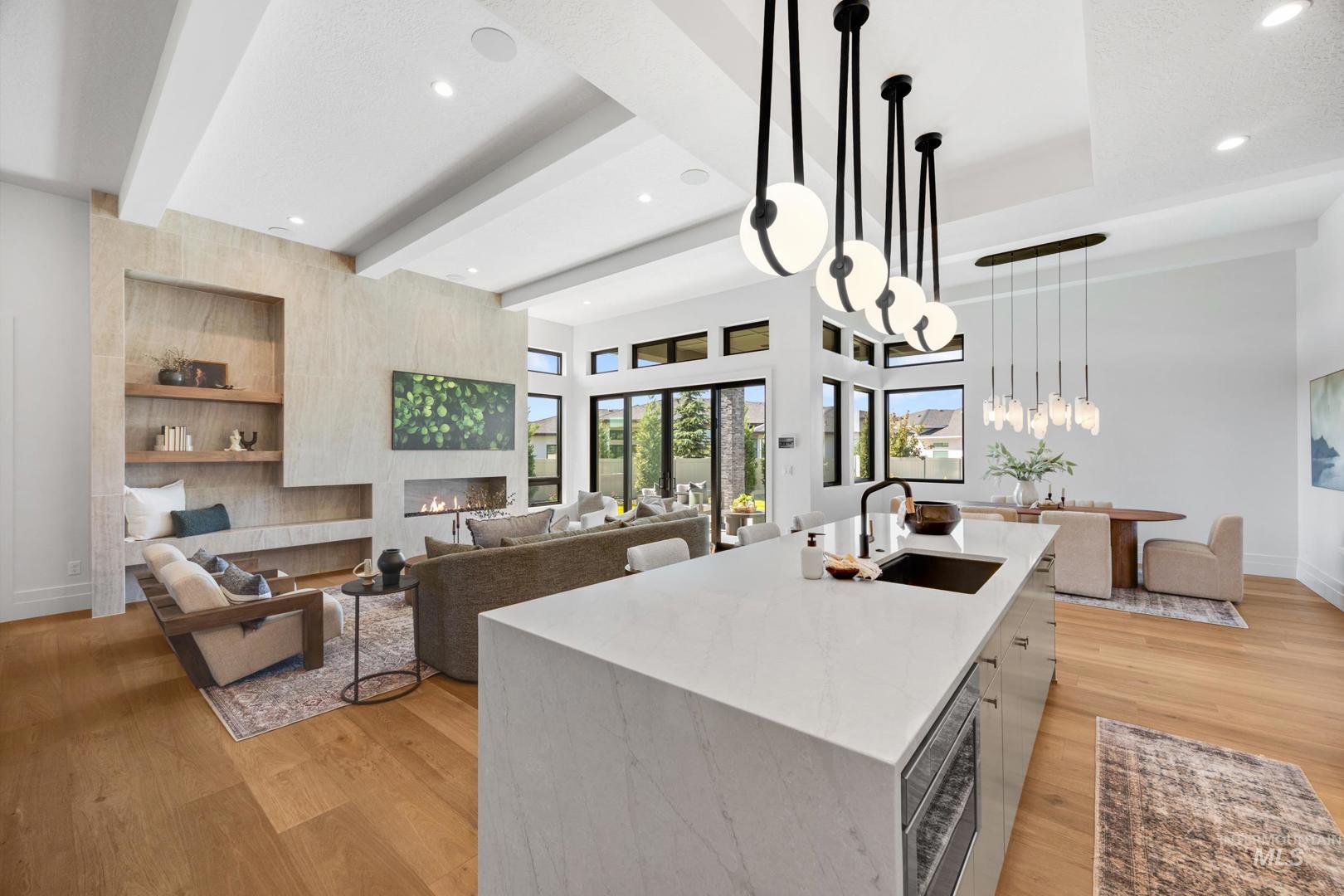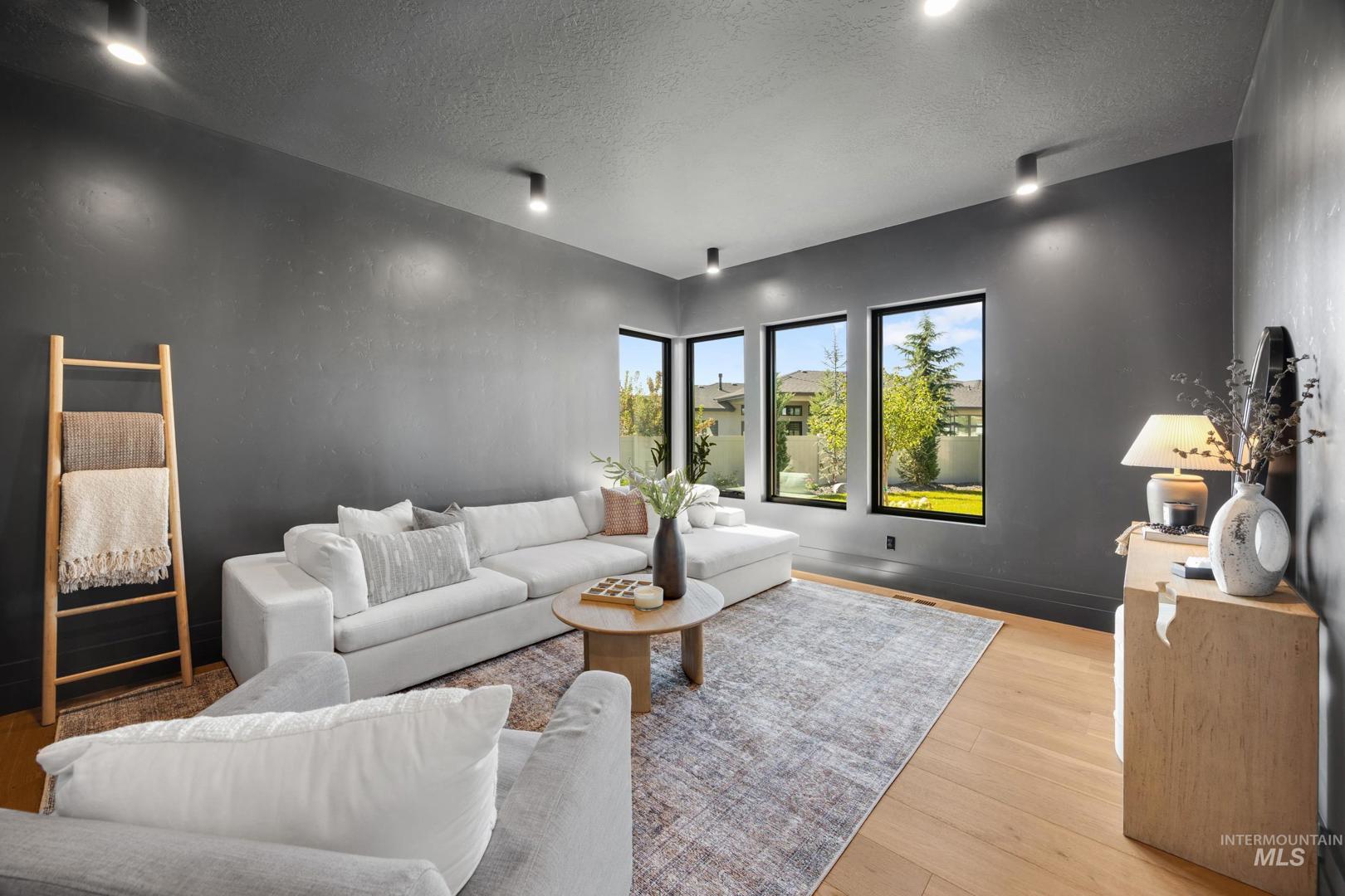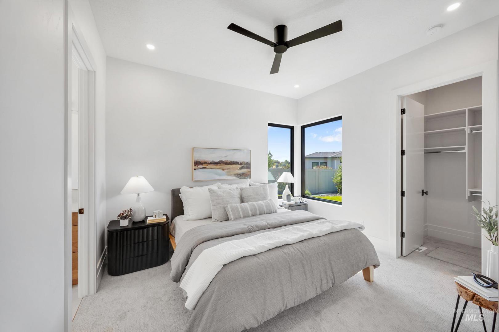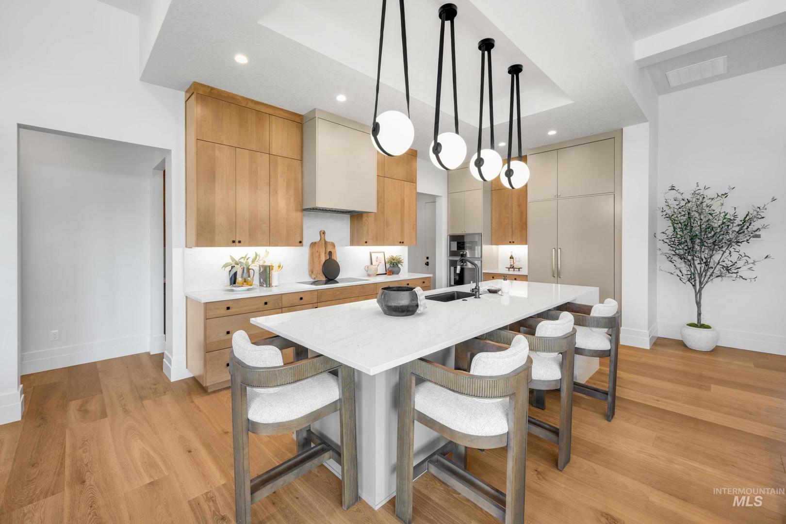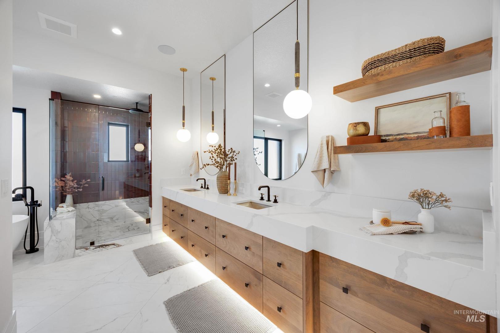 Open House, Saturday, November 1 from 12-3pm! 2025 Fall Parade of Home! Exceptional custom home by Zach Evans Construction in Eagle, ID’s serene Whitehurst Neighborhood. This stunning single-level retreat on a tranquil cul-de-sac spans a third acre, featuring 4 bedrooms, a flex room, and soaring beamed ceilings in the inviting great room. Flooded with natural light from expansive windows, it overlooks a picturesque southern backyard, exuding a warm, modern-rustic vibe with its elegant wood accents, sleek finishes, and cozy yet sophisticated ambiance—perfect for those who value a blend of natural beauty and contemporary style. The gourmet kitchen boasts a generous waterfall island with premium appliances, ideal for culinary enthusiasts, while the private master wing offers corner windows, a spa-like bathroom with a tiled shower and standalone tub, and a luxurious custom closet, appealing to those seeking a personal sanctuary. A guest suite with ensuite bath, two additional bedrooms with a shared bath, and a spacious garage with boat bay.