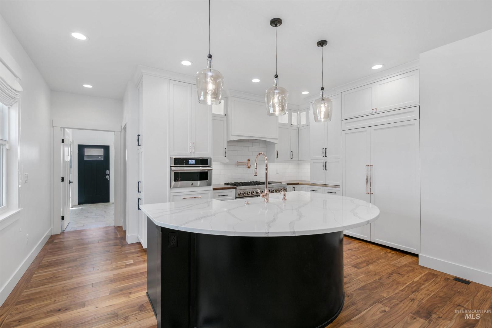Truly a North End Beauty—rebuilt from the ground up to blend timeless elegance with modern comfort and efficiency. From the moment you arrive, the Southern gallery-style porch with stamped concrete, stately windows, and multiple access points sets the stage for effortless living and entertaining. Inside, cathedral ceilings, custom windows, arched pocket doors, and rich hardwoods showcase quality craftsmanship. The chef’s kitchen shines with a grand Acacia island crowned in quartz, farmhouse sink, Jenn-Air appliances, pot filler, and lighted custom cabinetry—perfect for gathering. Relax in the plush main-floor primary suite with sunroom or by one of three cozy fireplaces. With bedrooms and living spaces across three levels, plus basement wet bar potential, the home offers versatility for any lifestyle. Designed for beauty and sustainability with ground-source HVAC, solar-ready conduit, LED lighting, and EV-ready detached garage, this is more than a house—it’s heart, home, elegance, & lifestyle personified!