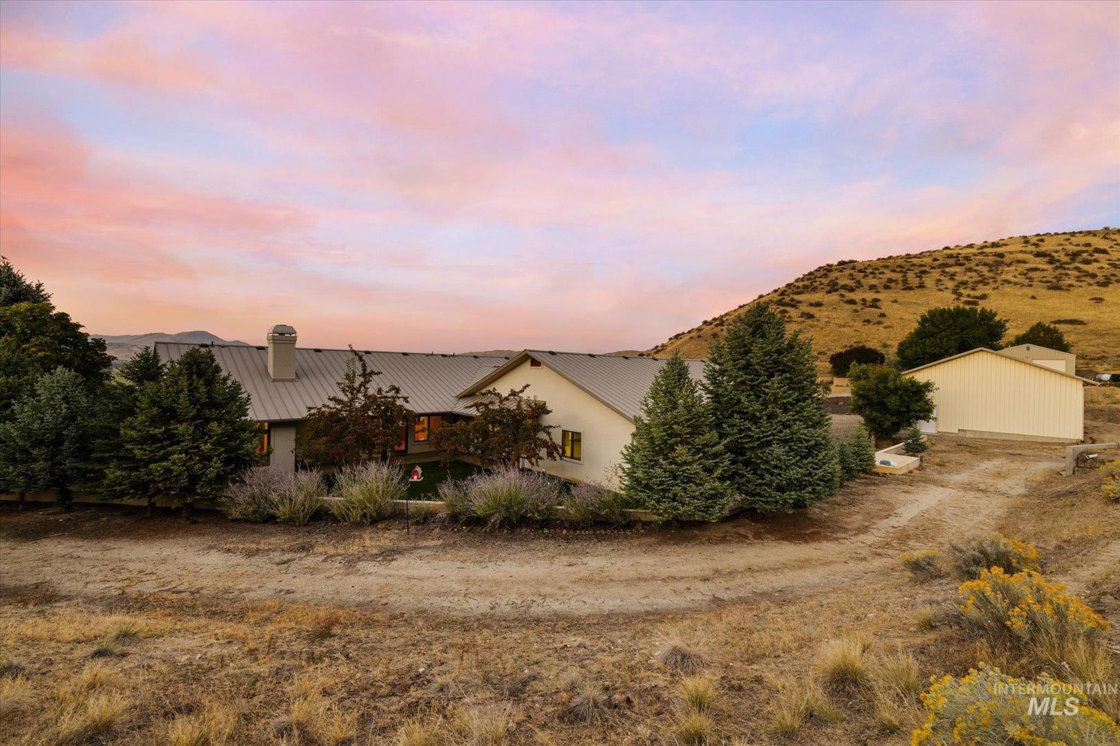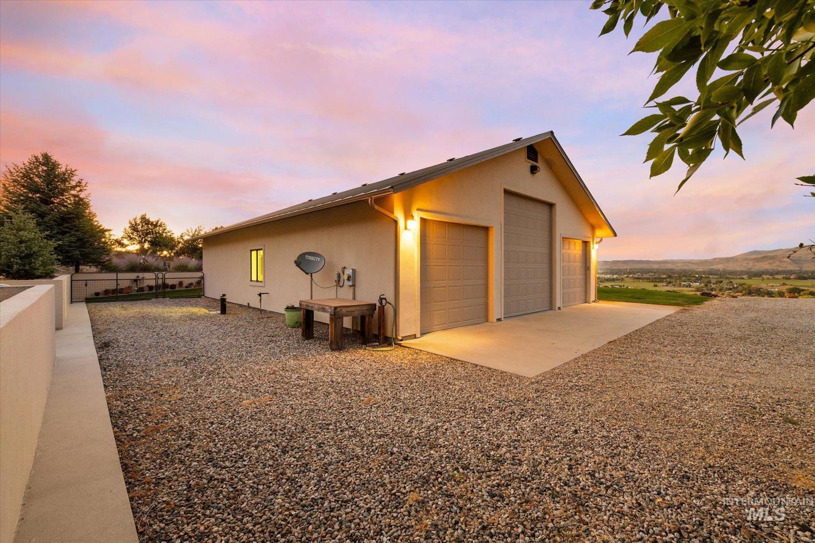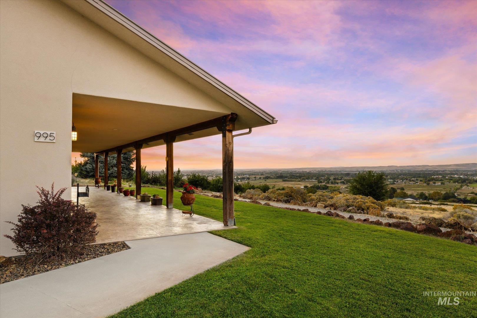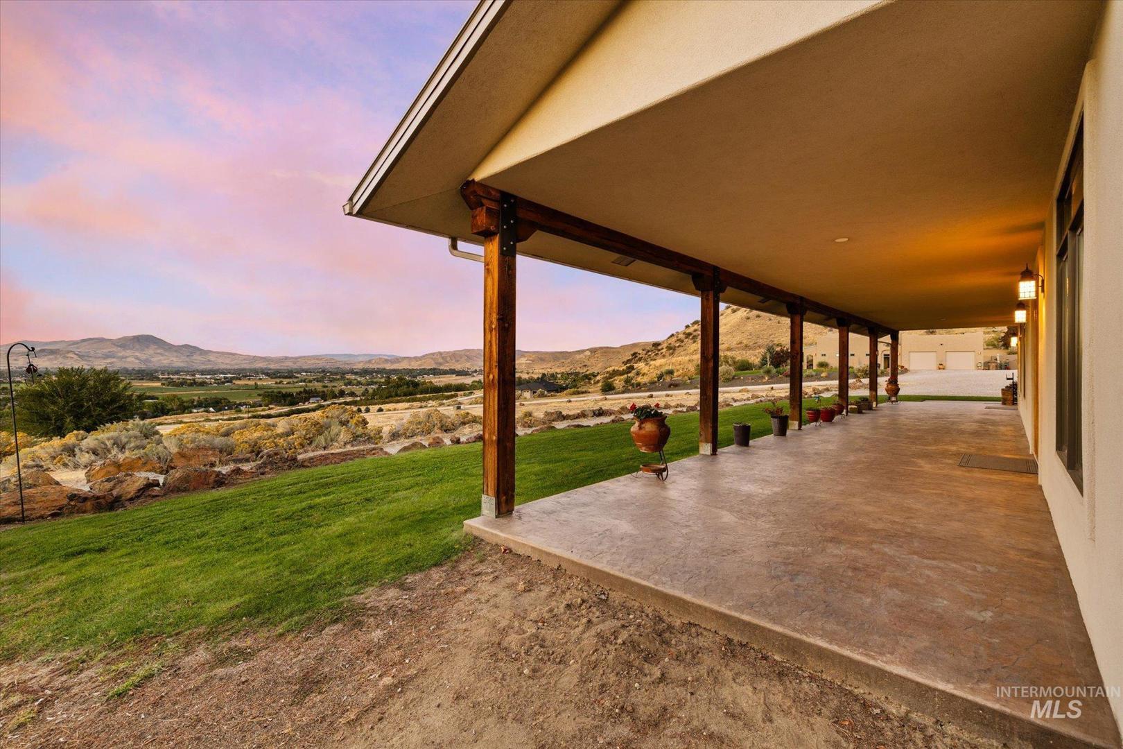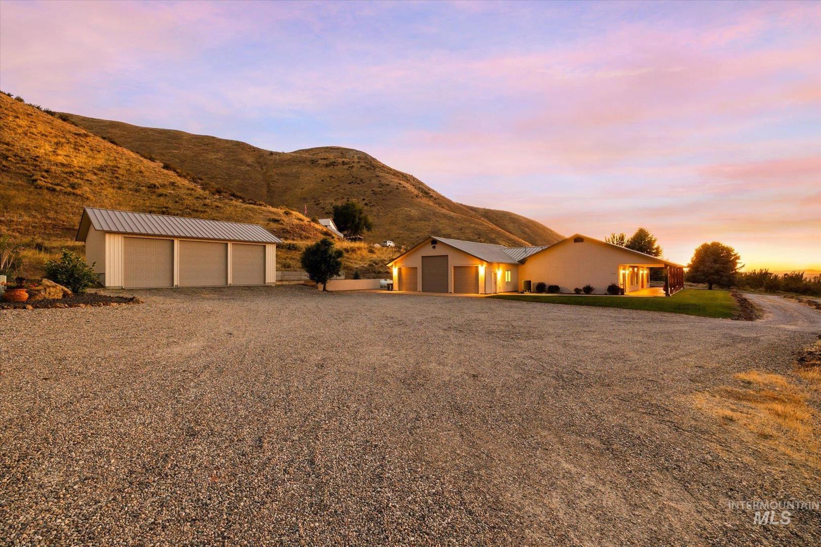 Incredible 5-acre view property on the South Slope offering panoramic mountain and valley views. This beautifully crafted 2,020 sqft custom home features 3 bedrooms, 2.5 bathrooms, & is filled w/ high-end finishes throughout. The gourmet kitchen is a chef’s dream w/ quartz countertops, built-in appliances, & custom cabinetry. A split-bedroom floor plan provides privacy & functionality, w/ soaring ceilings, solid core doors, & a wall of windows that bring in abundant natural light. The luxurious primary suite includes a spa-like bathroom w/ walk-in shower, Soaker tub, dual vanities, & an oversized walk-in closet. Two additional bedrooms are located on the opposite side of the home & share a full bathroom. The open-concept living area offers a cozy fireplace, built-in shelving, & custom front door that leads to a fully covered patio—perfect for relaxing or entertaining while taking in the incredible views. The north-facing front yard delivers exceptional privacy & some of the best scenery in the valley, while the fully fenced backyard provides additional space and seclusion. Ideal for RV owners, hobbyists, or extra storage, the property includes a massive 40x50 attached RV garage w/ three large roll-up doors, plus a 40x30 detached shop. Tucked away on a private drive alongside a apple orchard, this home offers unmatched tranquility. Please use the driveway closest to the apple orchard