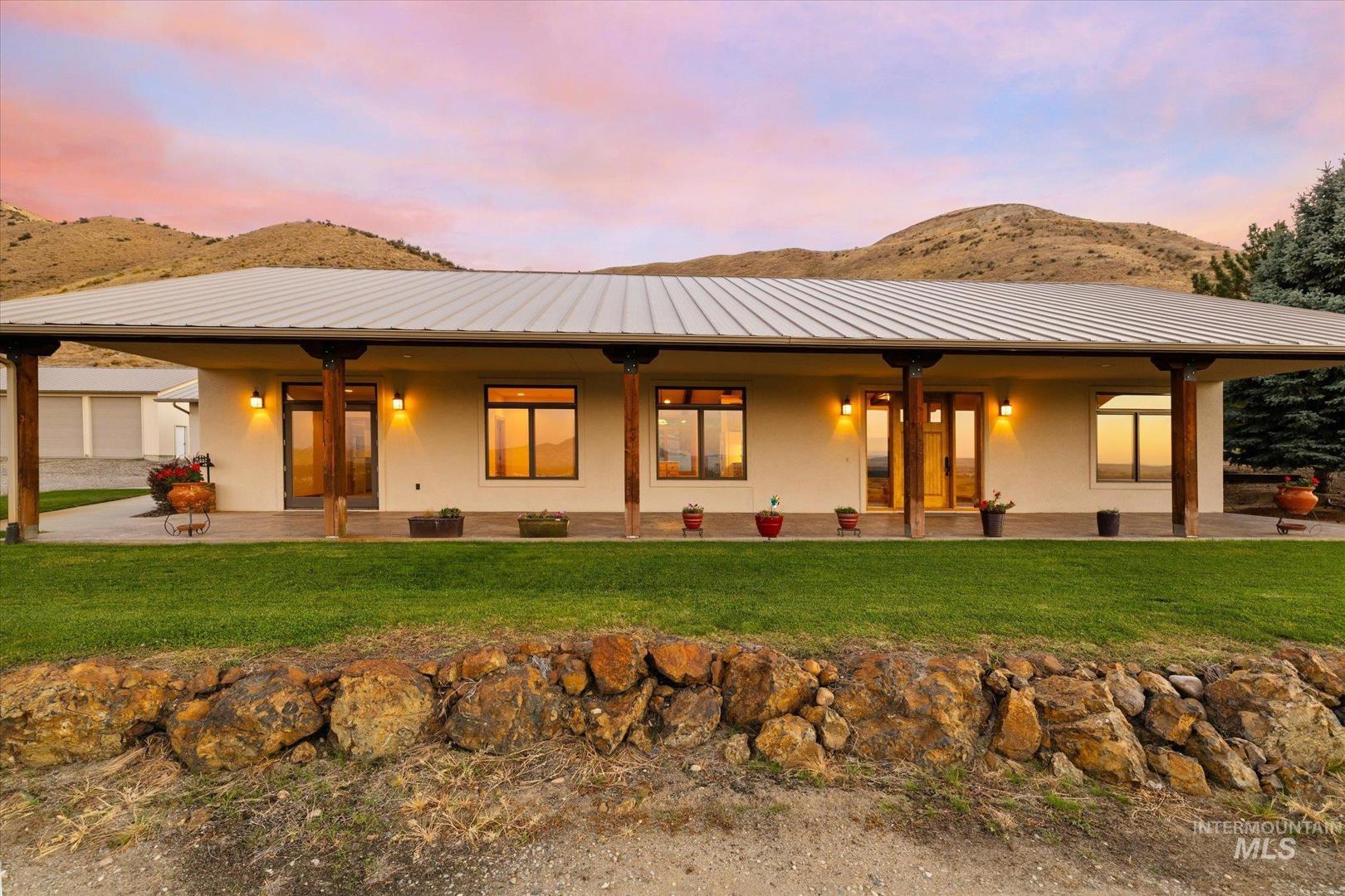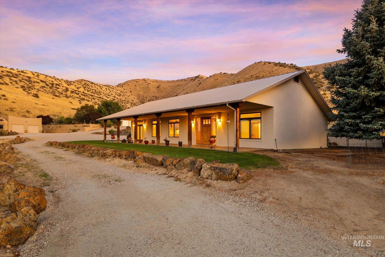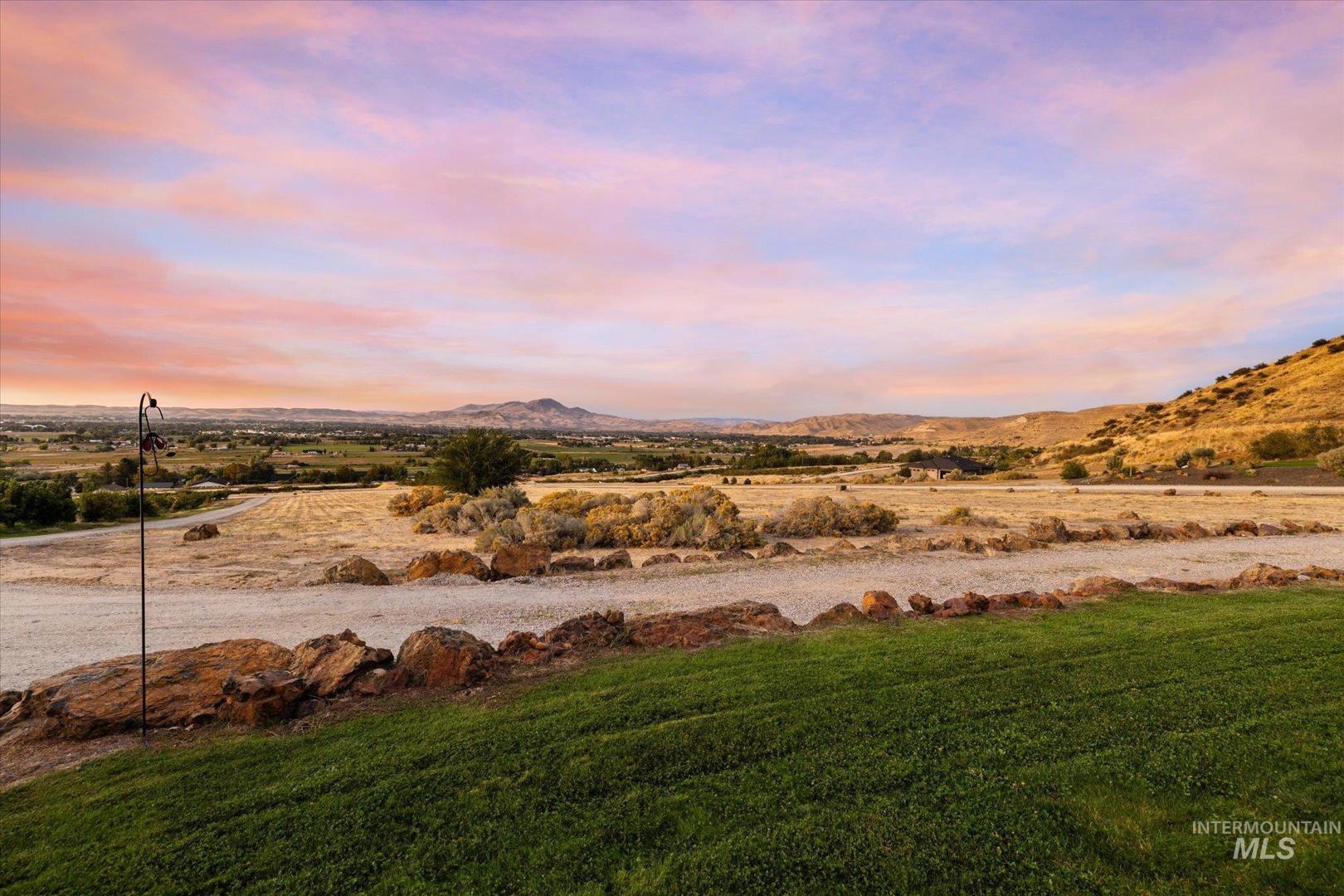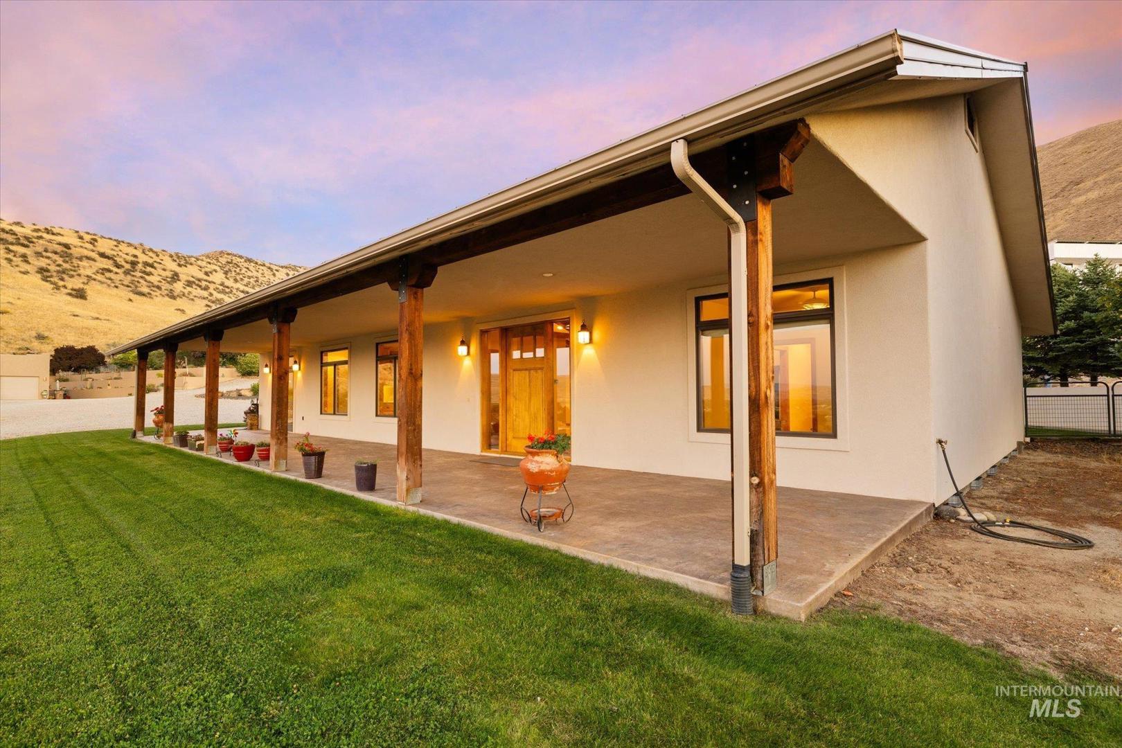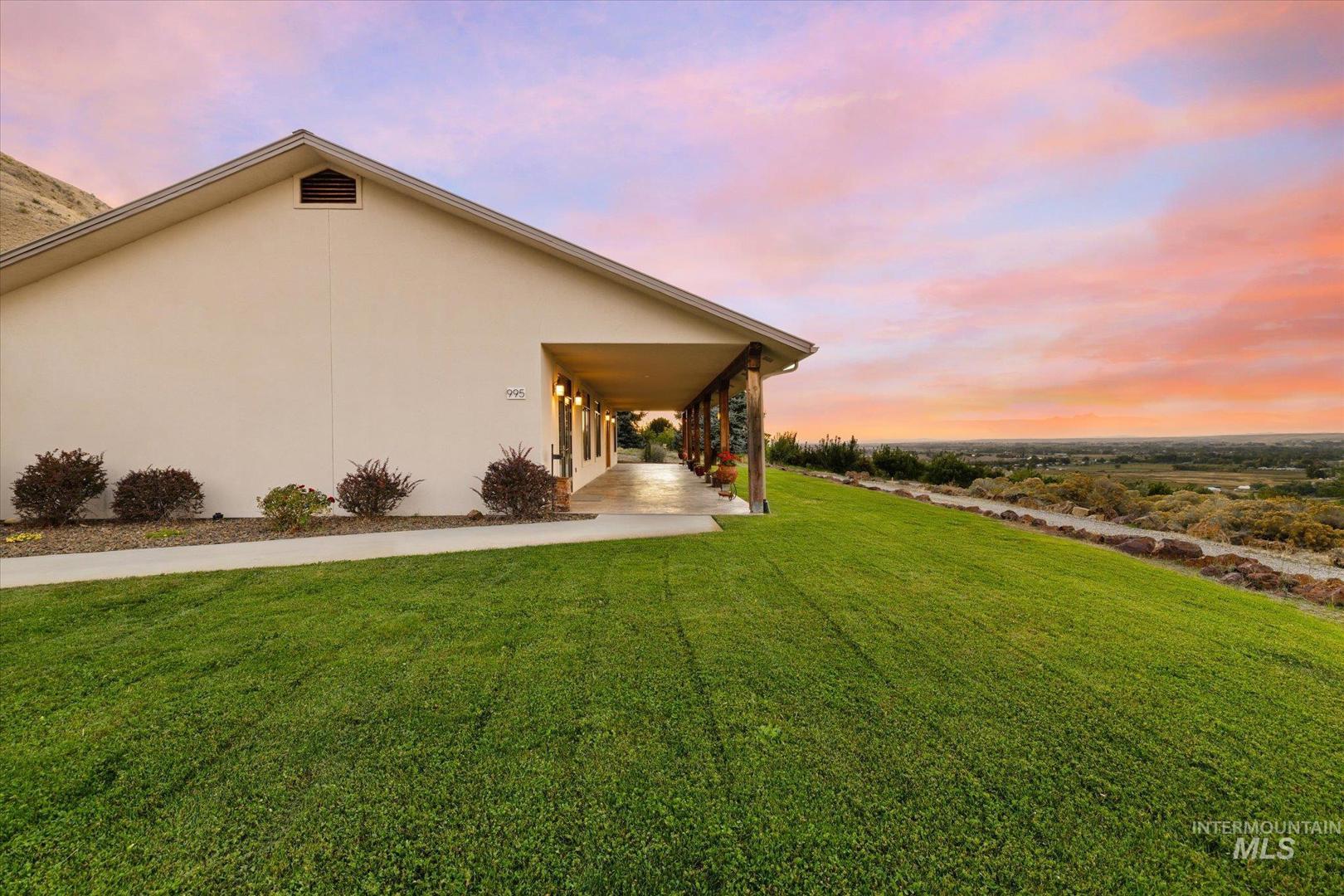 Incredible 5-acre view property on the South Slope offering panoramic mountain and valley views. This beautifully crafted 2,020 sqft custom home features 3 bedrooms, 2.5 bathrooms, & is filled w/ high-end finishes throughout. The gourmet kitchen is a chef’s dream w/ quartz countertops, built-in appliances, & custom cabinetry. A split-bedroom floor plan provides privacy & functionality, w/ soaring ceilings, solid core doors, & a wall of windows that bring in abundant natural light. The luxurious primary suite includes a spa-like bathroom w/ walk-in shower, Soaker tub, dual vanities, & an oversized walk-in closet. Two additional bedrooms are located on the opposite side of the home & share a full bathroom. The open-concept living area offers a cozy fireplace, built-in shelving, & custom front door that leads to a fully covered patio—perfect for relaxing or entertaining while taking in the incredible views. The north-facing front yard delivers exceptional privacy & some of the best scenery in the valley, while the fully fenced backyard provides additional space and seclusion. Ideal for RV owners, hobbyists, or extra storage, the property includes a massive 40x50 attached RV garage w/ three large roll-up doors, plus a 40x30 detached shop. Tucked away on a private drive alongside a apple orchard, this home offers unmatched tranquility. Please use the driveway closest to the apple orchard