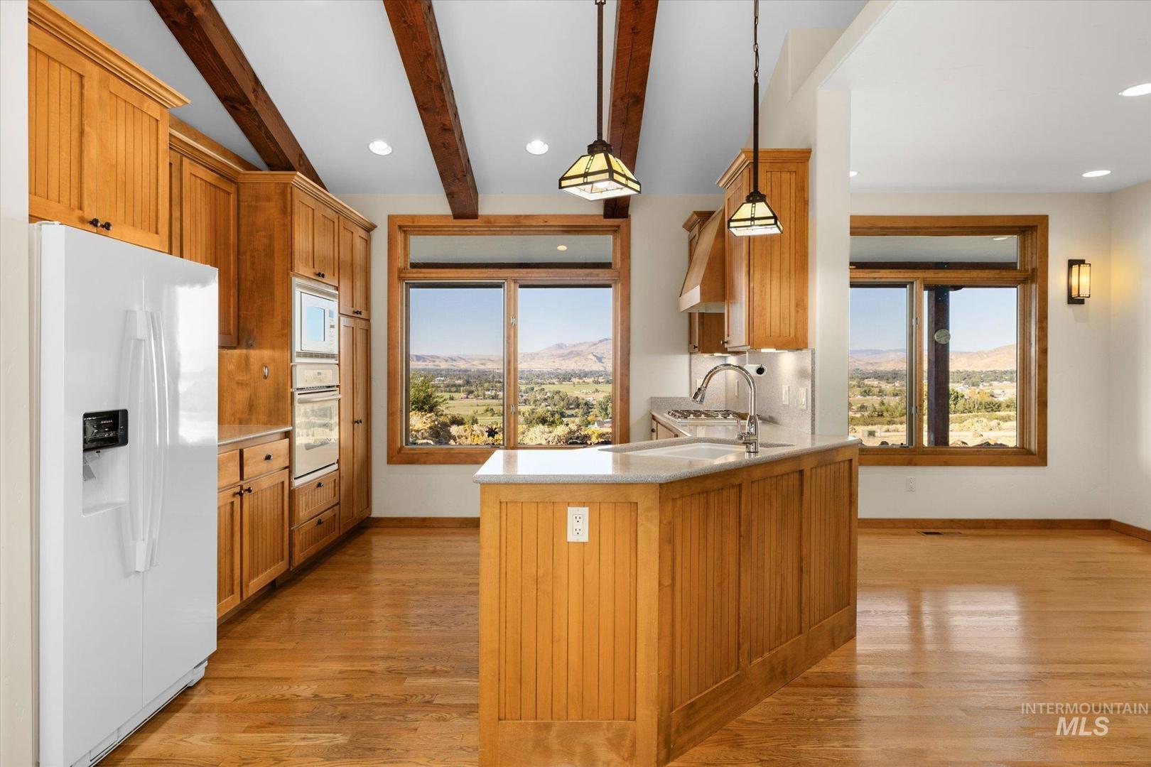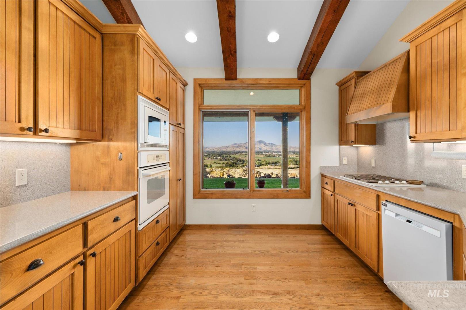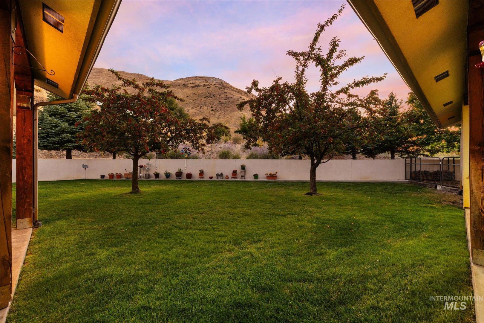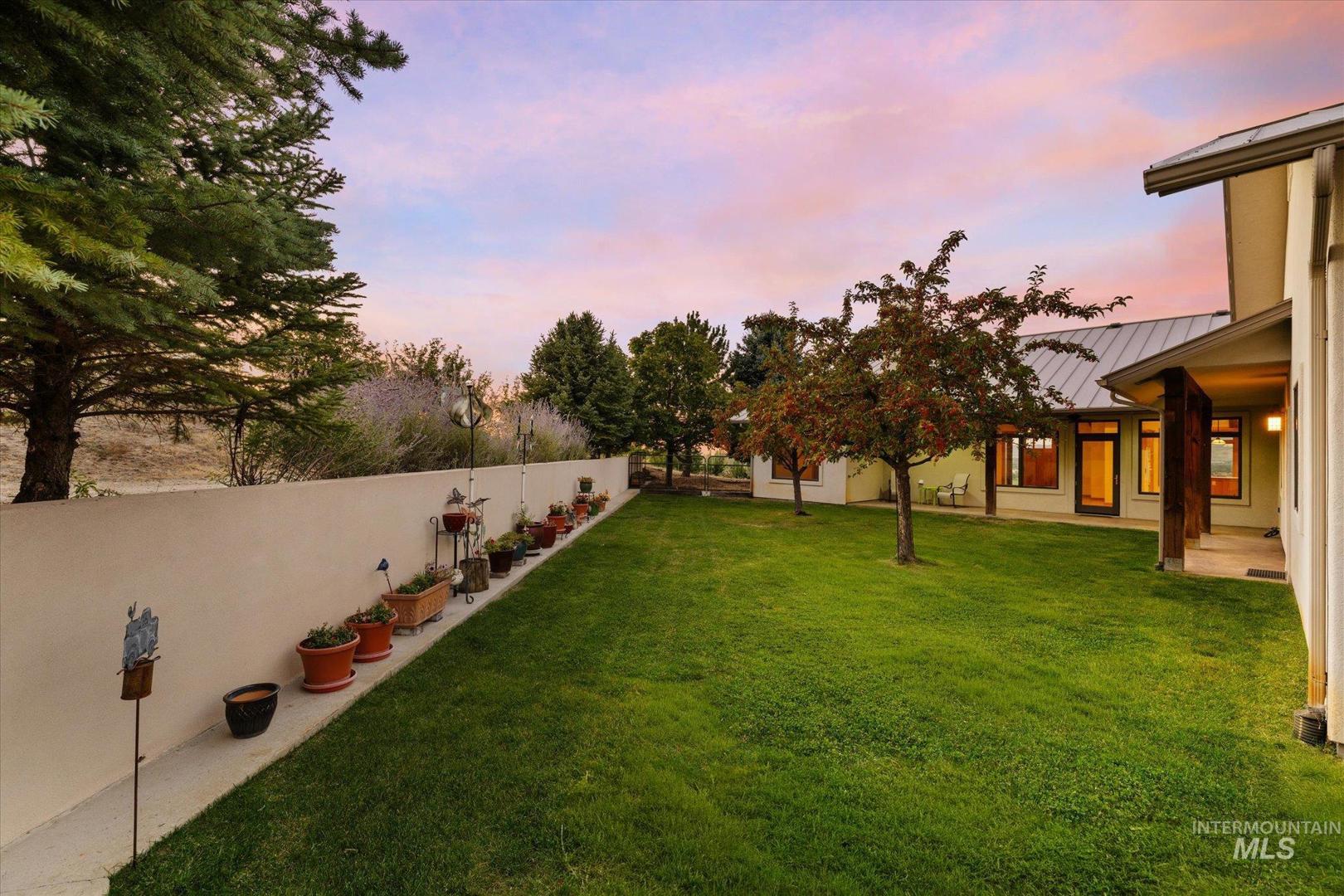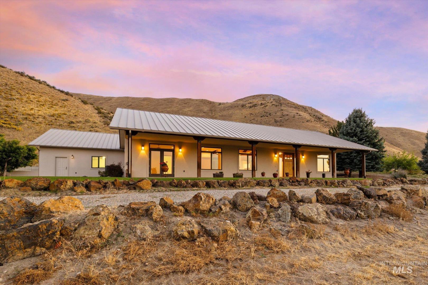 Incredible 5-acre view property on the South Slope offering panoramic mountain and valley views. This beautifully crafted 2,020 sqft custom home features 3 bedrooms, 2.5 bathrooms, & is filled w/ high-end finishes throughout. The gourmet kitchen is a chef’s dream w/ quartz countertops, built-in appliances, & custom cabinetry. A split-bedroom floor plan provides privacy & functionality, w/ soaring ceilings, solid core doors, & a wall of windows that bring in abundant natural light. The luxurious primary suite includes a spa-like bathroom w/ walk-in shower, Soaker tub, dual vanities, & an oversized walk-in closet. Two additional bedrooms are located on the opposite side of the home & share a full bathroom. The open-concept living area offers a cozy fireplace, built-in shelving, & custom front door that leads to a fully covered patio—perfect for relaxing or entertaining while taking in the incredible views. The north-facing front yard delivers exceptional privacy & some of the best scenery in the valley, while the fully fenced backyard provides additional space and seclusion. Ideal for RV owners, hobbyists, or extra storage, the property includes a massive 40x50 attached RV garage w/ three large roll-up doors, plus a 40x30 detached shop. Tucked away on a private drive alongside a apple orchard, this home offers unmatched tranquility. Please use the driveway closest to the apple orchard