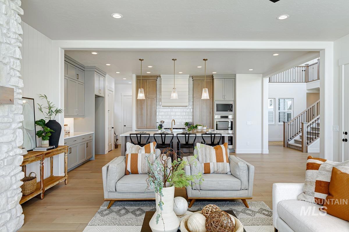 3.49% interest rate with a 3-2-1 buydown on select move-in ready homes. This Highland home with a 4-car garage offers both functional design and bold architectural features at every turn. The chef’s kitchen enjoys an oversized island that flows seamlessly into the spacious great room—an ideal setting for entertaining. A wraparound covered patio extends the living space outdoors. At the heart of the home, a dramatic staircase framed by massive windows connects both levels and anchors the open-concept layout. Upstairs, a loft and bridge-style hallway overlook the great room below, adding depth and dimension. The generous primary suite captures views from both the bedroom and bathroom, while a main-level guest ensuite with walk-in closet offers comfort and privacy for visitors or multigenerational living. Now open, the Dry Creek Ranch Community Clubhouse spans five manicured acres, featuring courts, a pool, and an 8,840 sqft. clubhouse with state-of-the-art amenities. Home is ready now.