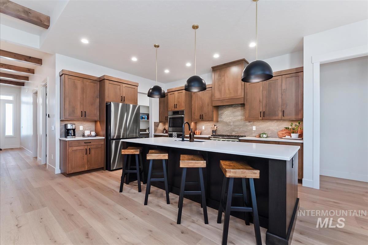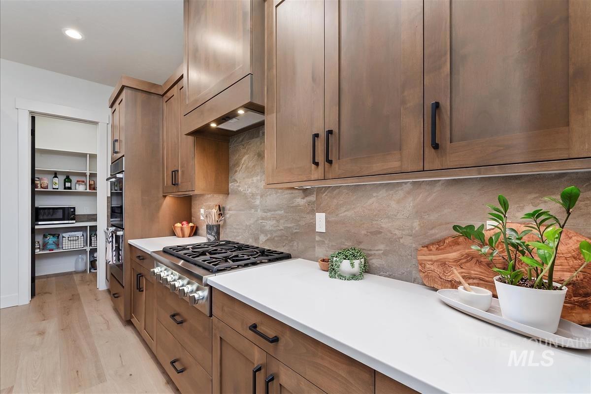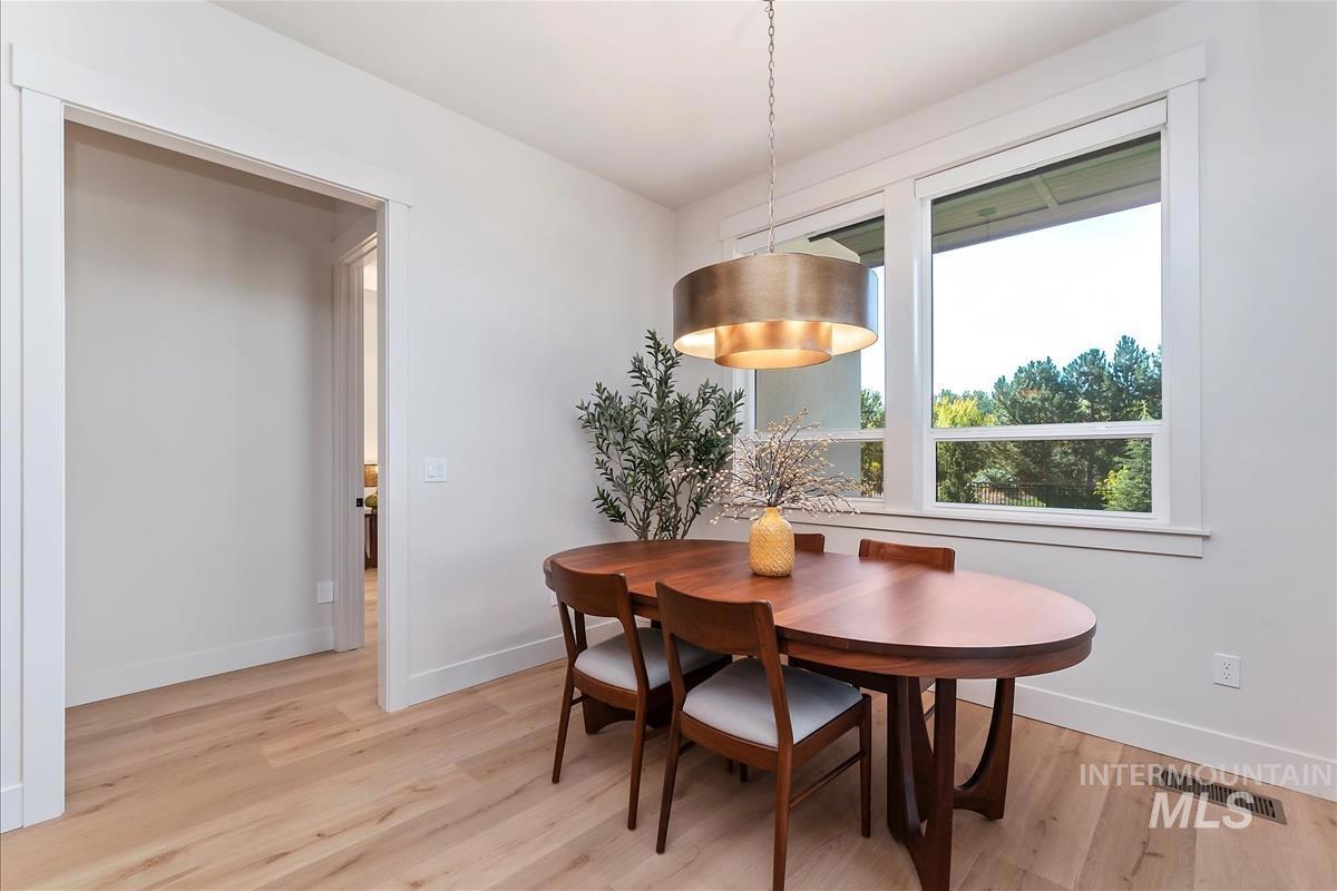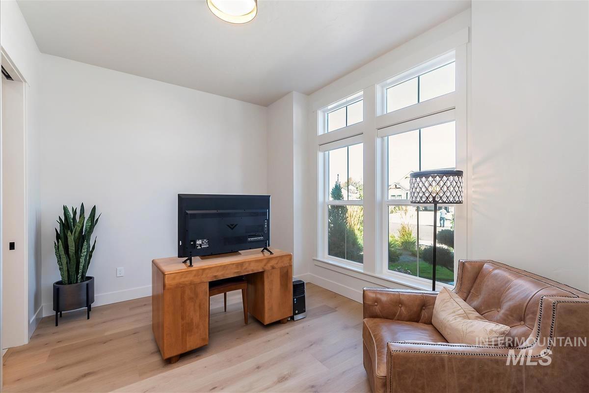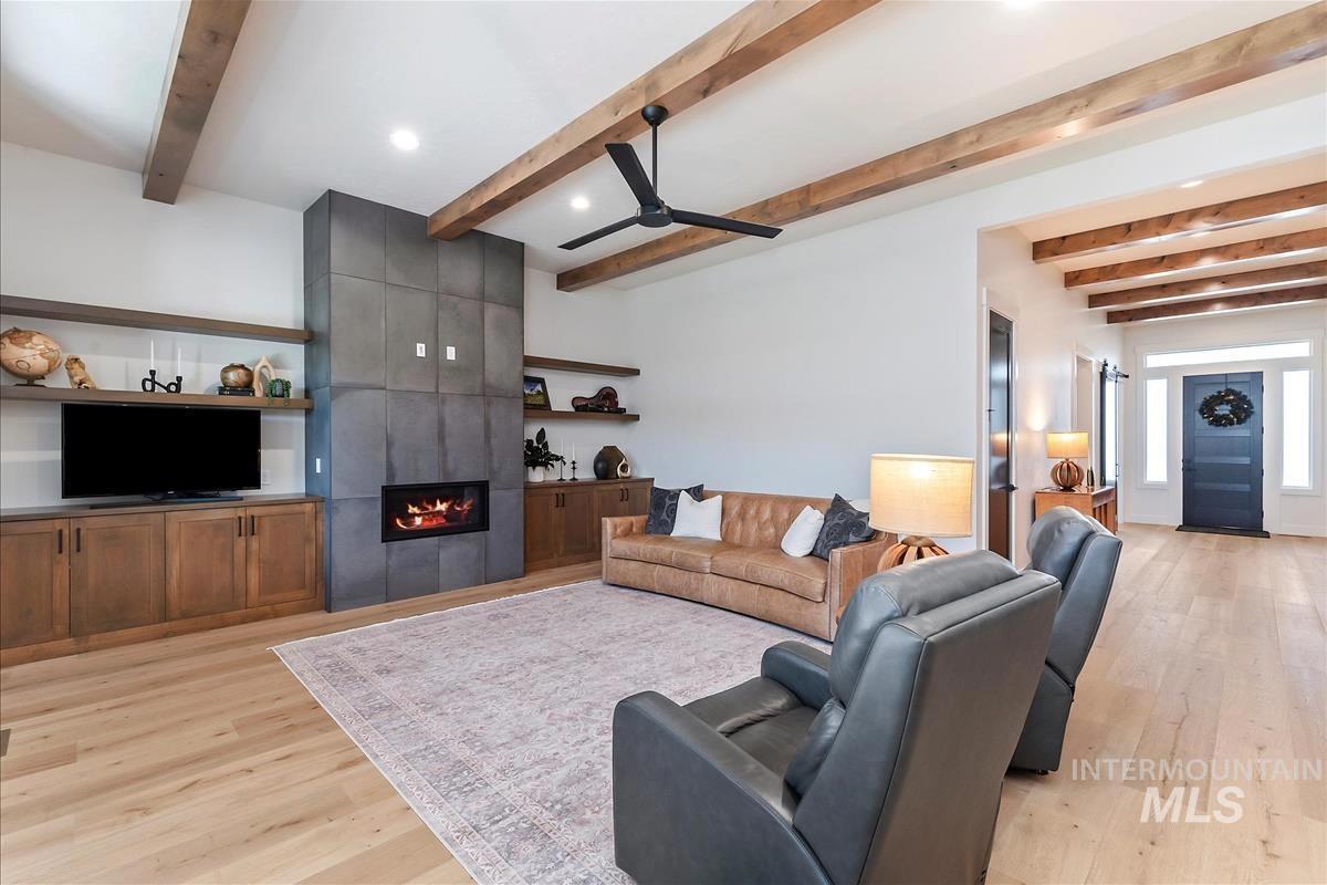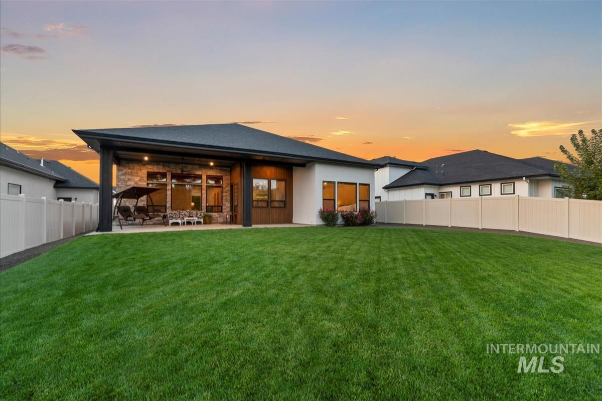 The home you’ve been dreaming about! The massive covered patio overlooks mature trees & open space – it feels like you’re looking at a forest! No back neighbors means peaceful living in your backyard! This home blends thoughtful design & loads of quality upgrades! Window tinting added to all South-facing windows. Floor outlets add convenience in Great Room & front bedroom/office. Extra soffit outlets for Christmas lights & gas stub for patio ceiling heaters. CAT5 data ports installed in the Great Room, laundry/office, primary & front bedroom. The entryway & garage benefit from privacy obscure glass. Luxury LVP extends through the main living spaces & large mudbench off the garage entry. Upgraded wood cabinet boxes with soft close doors/drawers, quartz countertops, double ovens, built-in gas cooktop & oversized pantry with countertop & extra outlets. A barn door enhances the usability of the front bedroom, creating flexibility for work or guests. Every detail in this home balance everyday function with elevated finishes.